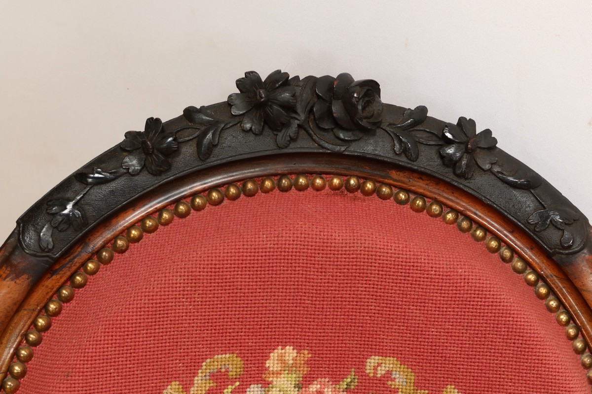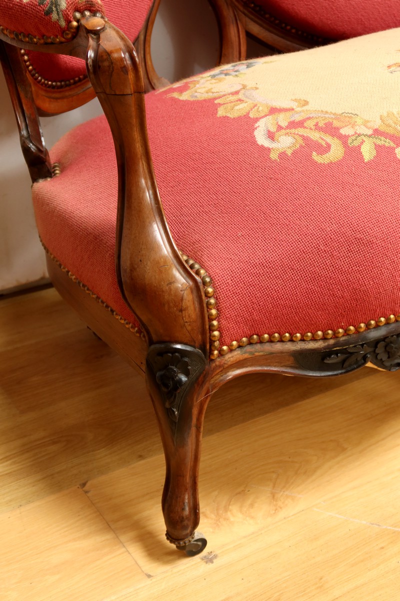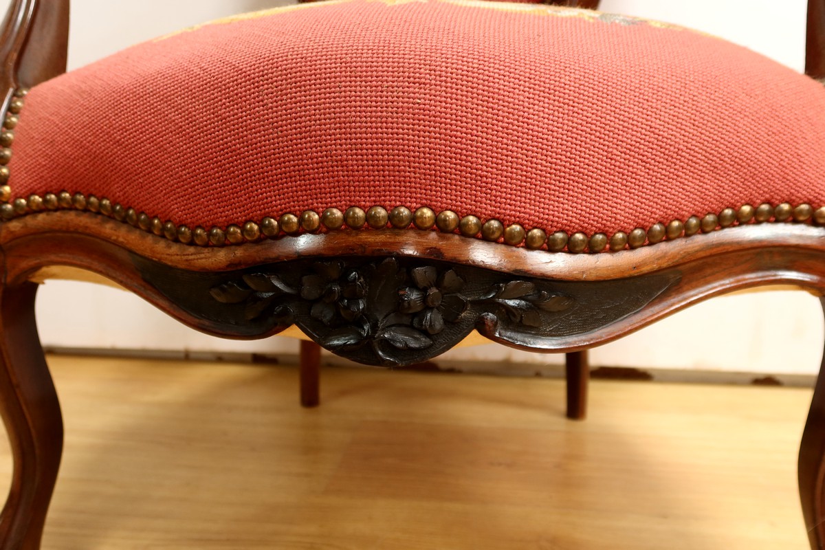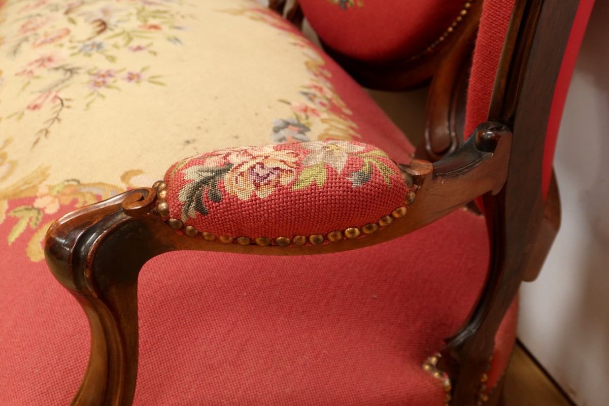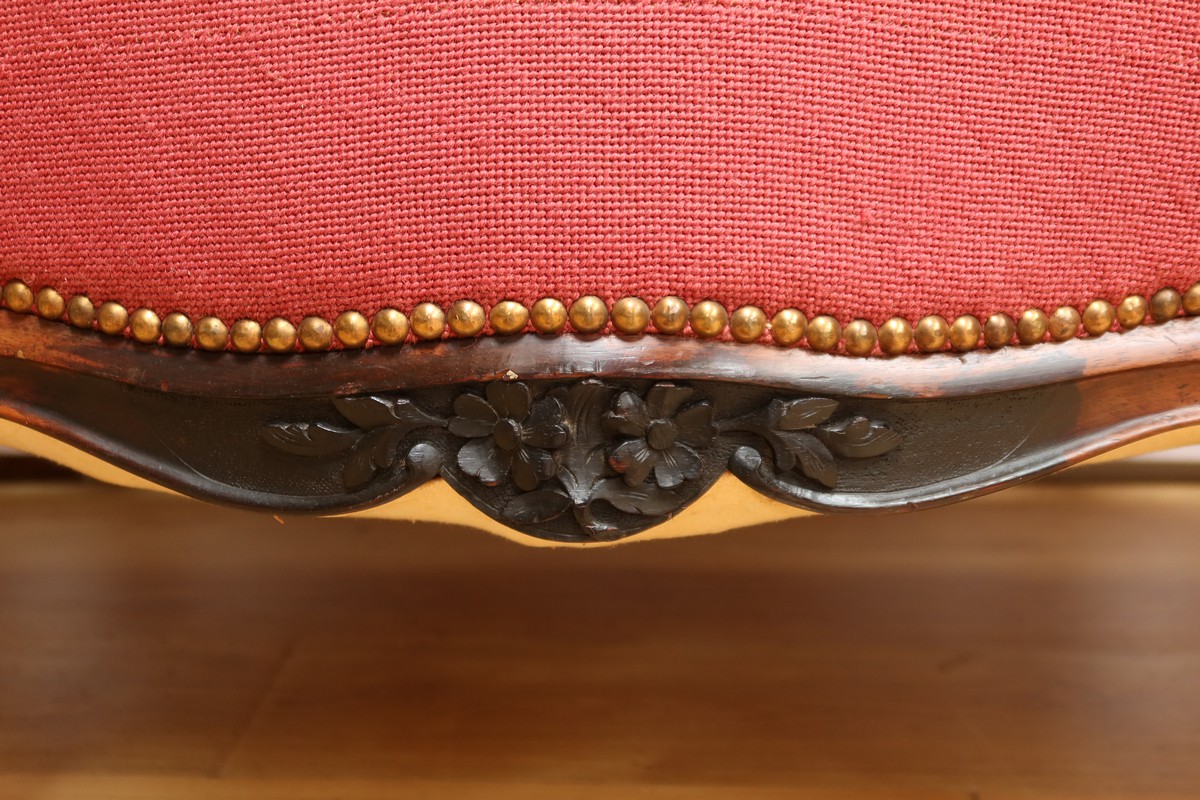 Les assises traditionnelles des fauteuils, chaises et du canapé sont recouvertes d’un tissu rosé brodé au crochet avec motifs fleuri en cartouche, fixé à l’aide de clous couleur bronze, ajoutant une touche de raffinement à l’ensemble.