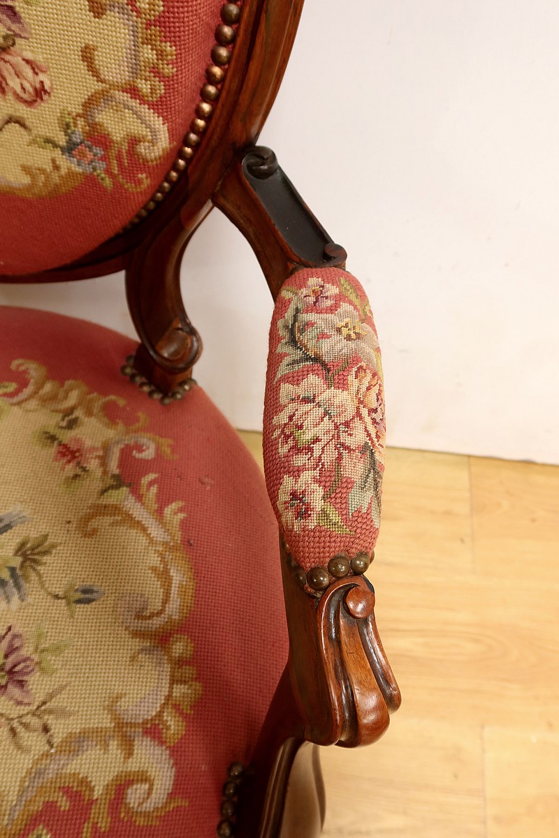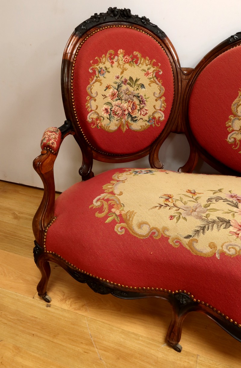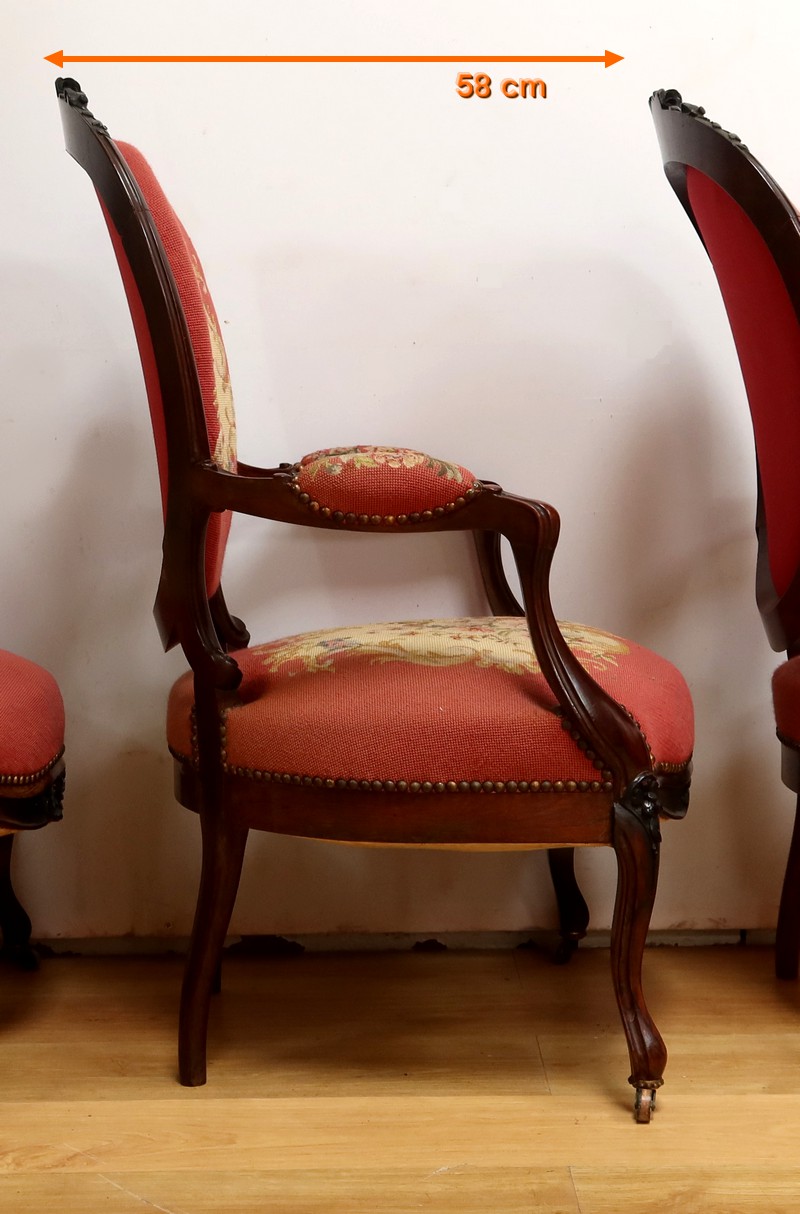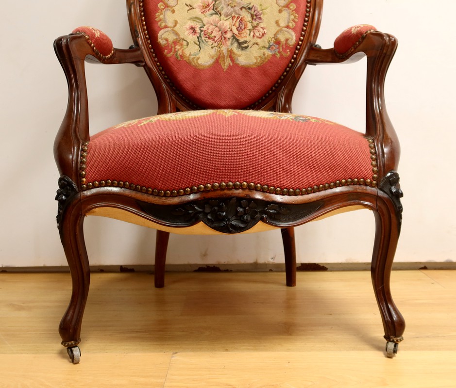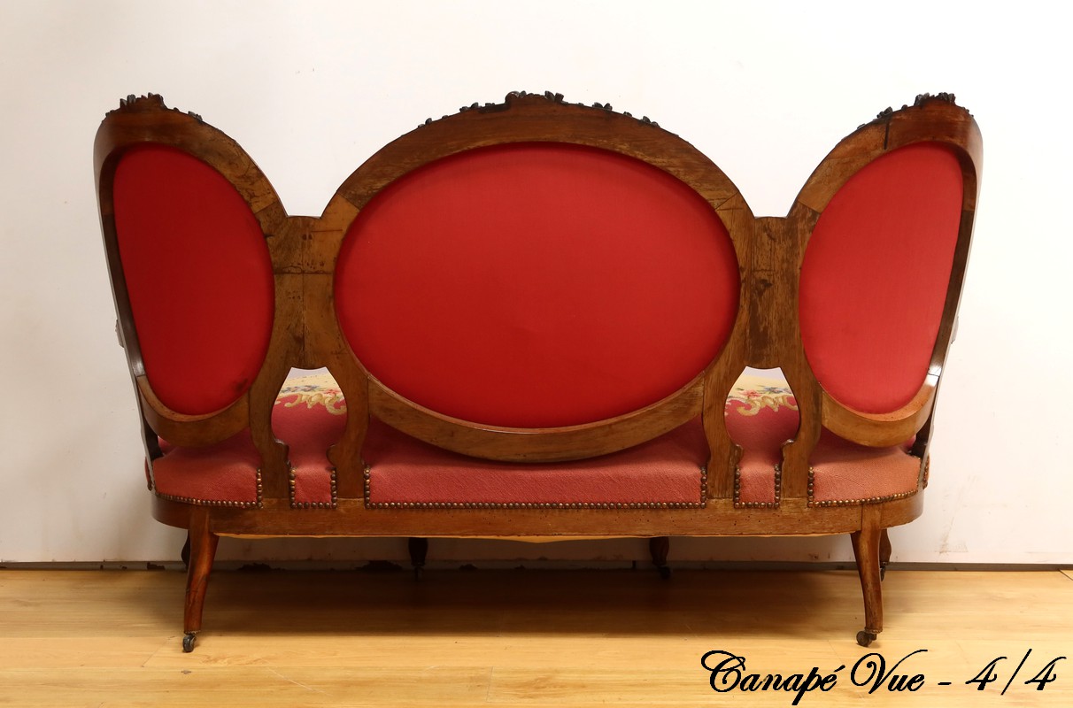 Les assises traditionnelles des fauteuils, chaises et du canapé sont recouvertes d’un tissu rosé brodé au crochet avec motifs fleuri en cartouche, fixé à l’aide de clous couleur bronze, ajoutant une touche de raffinement à l’ensemble.