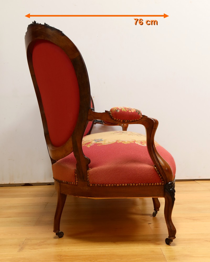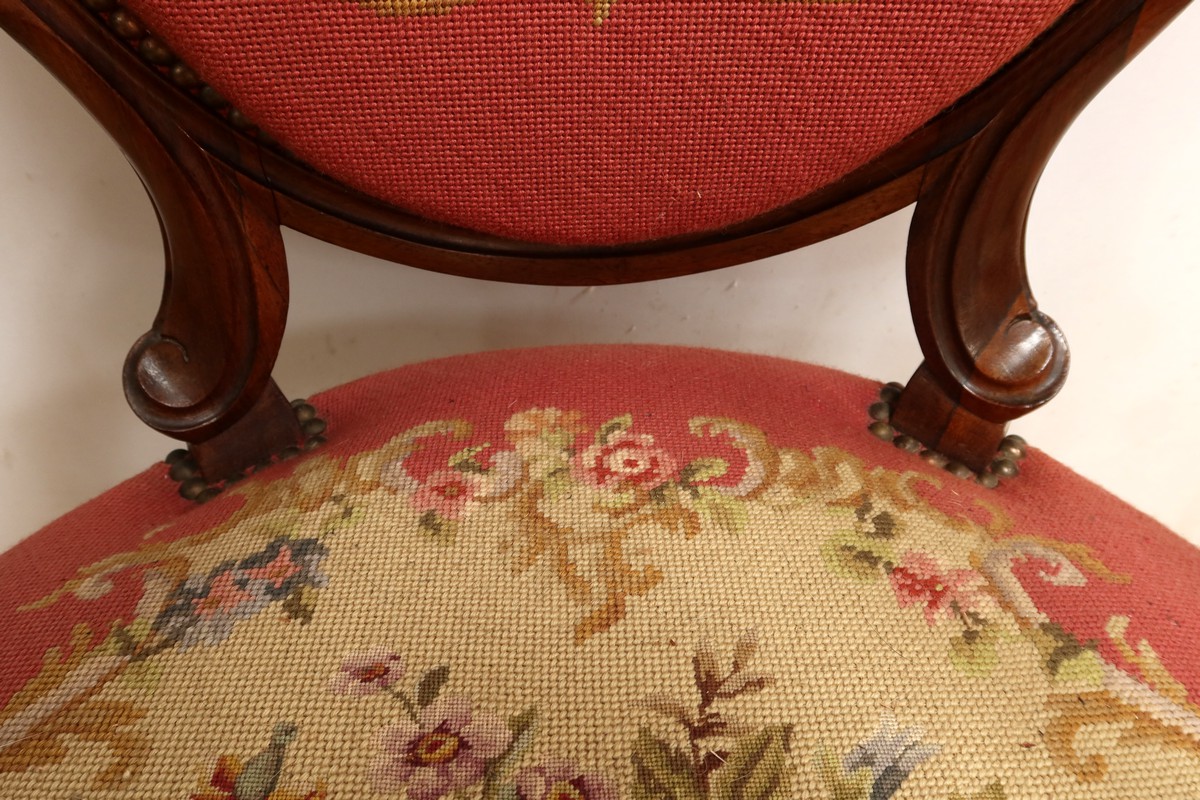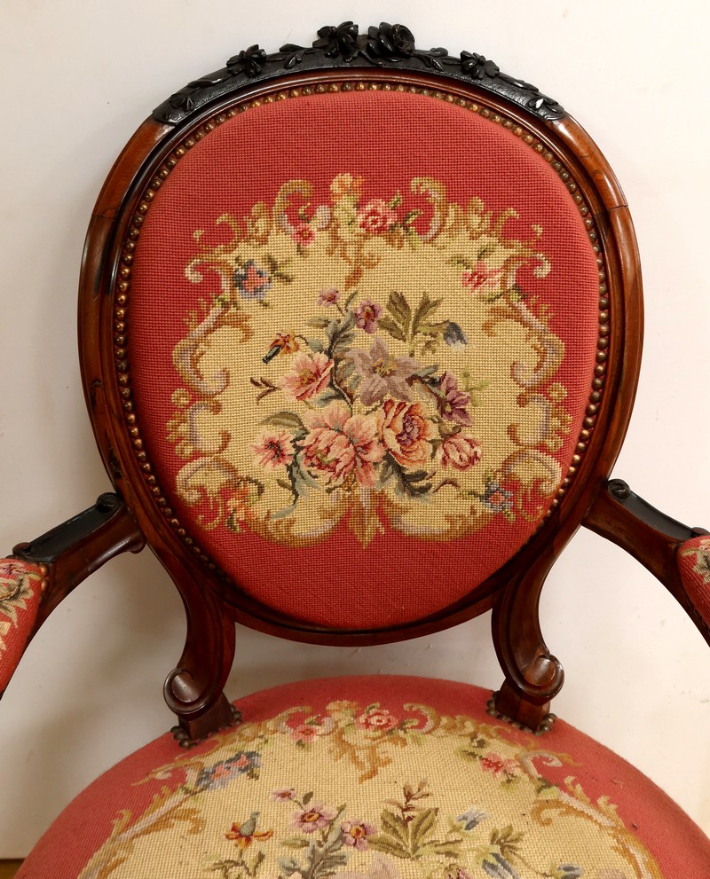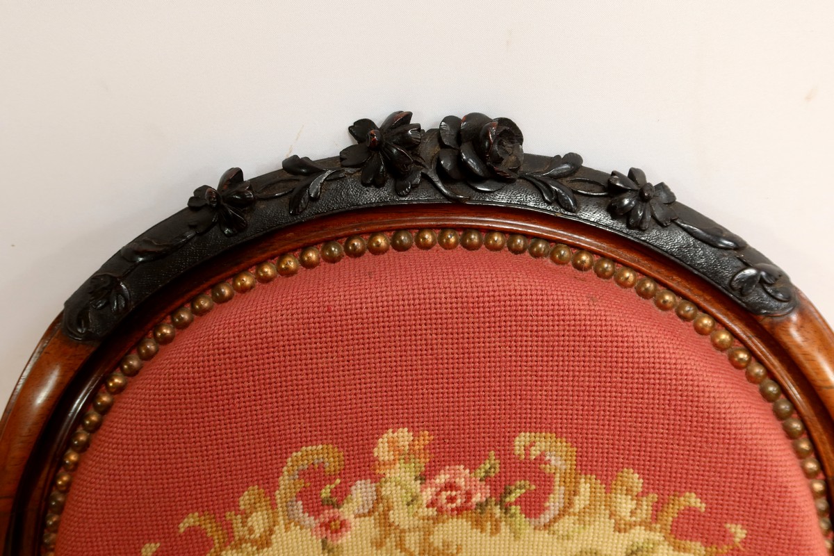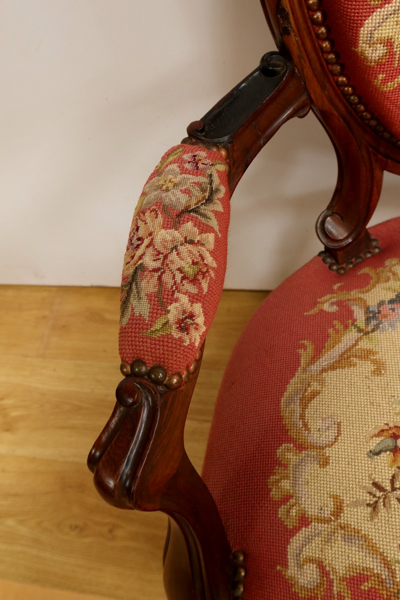 Les assises traditionnelles des fauteuils, chaises et du canapé sont recouvertes d’un tissu rosé brodé au crochet avec motifs fleuri en cartouche, fixé à l’aide de clous couleur bronze, ajoutant une touche de raffinement à l’ensemble.