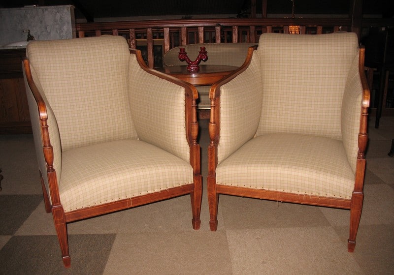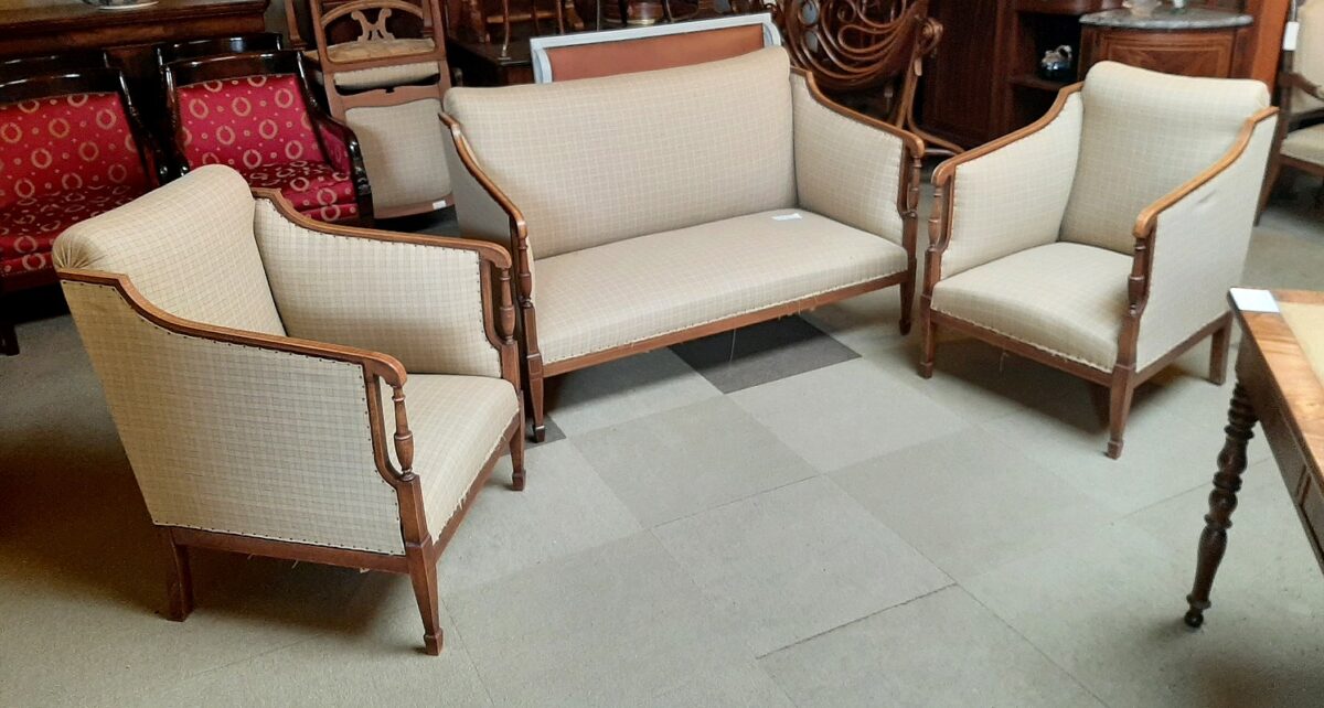 Ravissant Salon Anglais en Acajou et hêtre, composé de 3 pièces (2 fauteuils et 1 canapé) Époque 1920.
