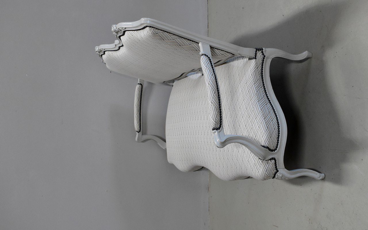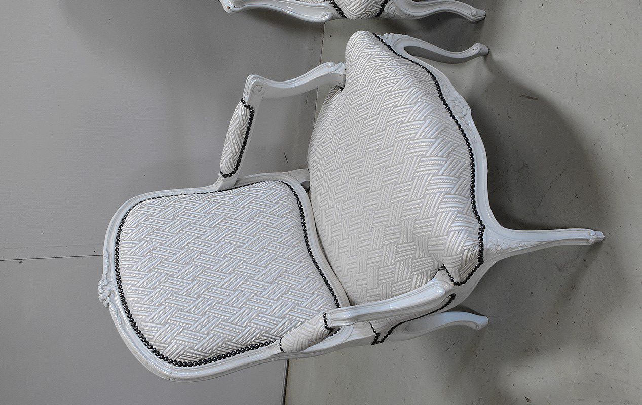 Très élégant salon de style Louis XV composé d’un canapé à 6 pieds et de ses deux fauteuils assortis en Hêtre peint d’un blanc-gris rechampi.