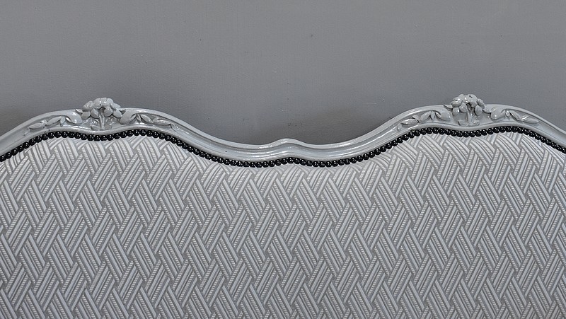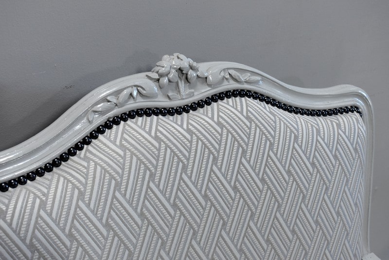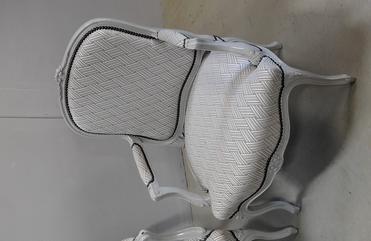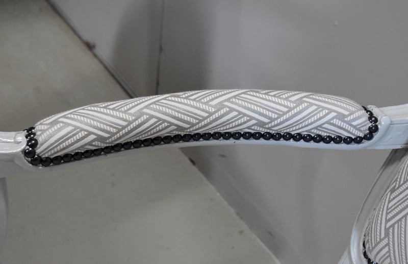 Les dossiers et assises équerrées ont été entièrement refaits à l’ancienne, avec sangles, ressorts et crin animal, de même que la toile et le tissu de finition ‘Vacoa’ de Chez Lelièvre encadré de clous noirs.