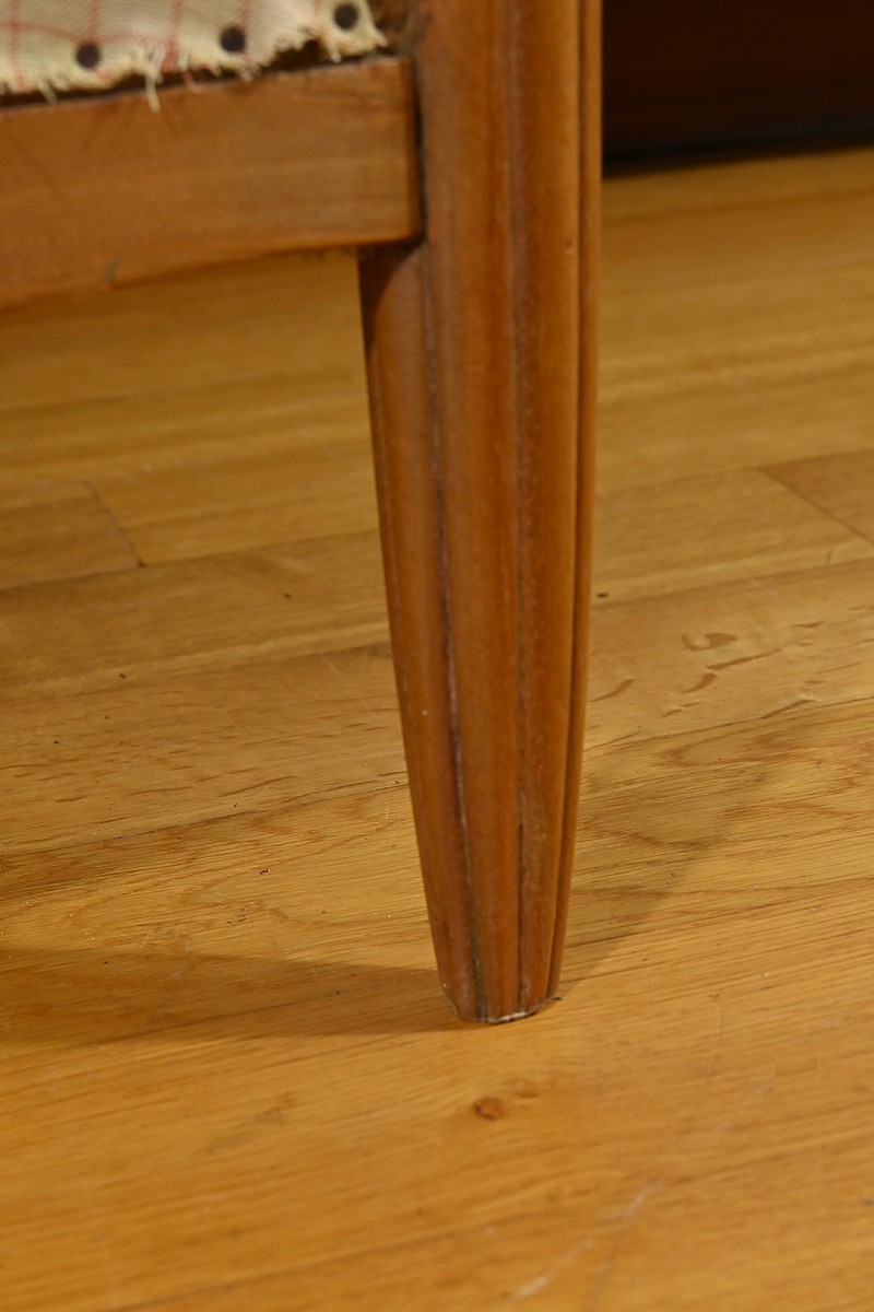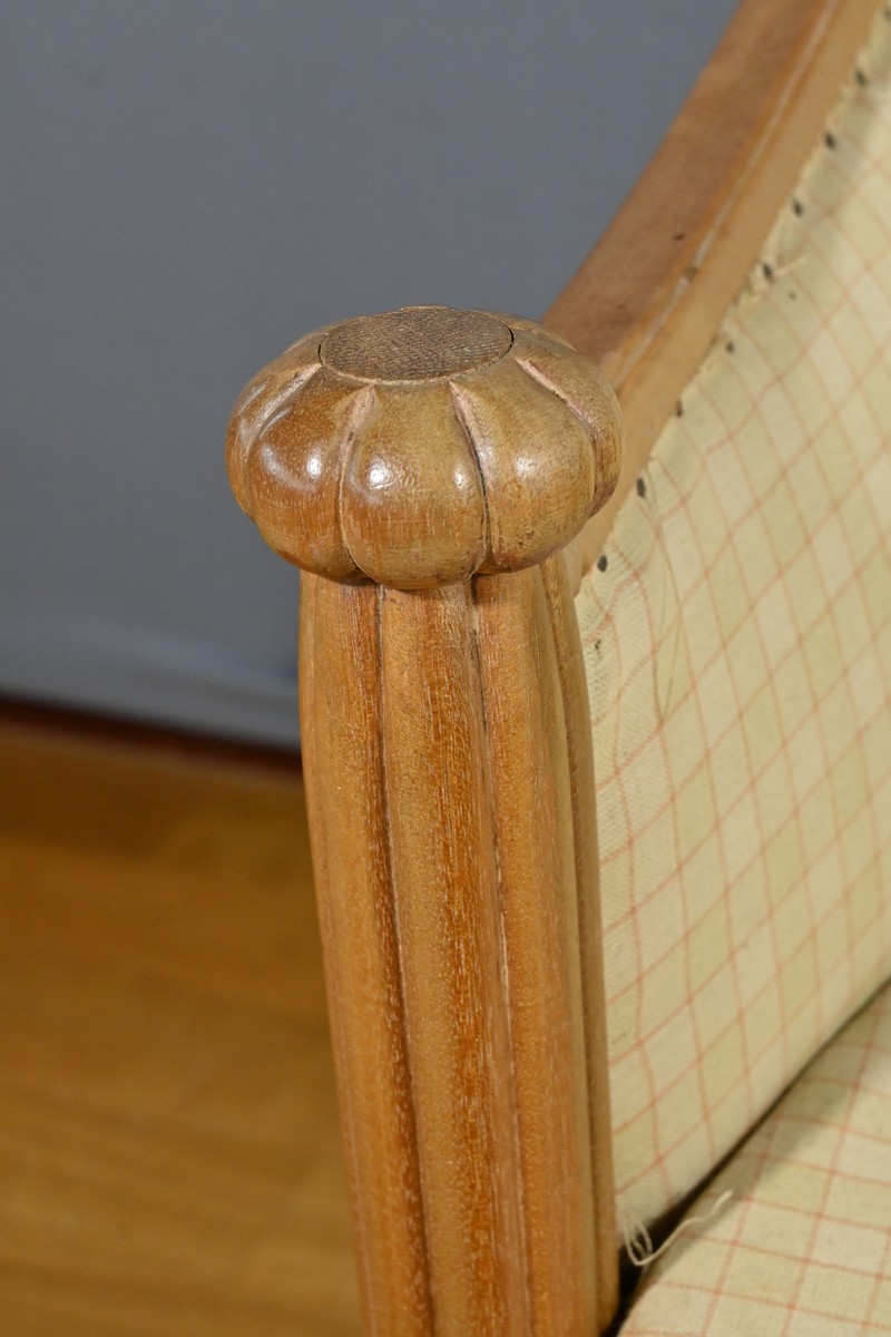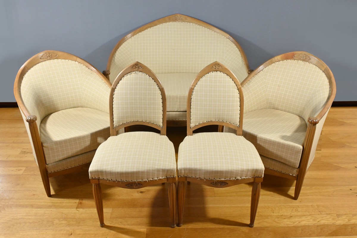 Le canapé, les fauteuils et les chaises sont habillés d’un tissu d’apprêt en parfait état, offrant la possibilité de personnaliser cet ensemble selon les goûts et les préférences de chacun.