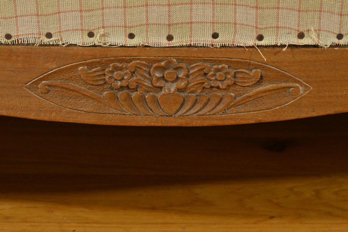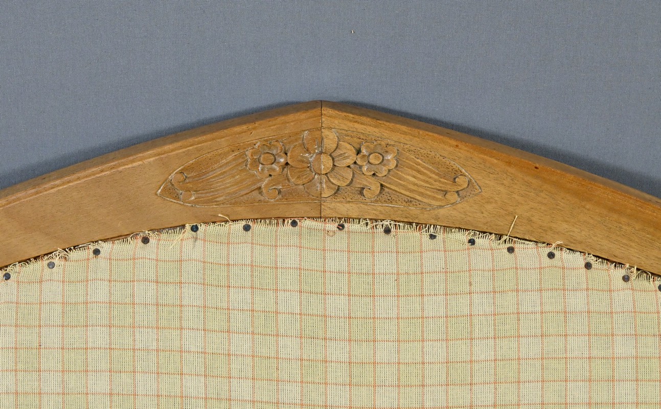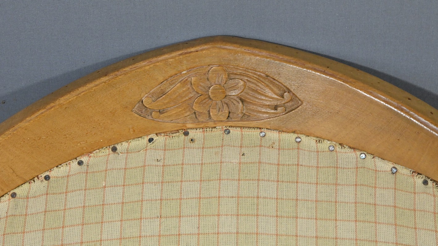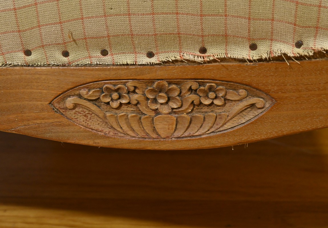 Composé d’une banquette, de deux fauteuils et de deux chaises, chaque élément de cet ensemble est agrémenté de sculptures de fleurs sur les dossiers et de vases fleuris sur les traverses, ajoutant une touche artistique et raffinée.