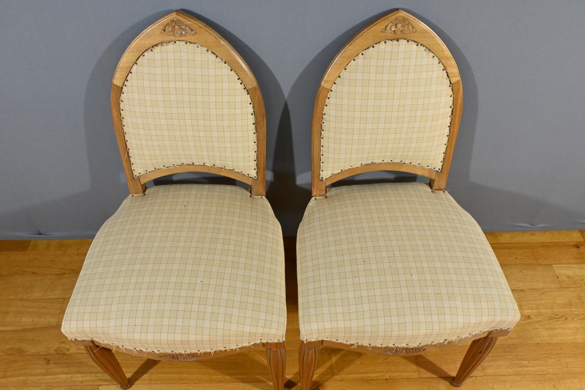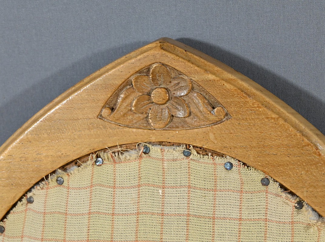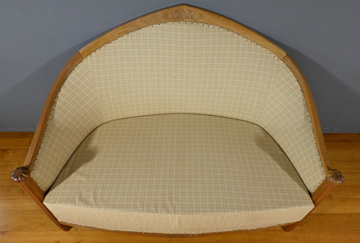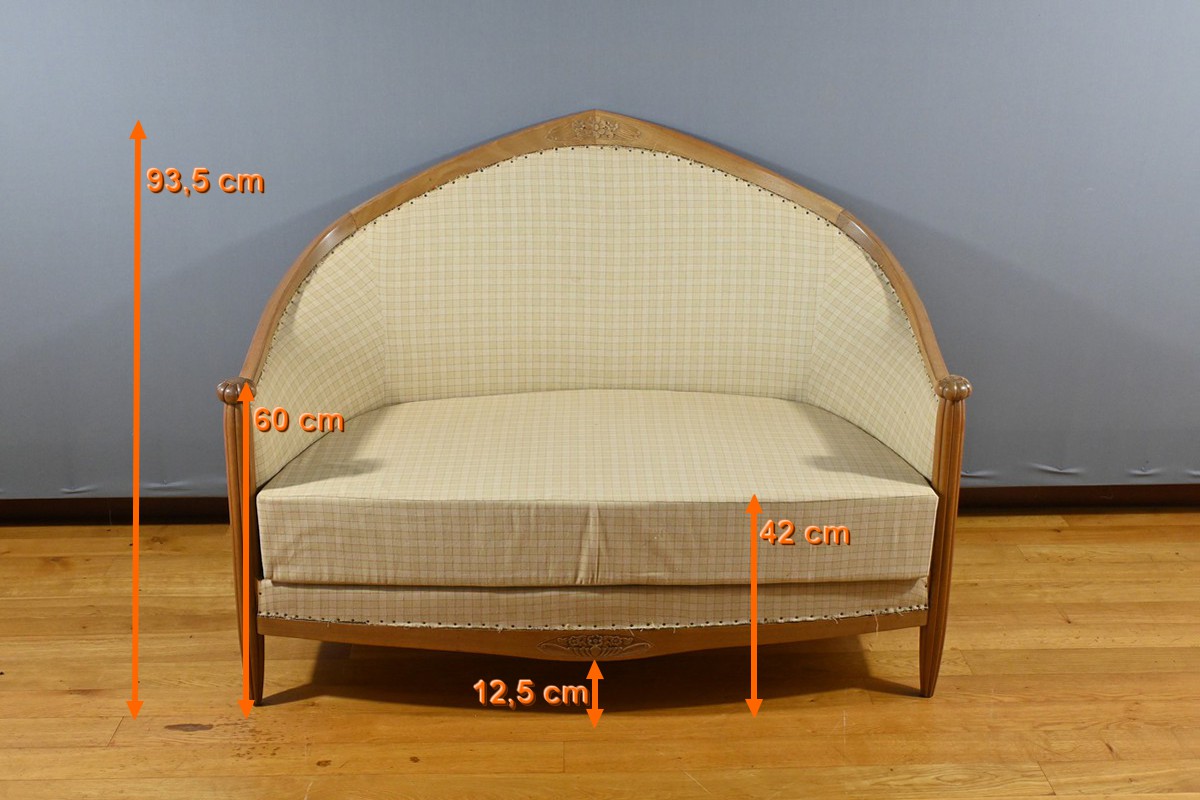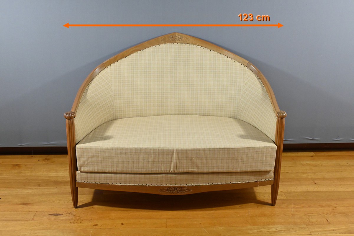 Composé d’une banquette, de deux fauteuils et de deux chaises, chaque élément de cet ensemble est agrémenté de sculptures de fleurs sur les dossiers et de vases fleuris sur les traverses, ajoutant une touche artistique et raffinée.