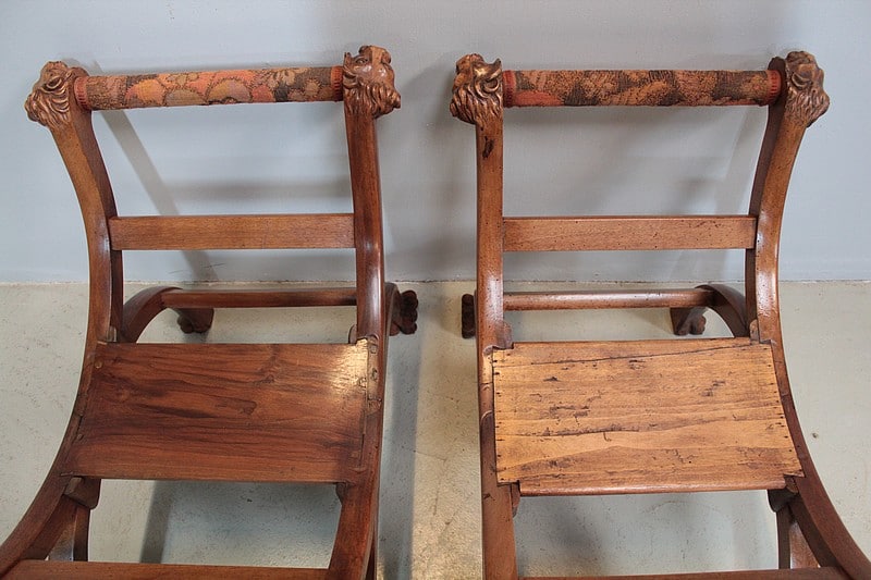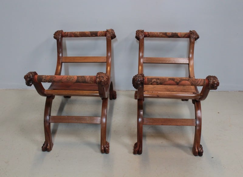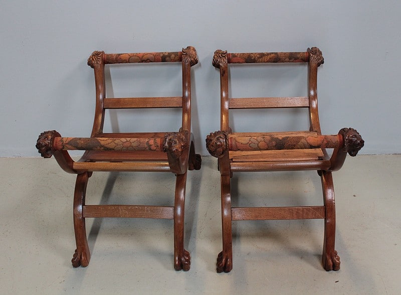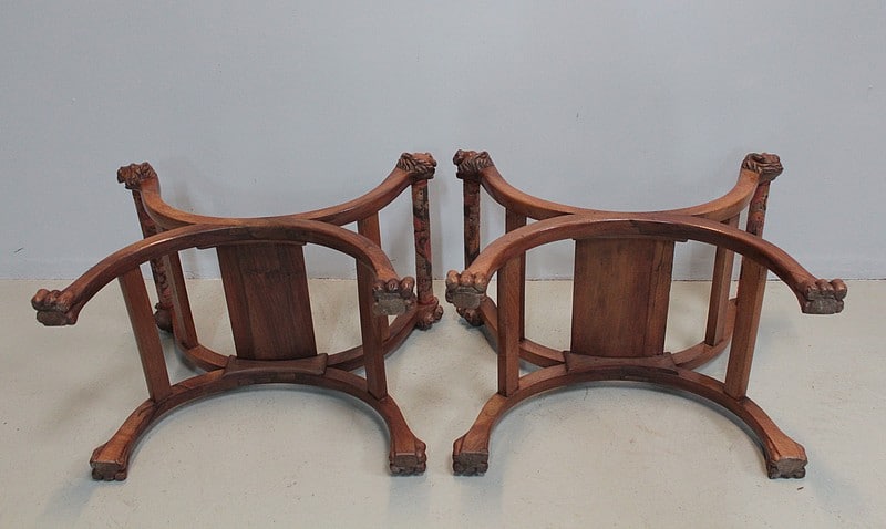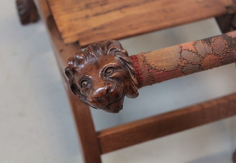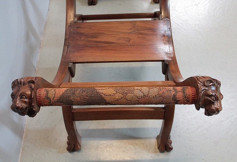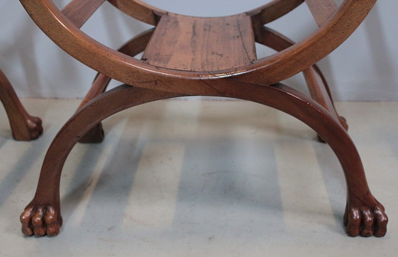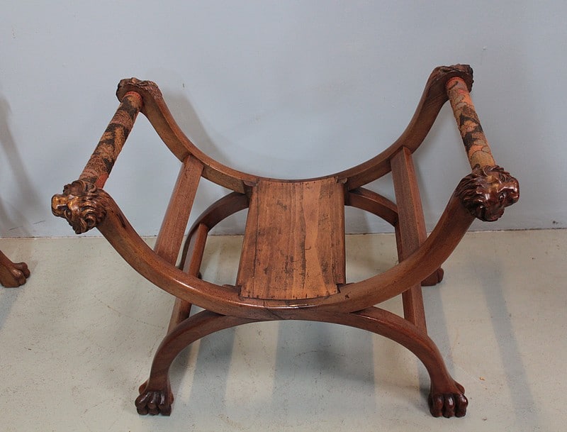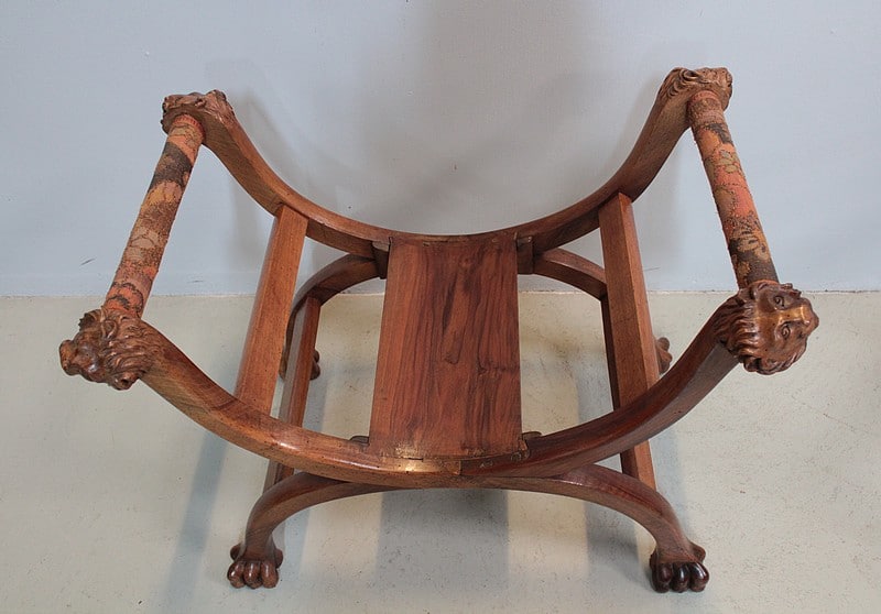 Piètement en X reposant par des griffes. Accotoirs sculptés de 4 masques de lions.