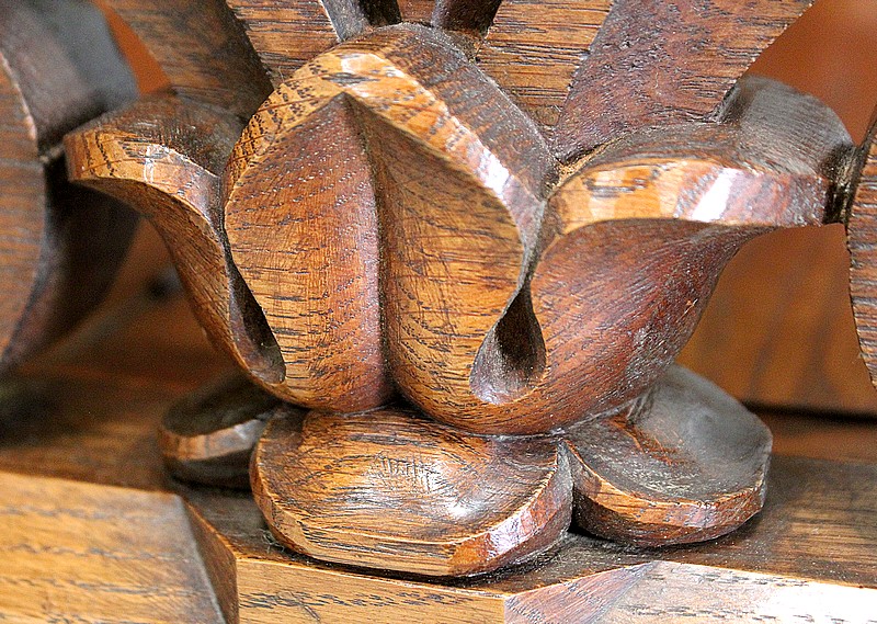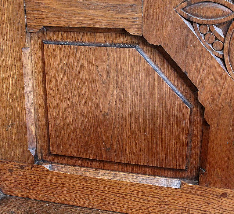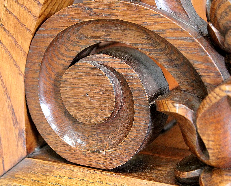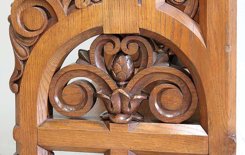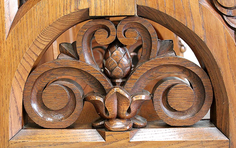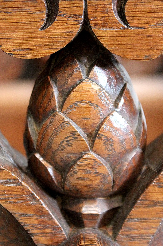 Les Côtés sont Richement ajourés de Feuilles d’Acanthes, d’Enroulements et de Volutes ouvragées, enserrant Fleurs Religieuses et Pommes de Pins, symbole utilisé par la papauté pour illustrer le trait d’union entre la Terre et le Ciel, la chair et le spirituel.