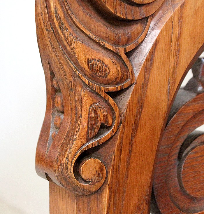 Les accotoirs de ce Siège, à la forme peu commune, se garnissent de Généreuses frises Festonnées en Lys.