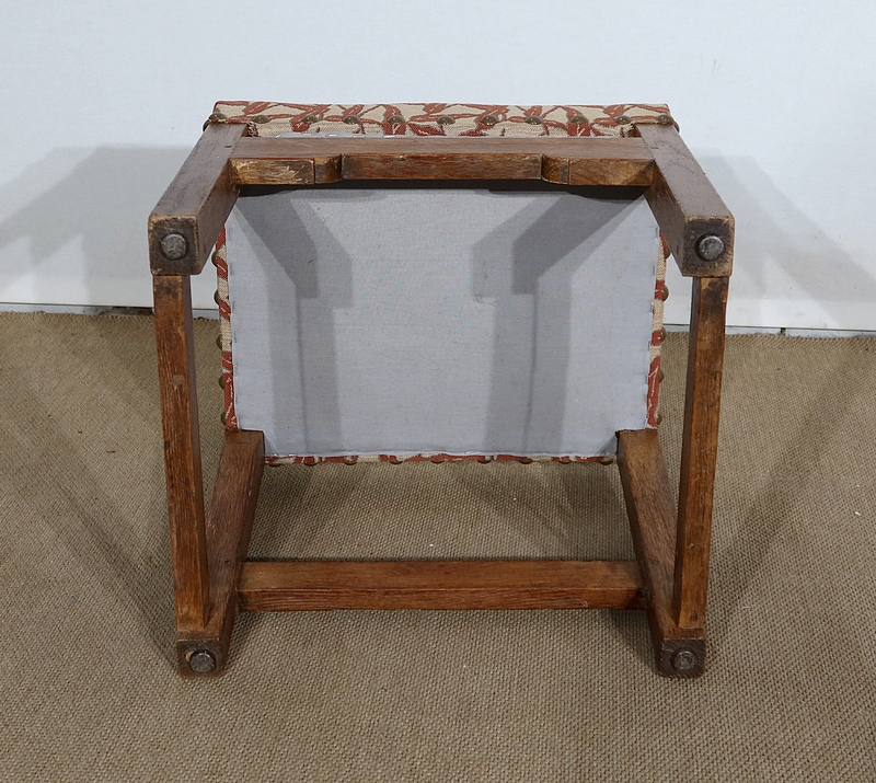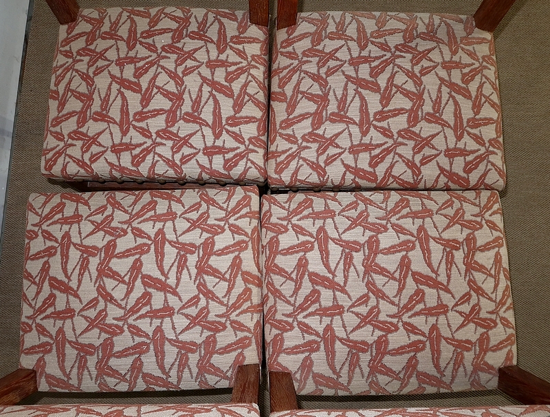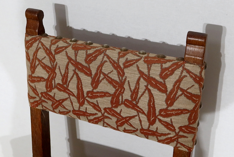 Chaque siège est pourvu d’une assise habillée d’un tissu gris clair agrémenté de feuillages lie de vin, avec des gros clous en laiton vieilli.