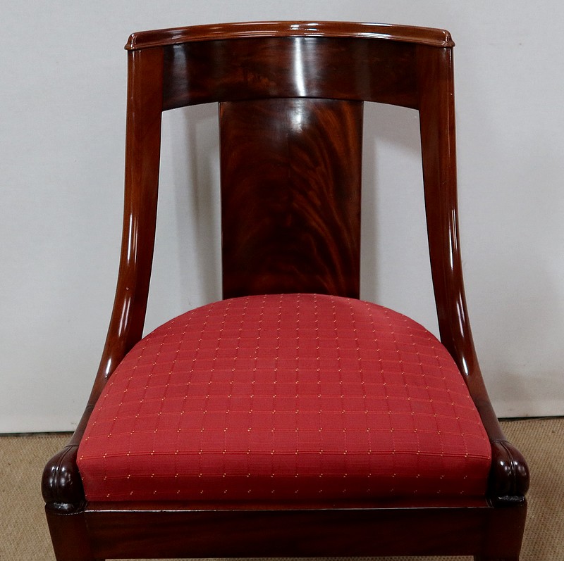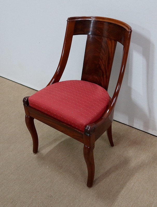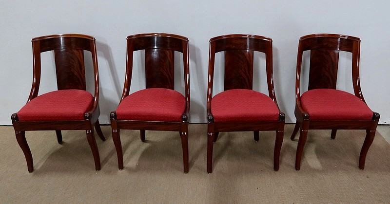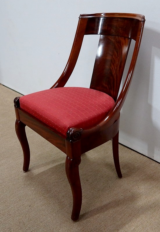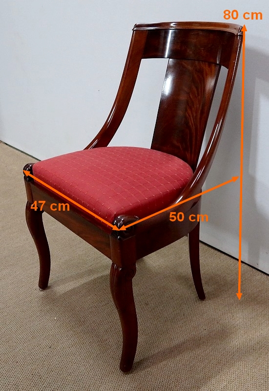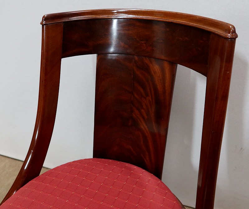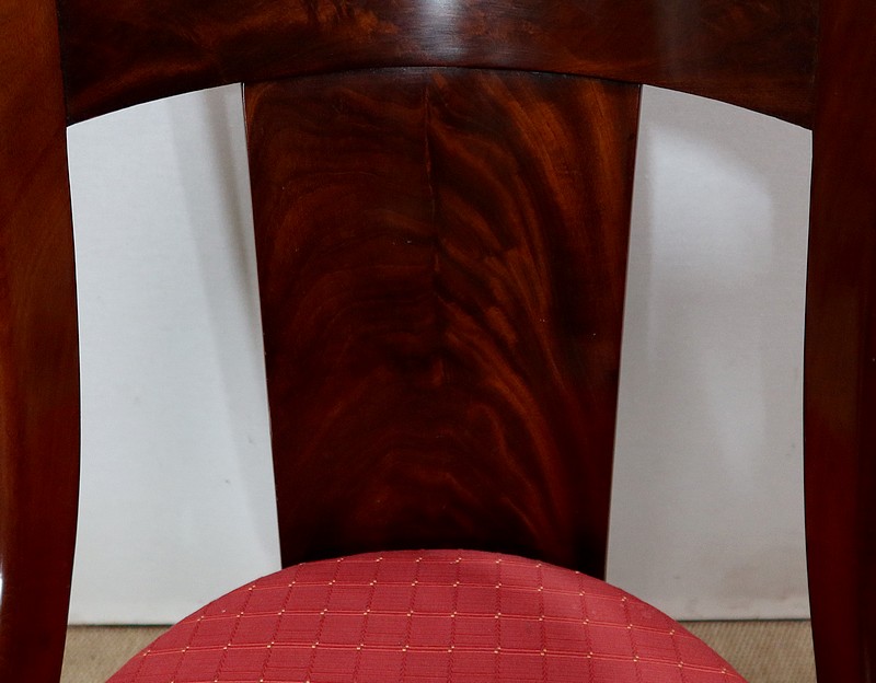 Suite de chaises Restauration en Acajou massif et placage d’Acajou munies d’un dossier ajouré composé d’un élément central de faible épaisseur en placage de ronce d’acajou rejoignant une traverse haute incurvée de la même essence. Chaque côté du dossier en acajou massif rejoint la ceinture cintrée en se terminant par un motif en volute. Sur le dessus, nous retrouvons un élément de bois à double gorge épousant les courbes du dossier.