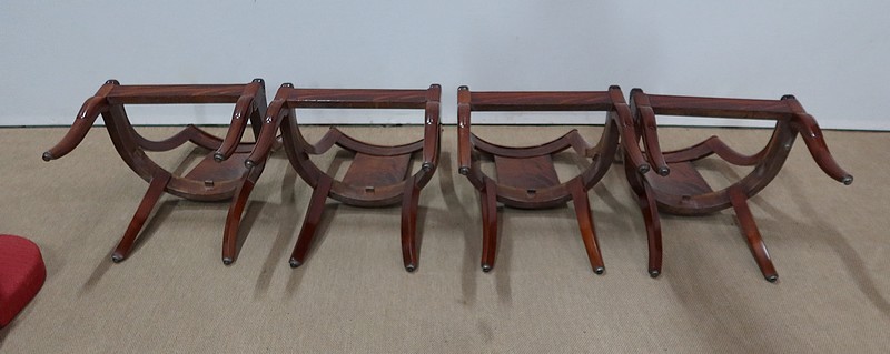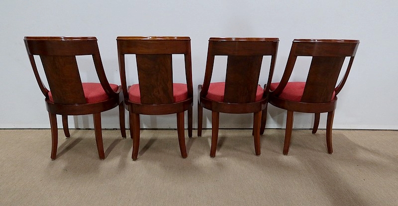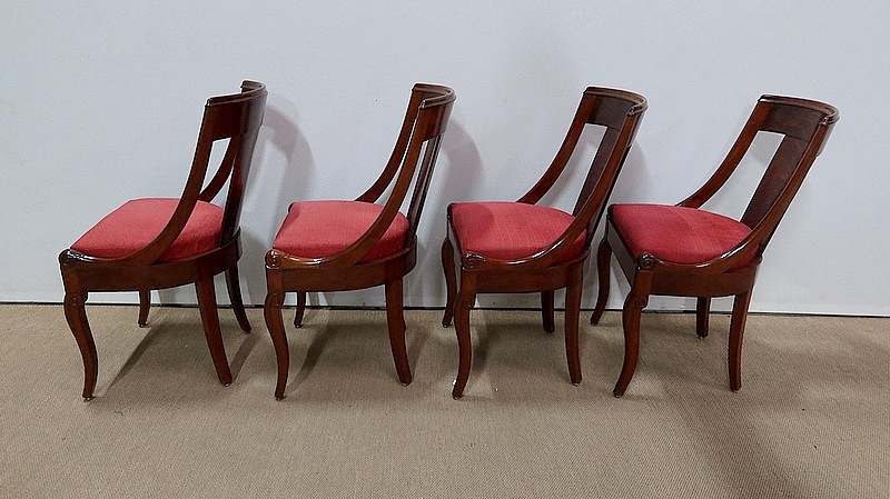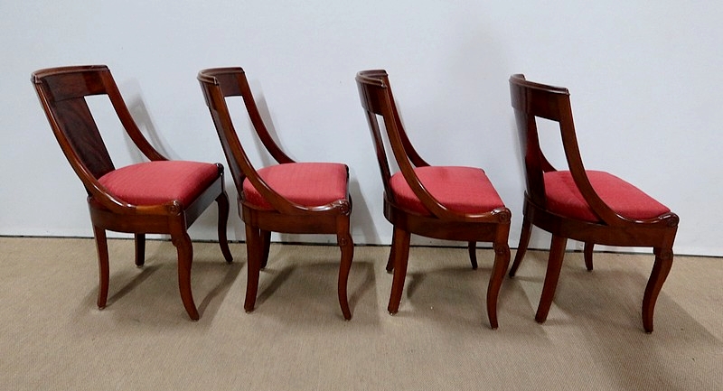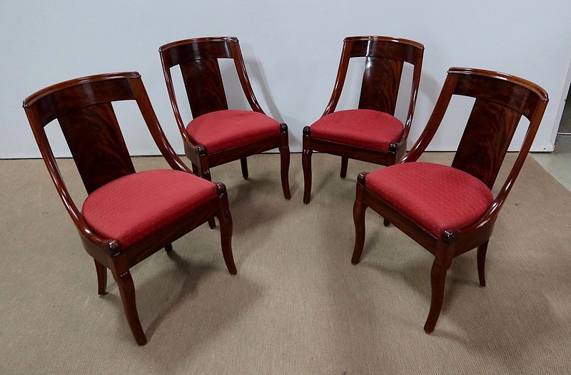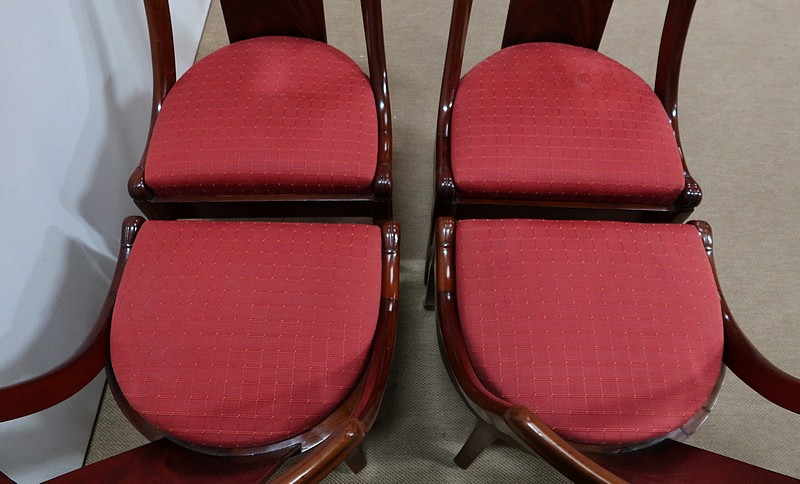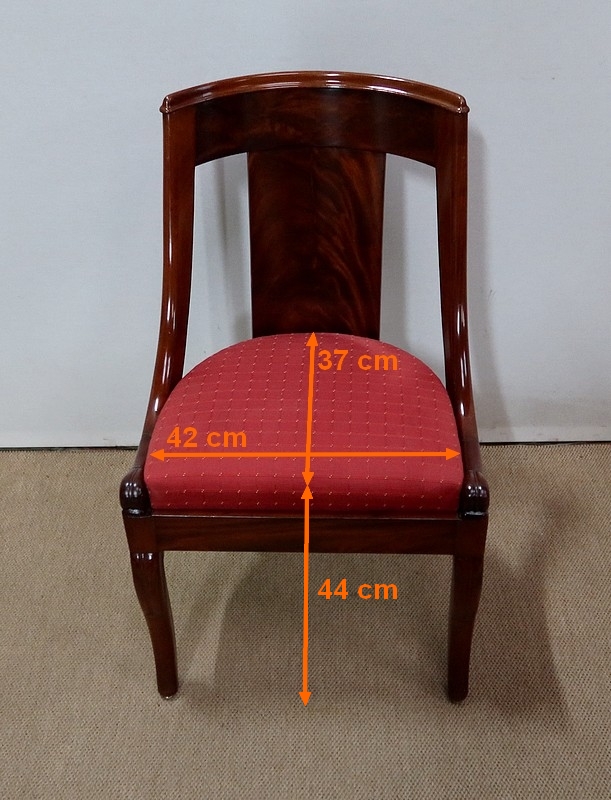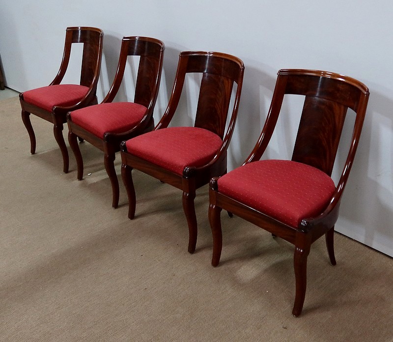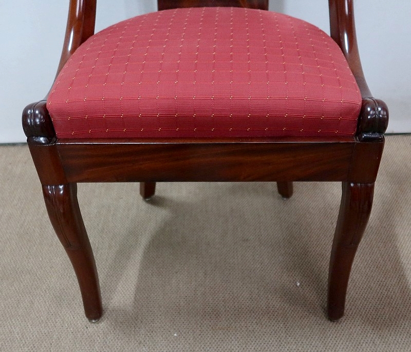 Suite de chaises Restauration en Acajou massif et placage d’Acajou munies d’un dossier ajouré composé d’un élément central de faible épaisseur en placage de ronce d’acajou rejoignant une traverse haute incurvée de la même essence. Chaque côté du dossier en acajou massif rejoint la ceinture cintrée en se terminant par un motif en volute. Sur le dessus, nous retrouvons un élément de bois à double gorge épousant les courbes du dossier.