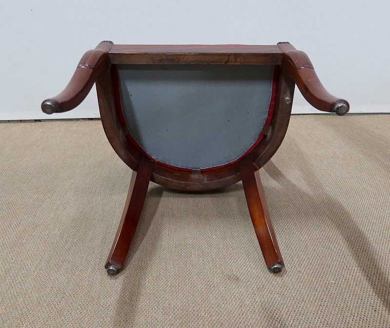Une assise ferme à pelote en parfait état avec sangle et crin, ayant été refaite est recouverte d’un tissu rouge avec trames.