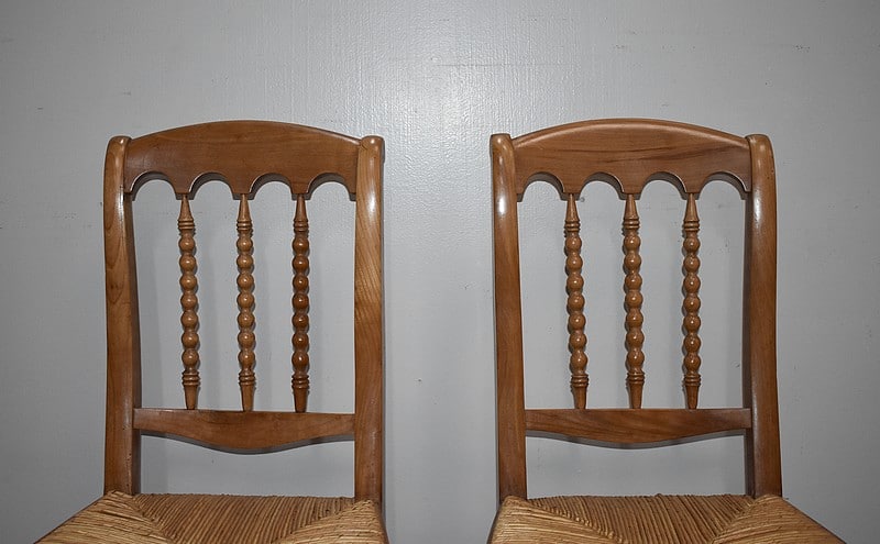Suite de 4 élégantes chaises Restauration, esprit Cathédrale, en merisier blond. Les assises paillées ont été refaites. Les dossiers sont garnis de 3 barreaux tournés façon ‘chapelet’. La ceinture est mouvementée.