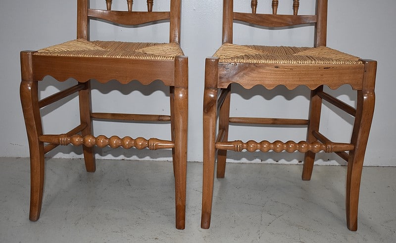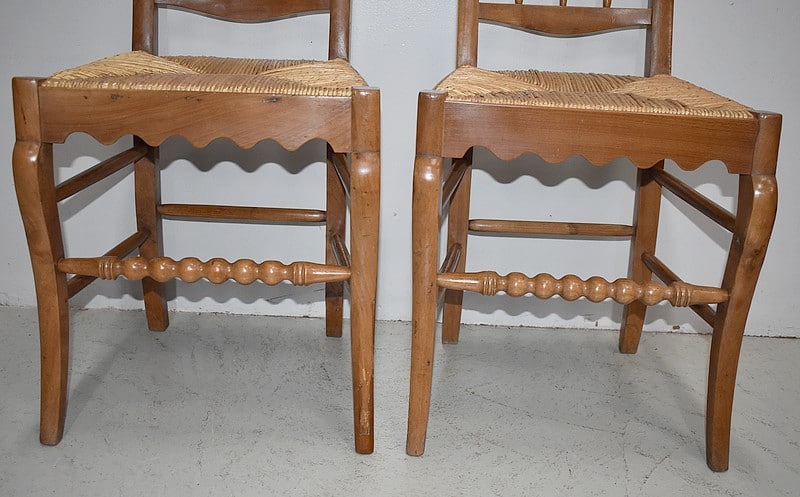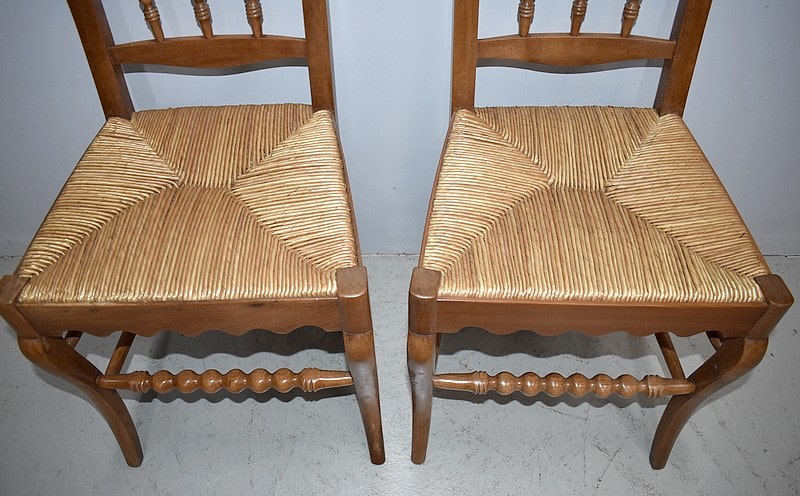 Elles reposent sur des pieds avants ‘genou’ reliés par un barreau tourné, identique à ceux du dossier. Deux barreaux de chaque côté et 1 à l’arrière confortent la solidité du piètement.