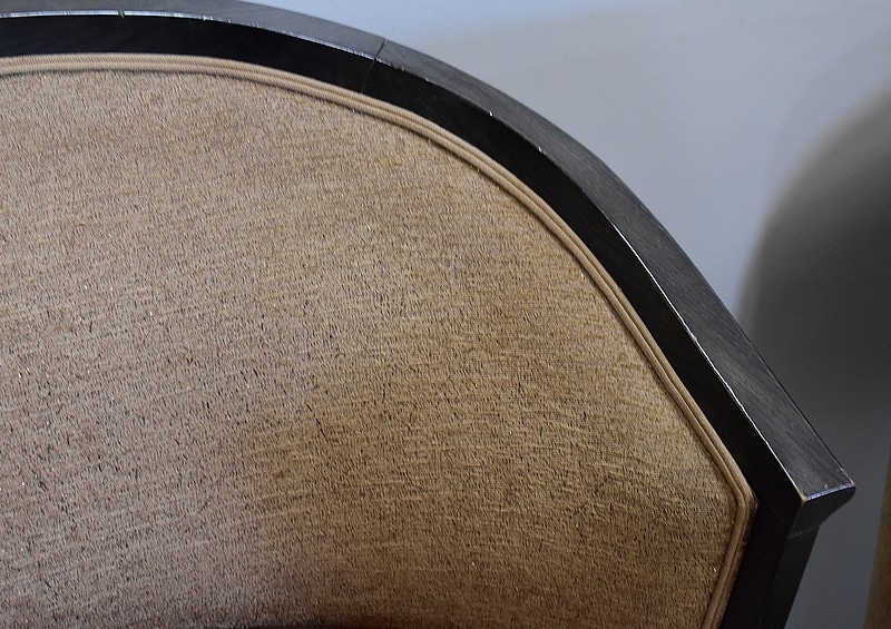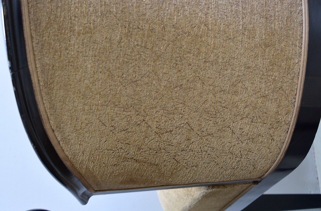 L’assise confortable est d’origine, tout comme le passepoil et le tissu qui montre des marques d’usures et des tâches à certains endroits.