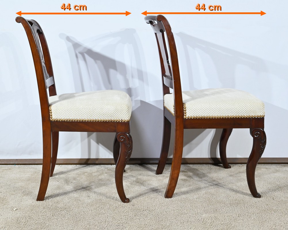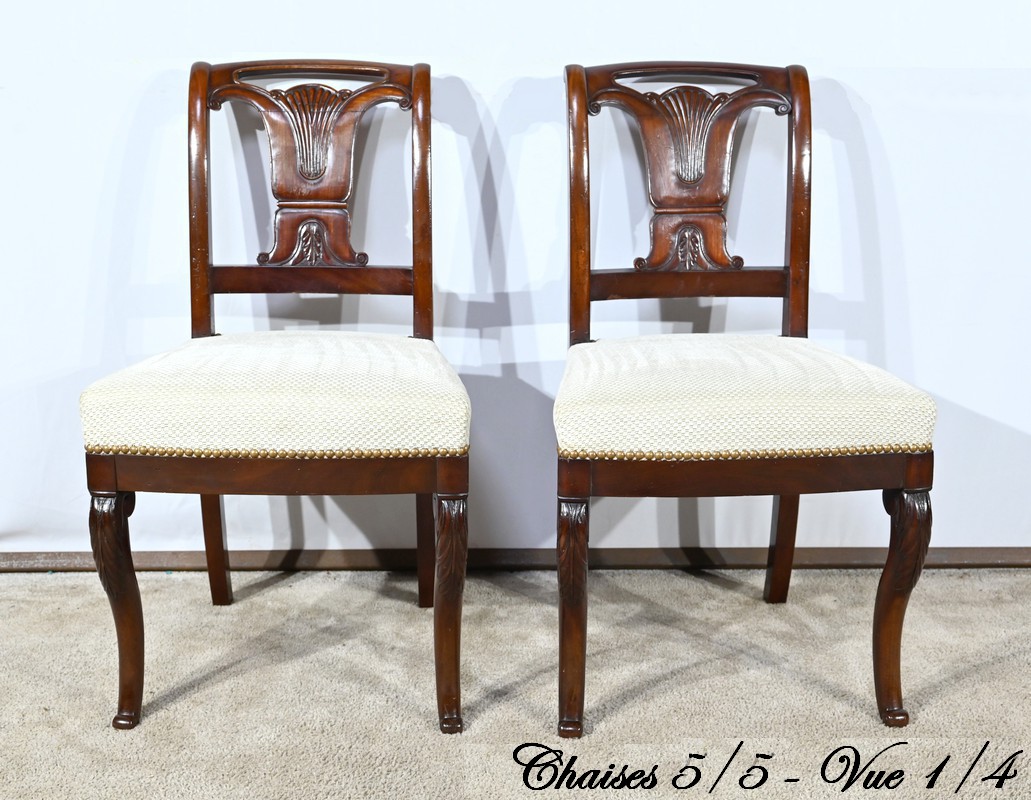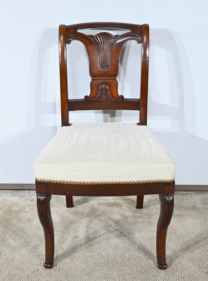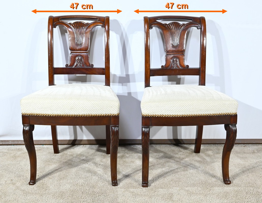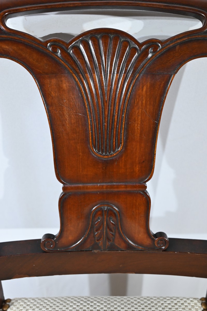 Ces chaises en acajou reposent sur deux pieds à jarret à l’avant, avec décors de feuilles d’acanthe et volutes.