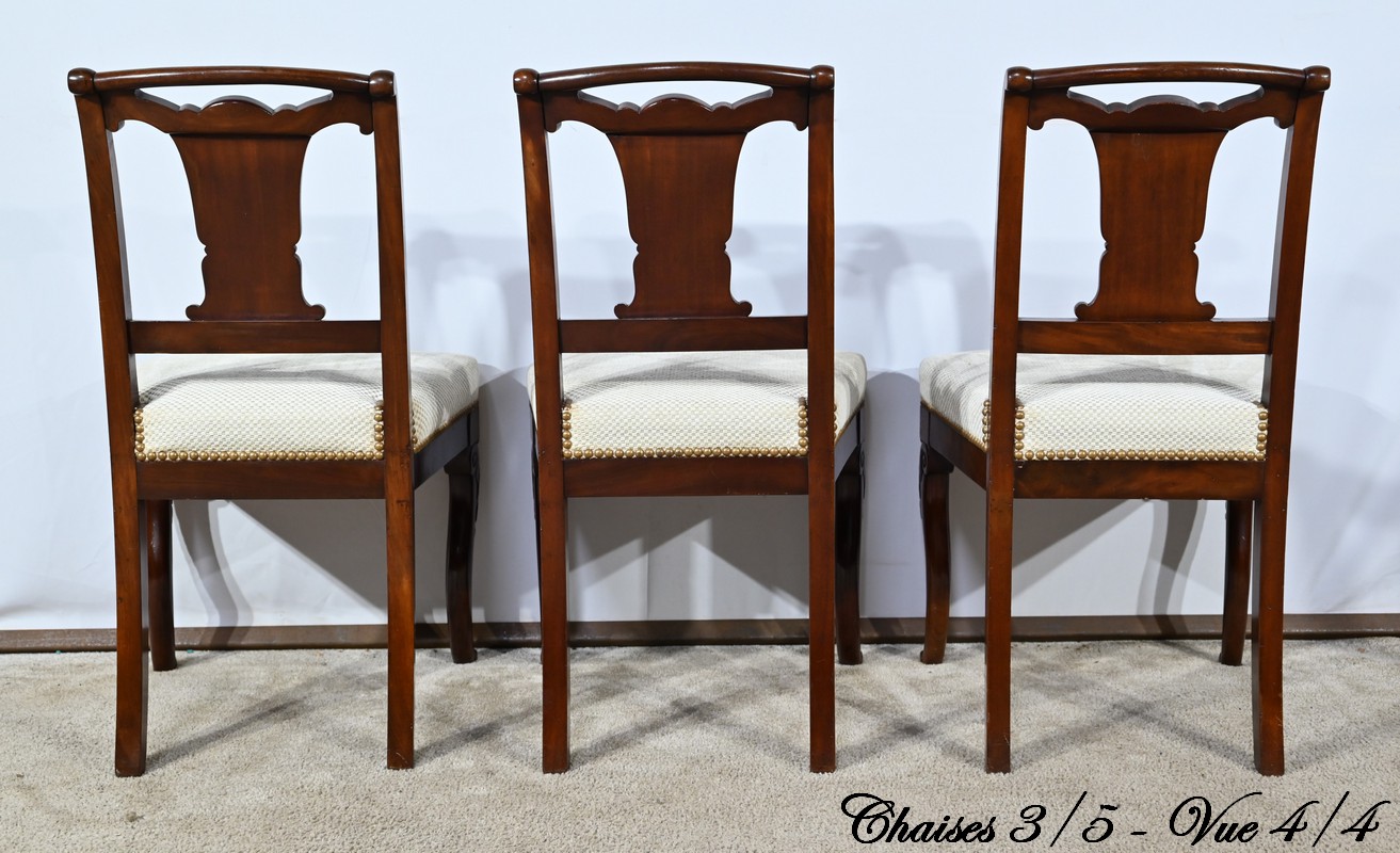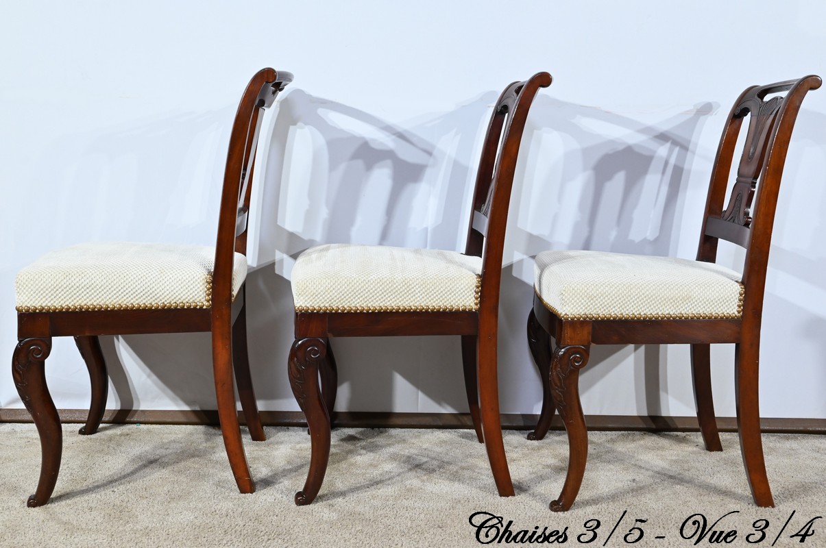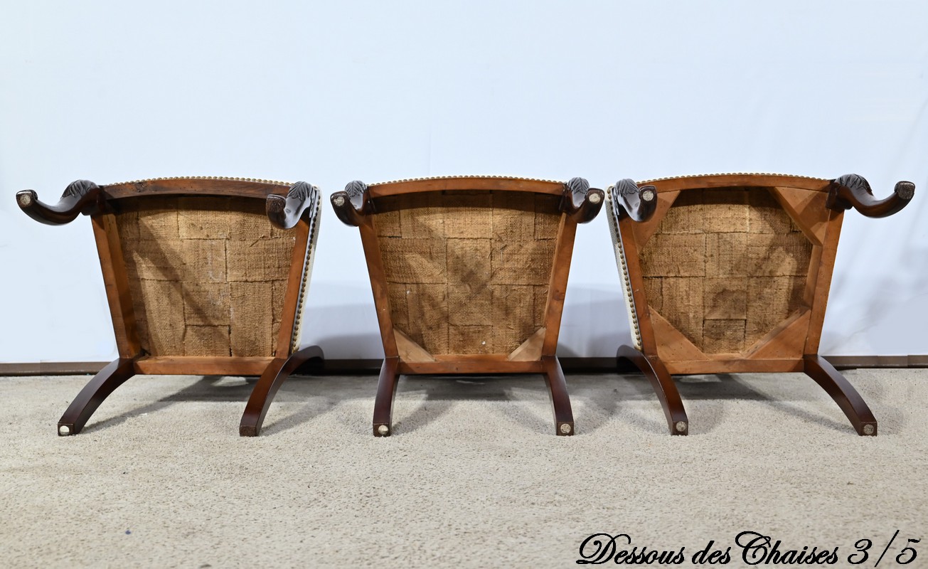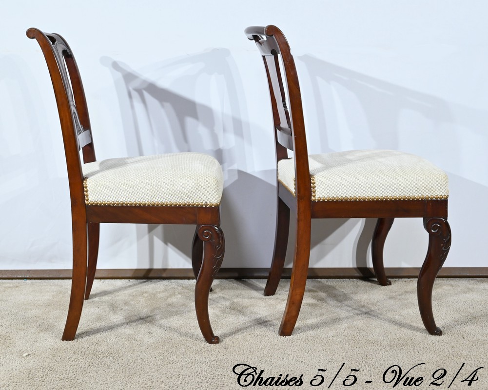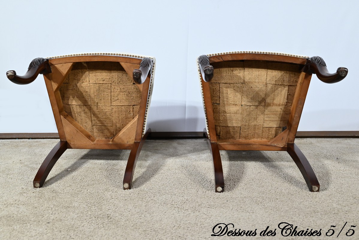 Ces chaises en acajou reposent sur deux pieds à jarret à l’avant, avec décors de feuilles d’acanthe et volutes.