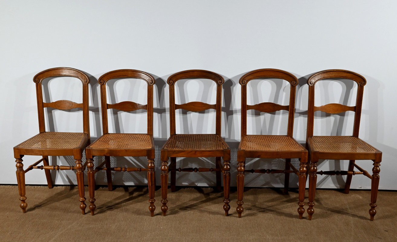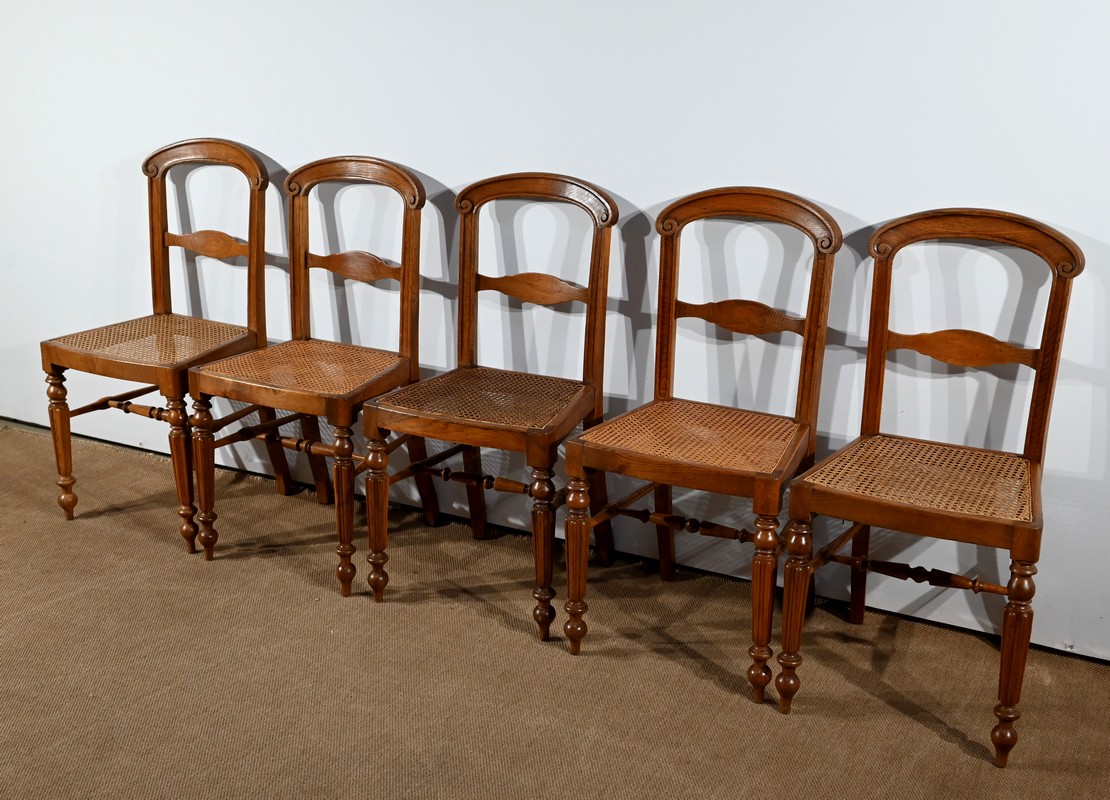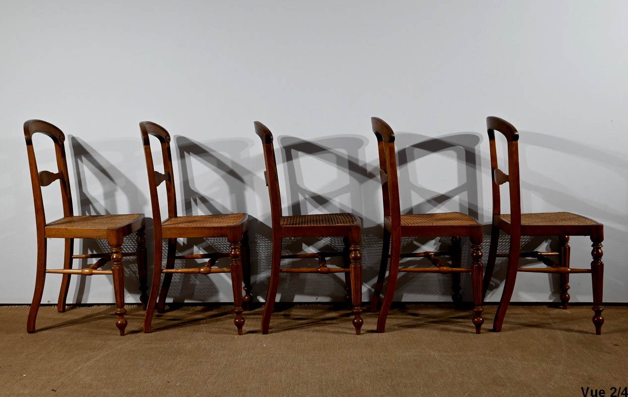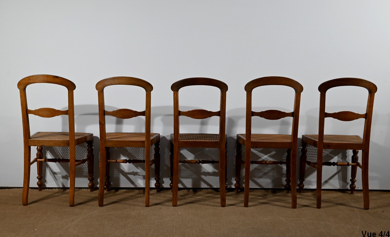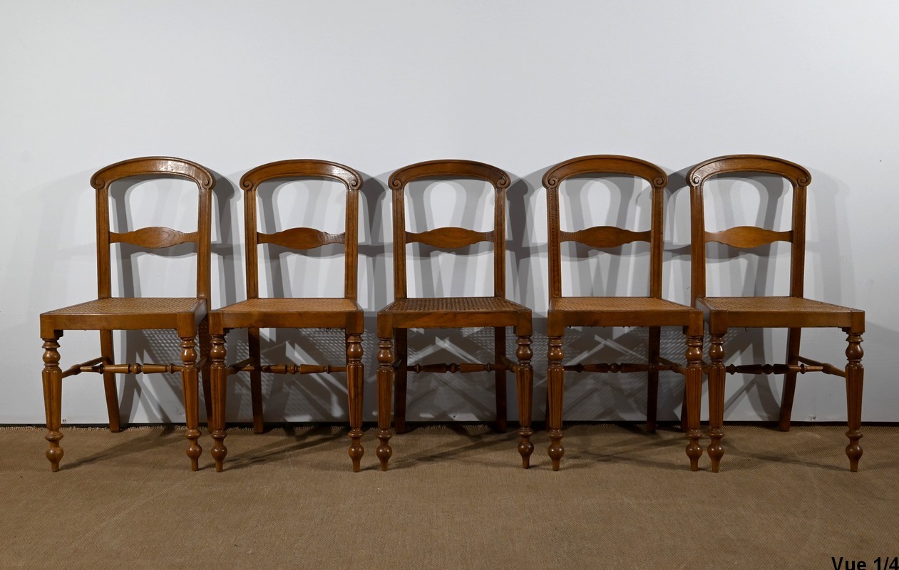 Suite de cinq chaises cannées en chêne massif, époque Louis-Philippe.
