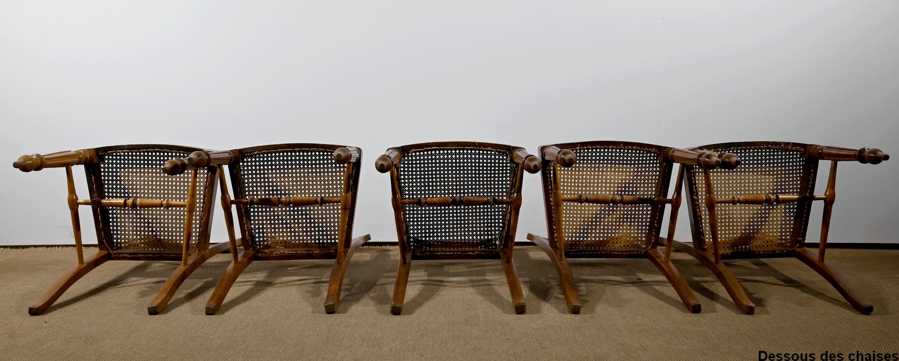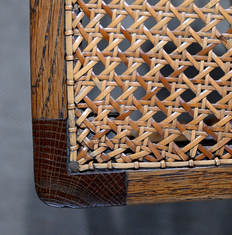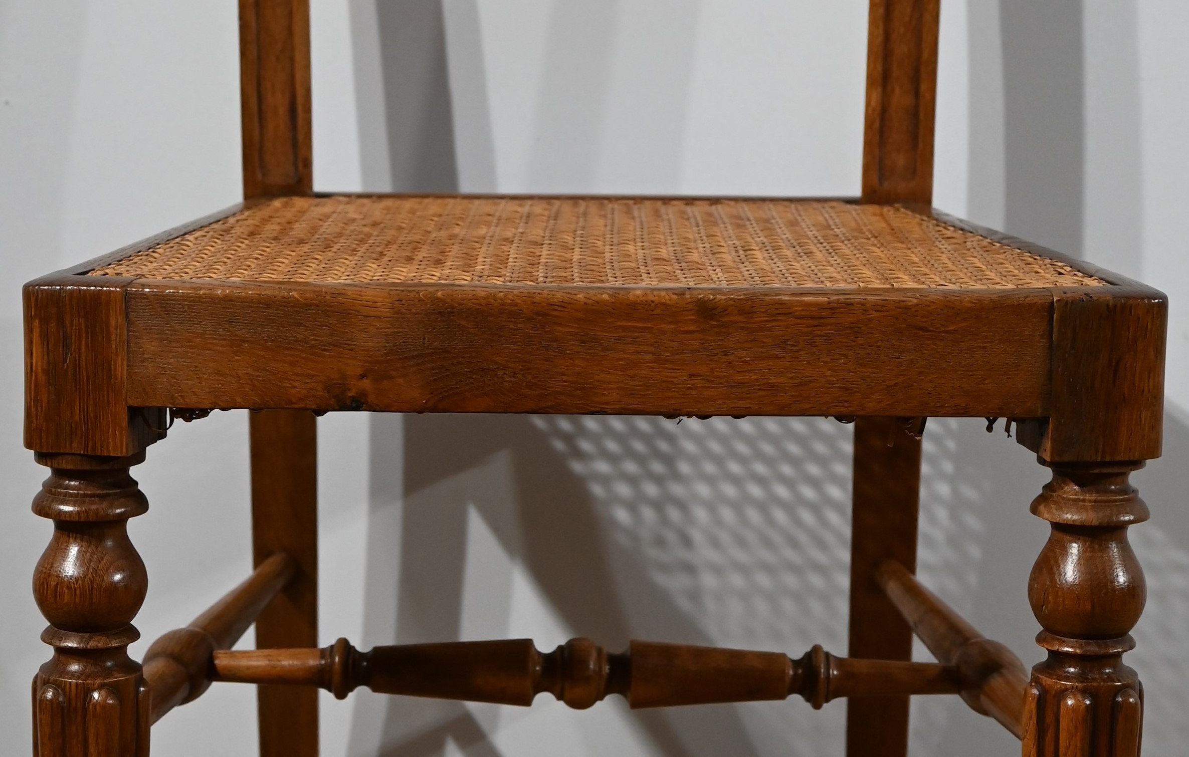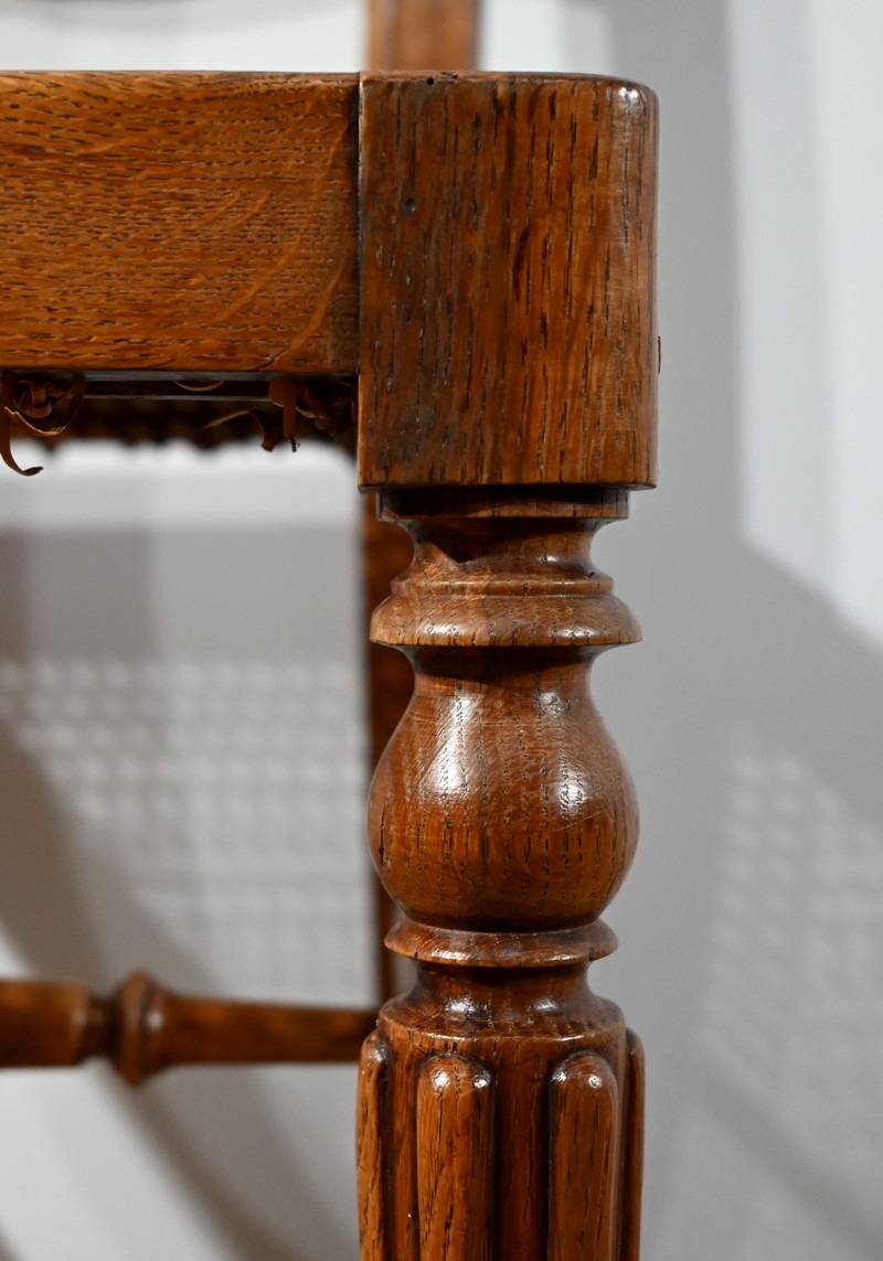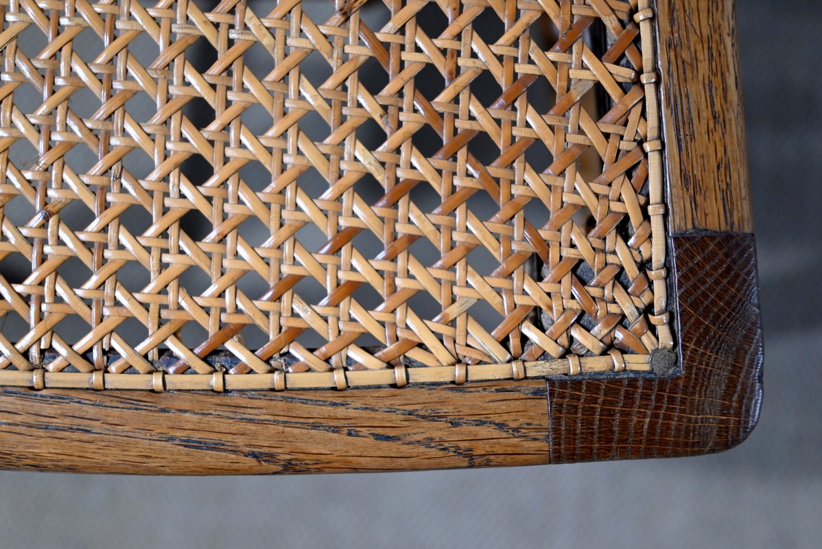 Les assises, ceinturées, reposent sur des pieds avant tournés en fuseau, en partie godronnés, et des pieds arrière en coup de fouet tournés vers l’extérieur. Chaque piétement est relié par une entretoise en « H » minutieusement tournée, assurant sa stabilité et sa solidité.