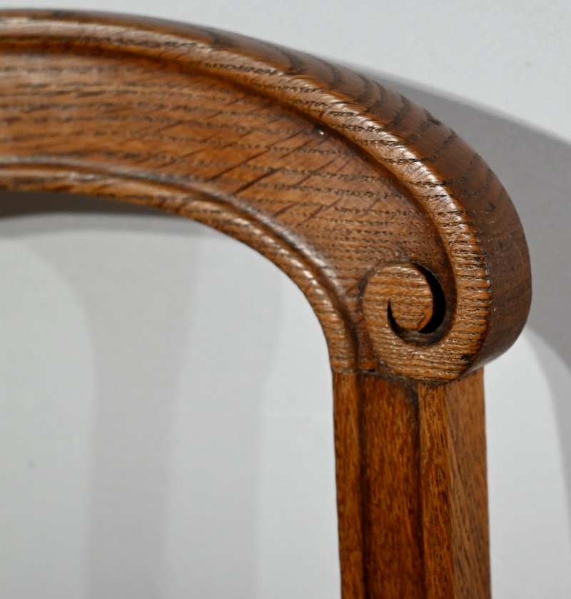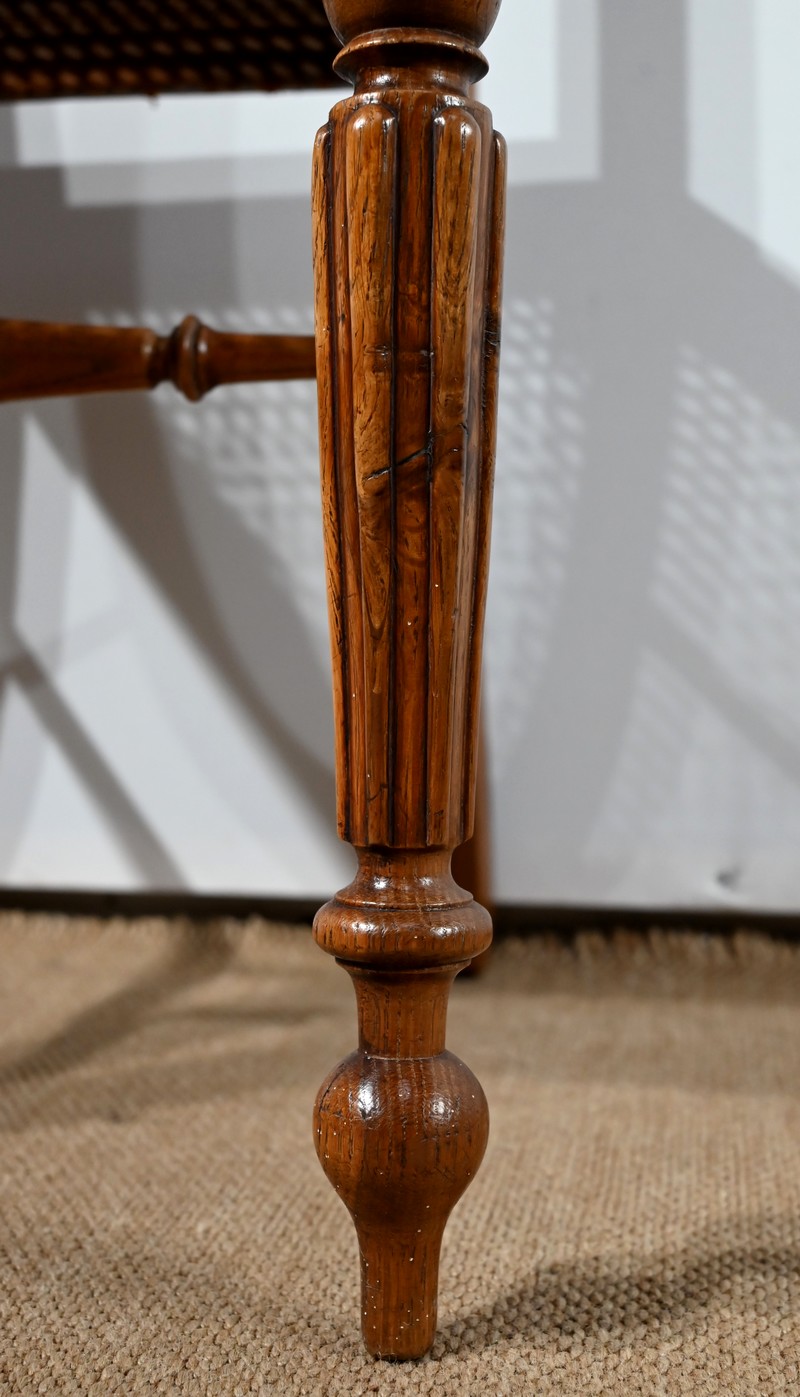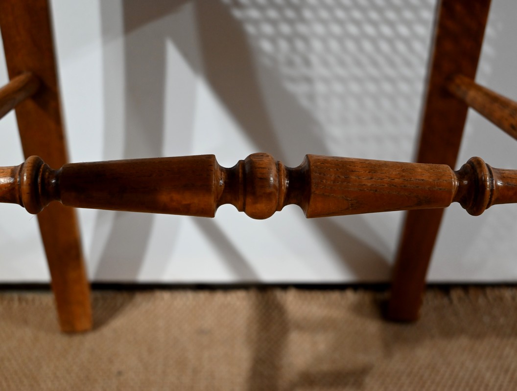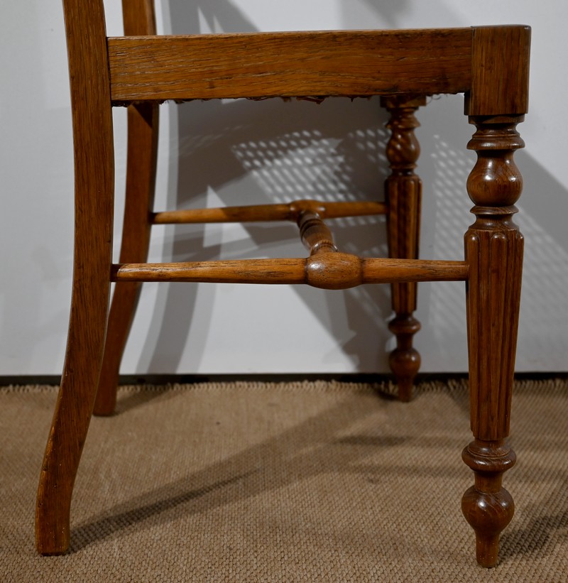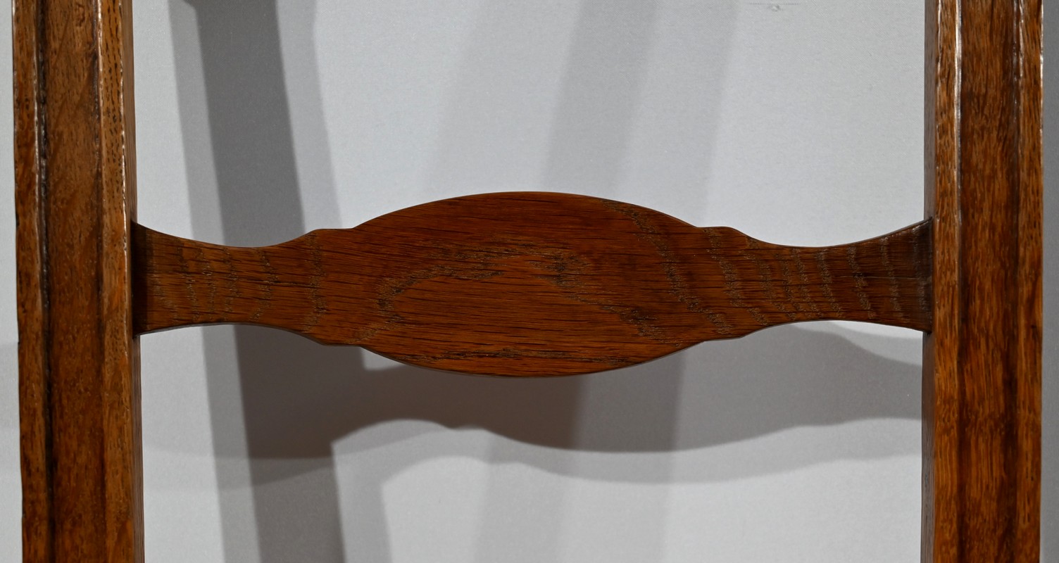 Les assises, ceinturées, reposent sur des pieds avant tournés en fuseau, en partie godronnés, et des pieds arrière en coup de fouet tournés vers l’extérieur. Chaque piétement est relié par une entretoise en « H » minutieusement tournée, assurant sa stabilité et sa solidité.