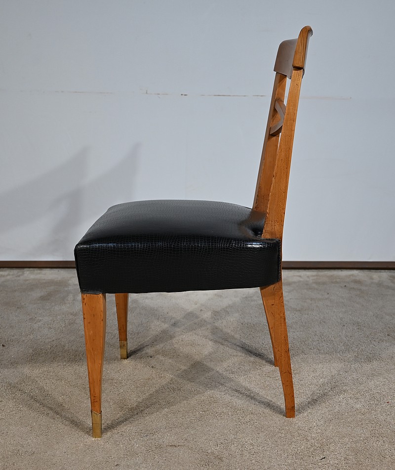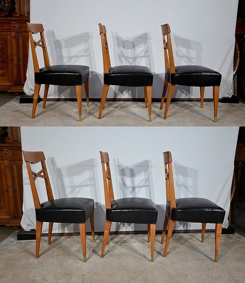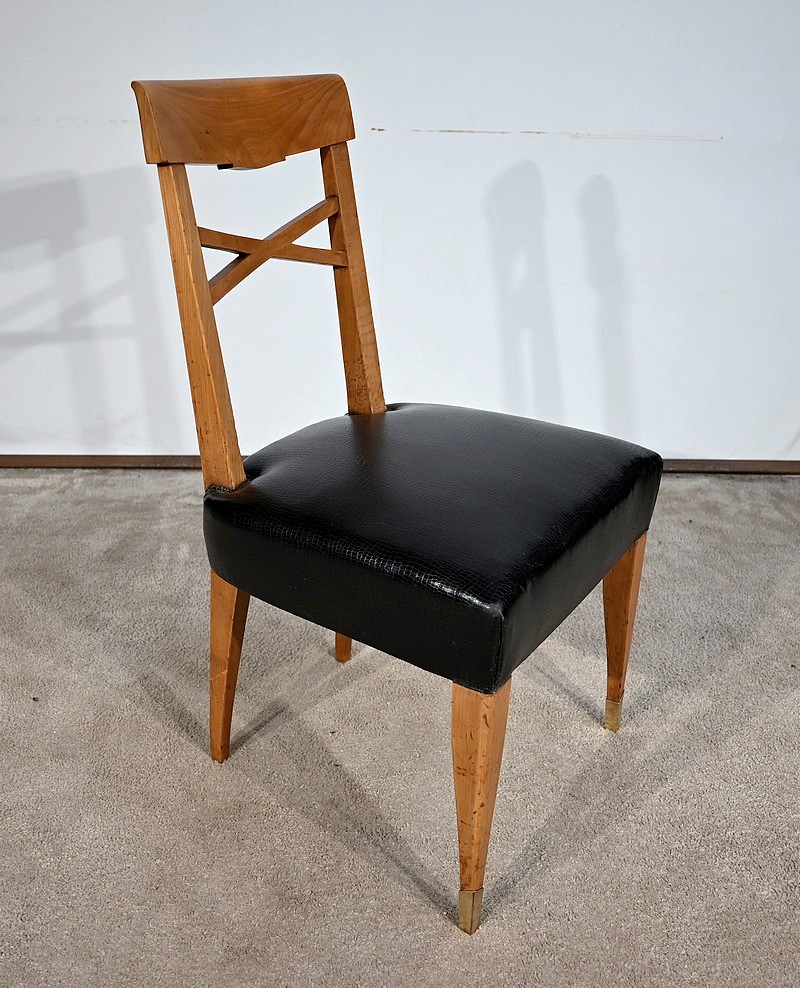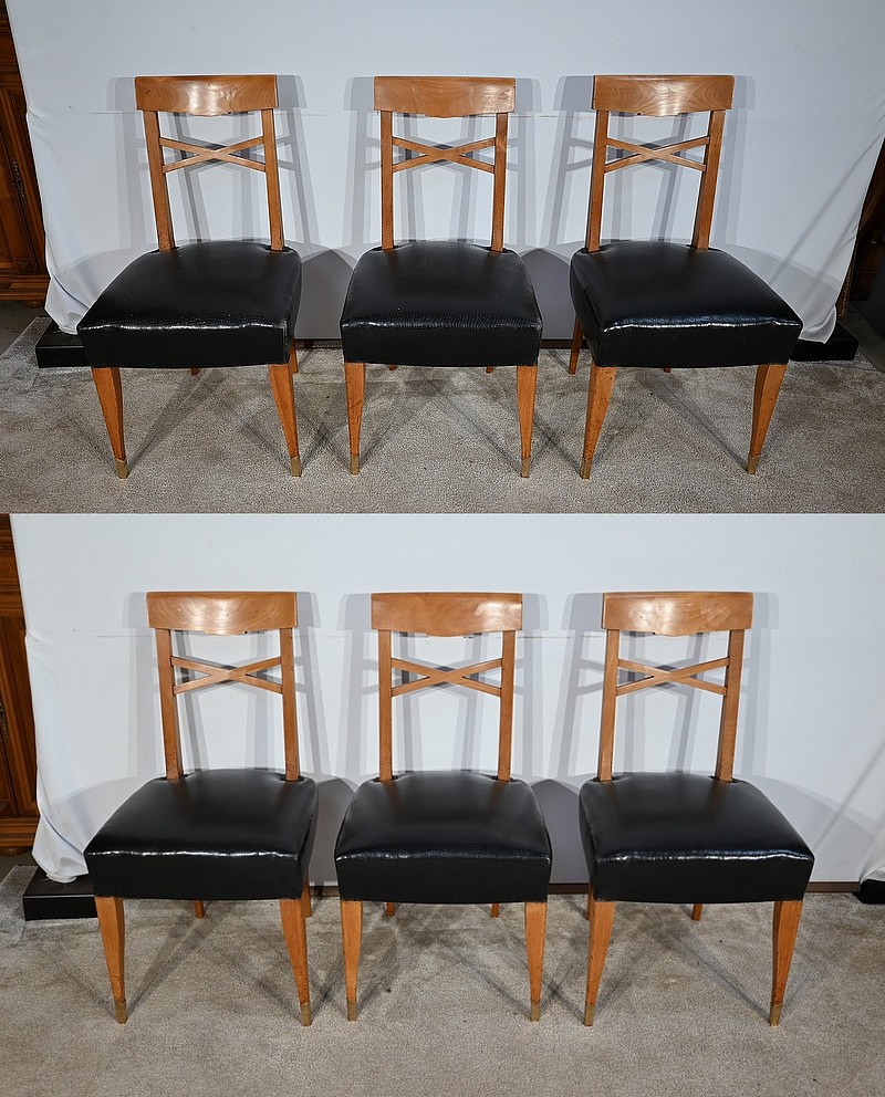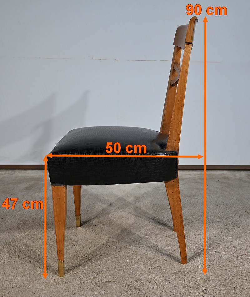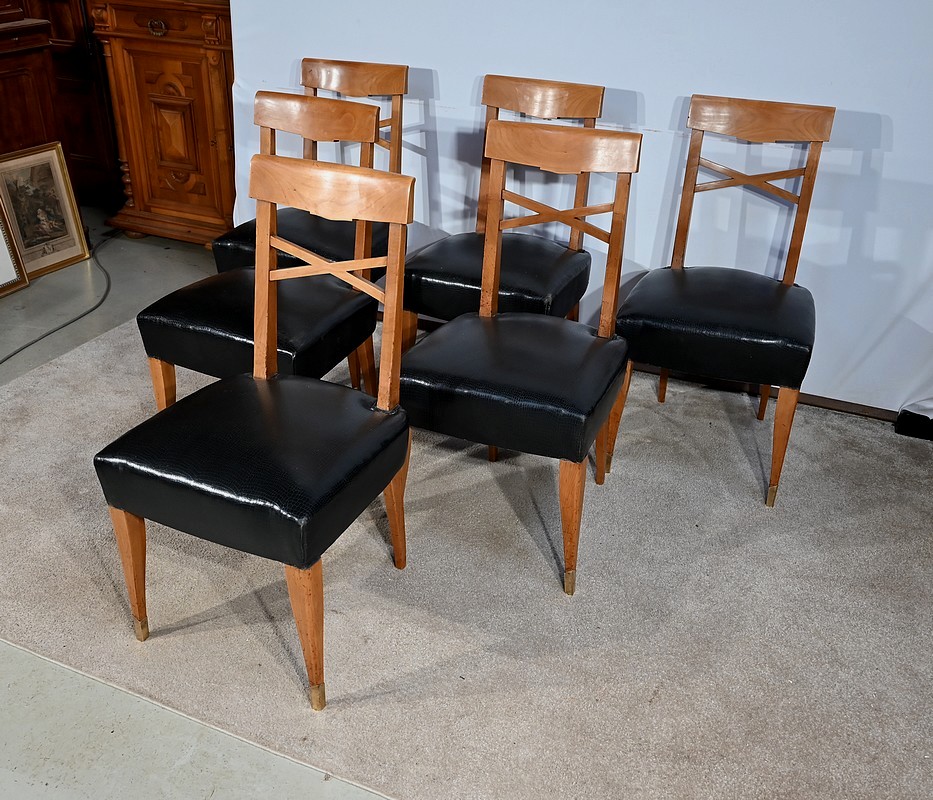 Belle suite de six chaises en merisier massif, d’époque Art Déco, se remarquant par l’étroitesse de leur dossier contrastant avec leur assise généreuse.