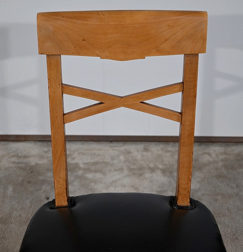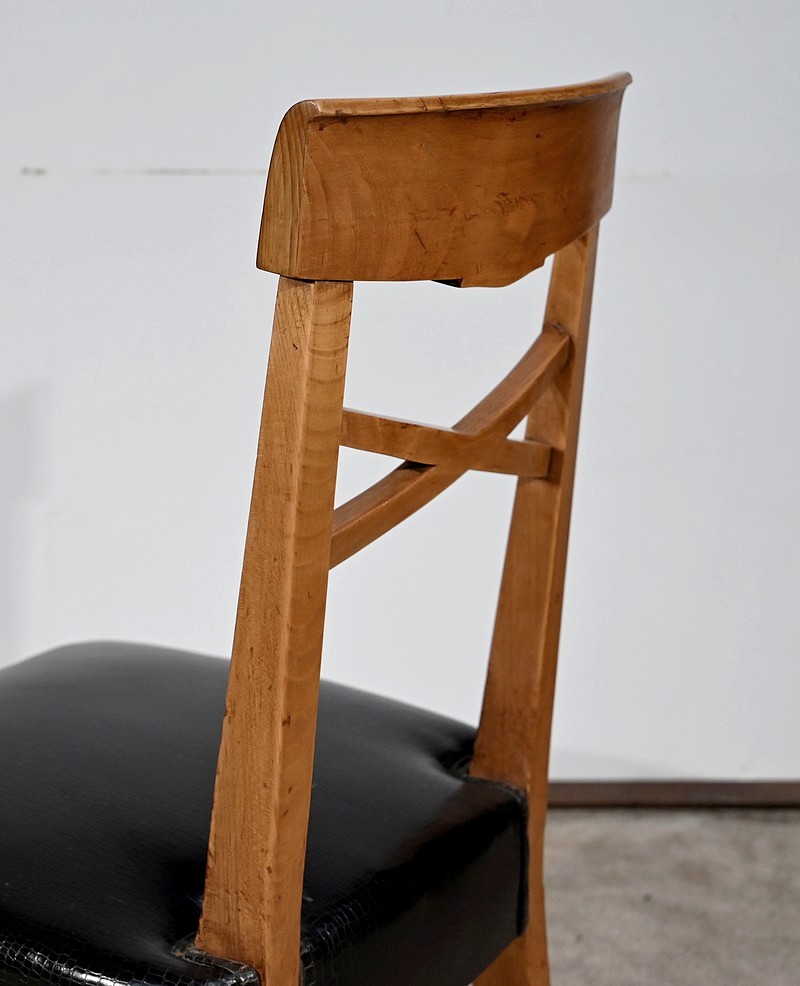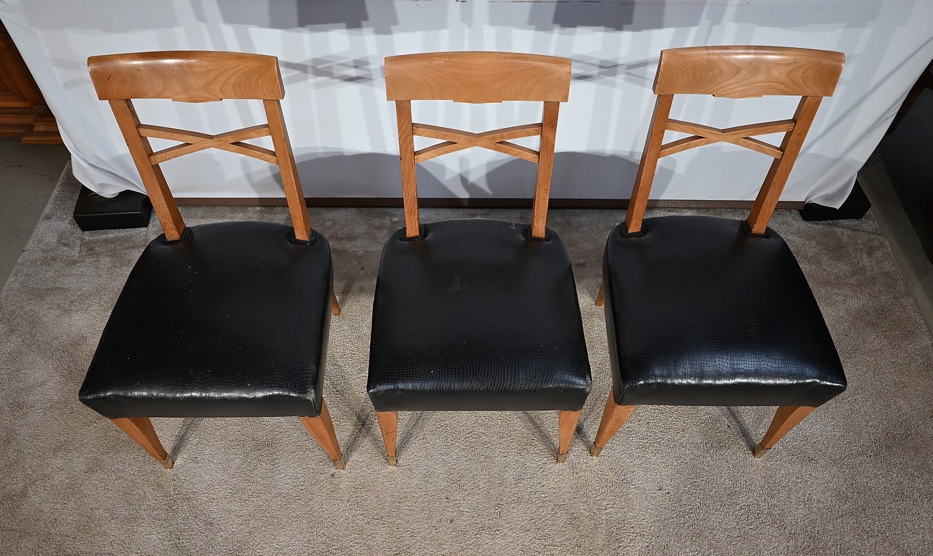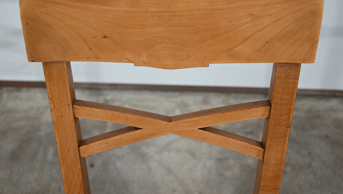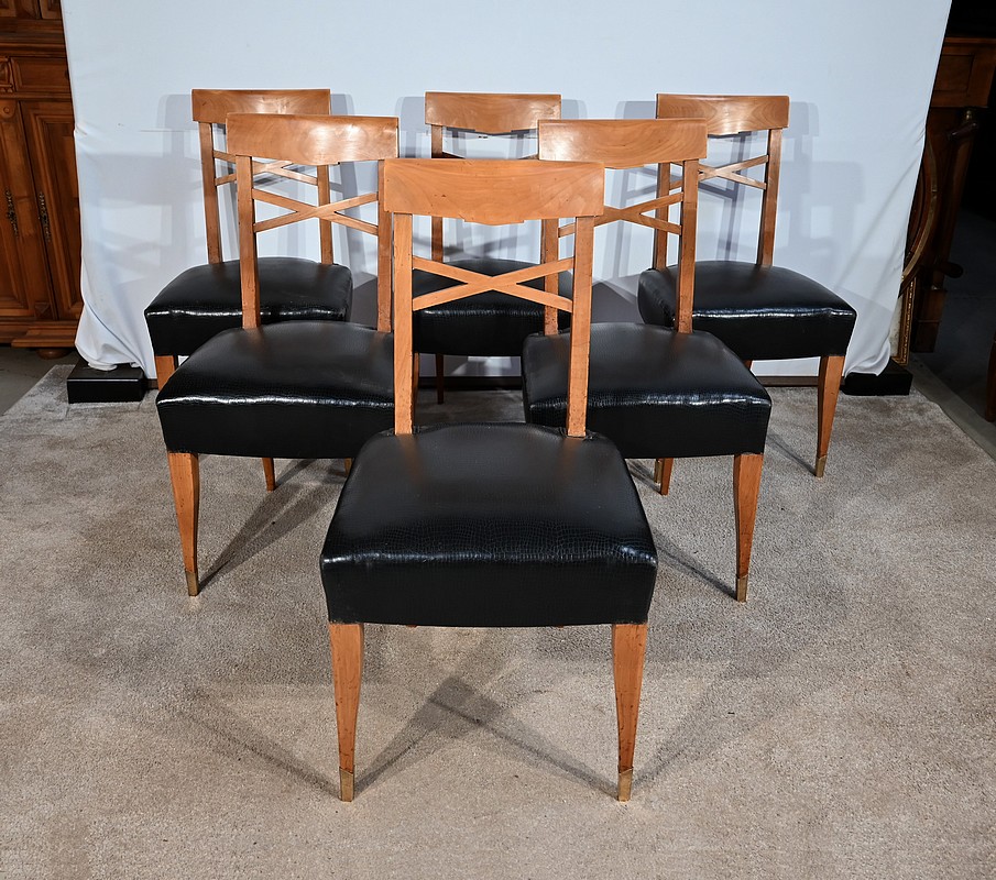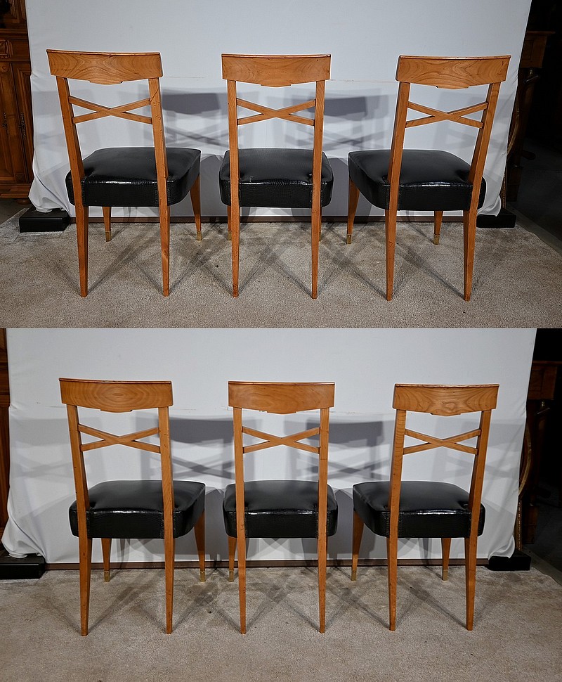 Belle suite de six chaises en merisier massif, d’époque Art Déco, se remarquant par l’étroitesse de leur dossier contrastant avec leur assise généreuse.
