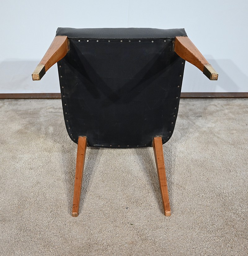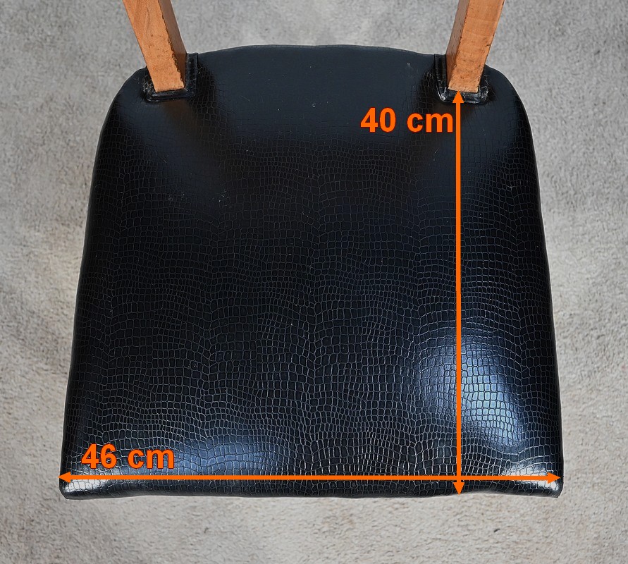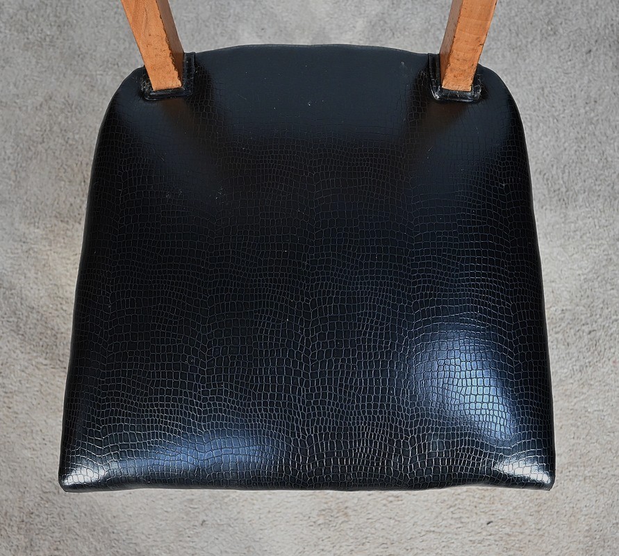L’assise généreuse est traditionnelle (ressorts, crins…) et habillée d’un simili cuir noir d’origine, imitation crocodile.