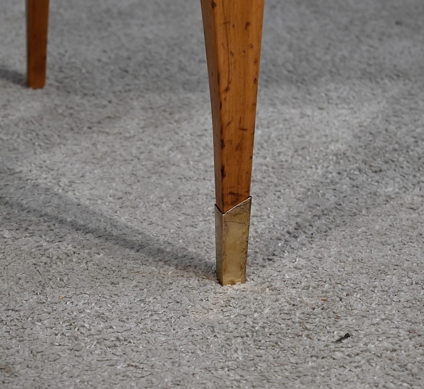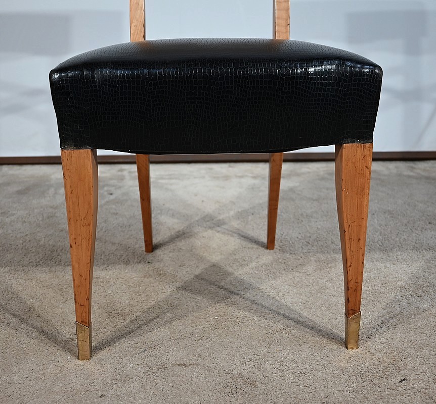 Chaque chaise repose sur des pieds de section carrée, s’affinant vers le bas et pourvus d’un habillage en laiton sur les quatre faces en partie basse.