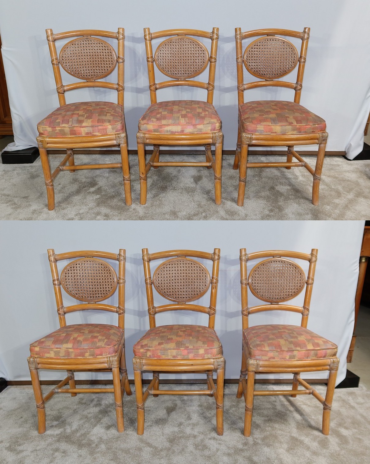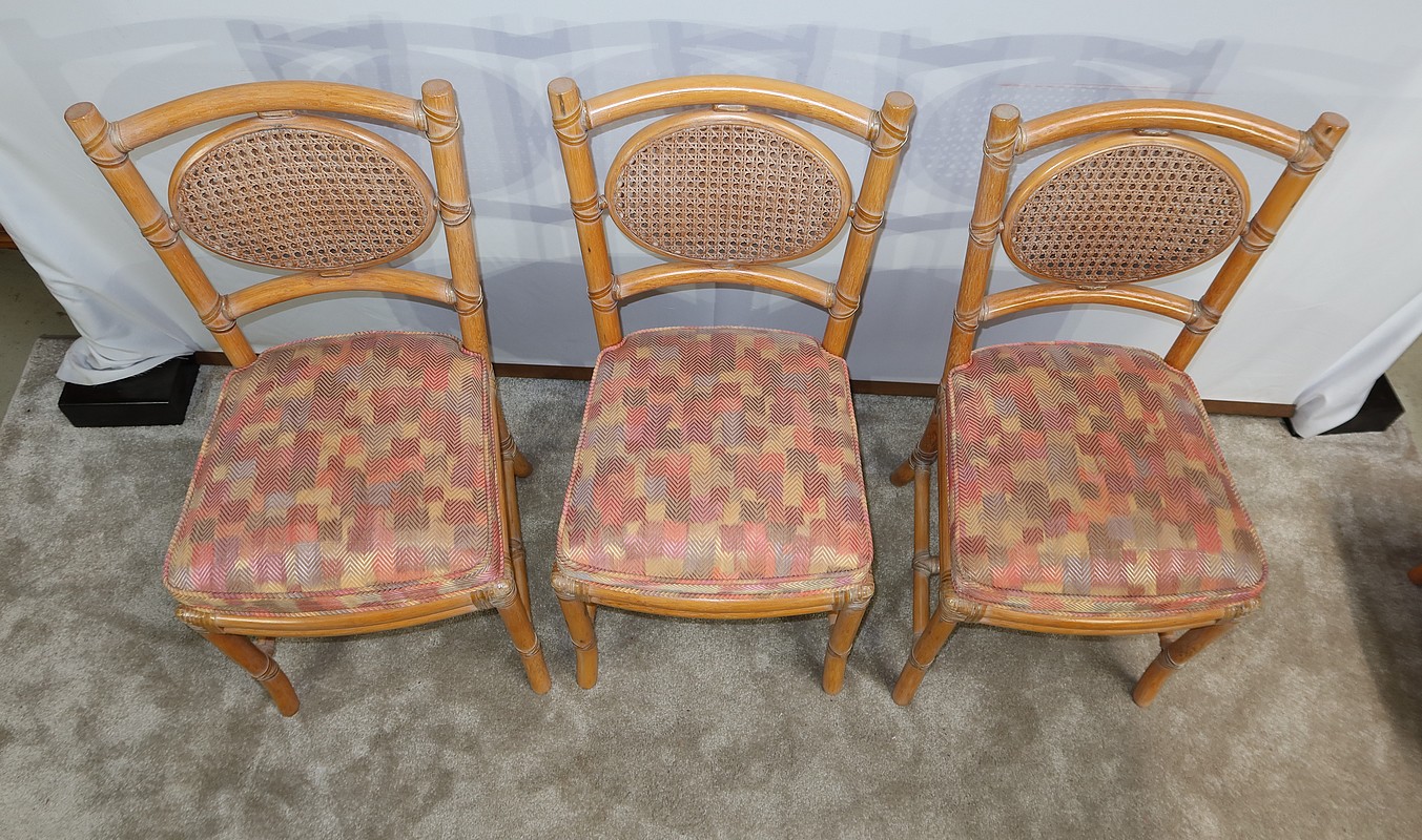 Ces chaises en frêne possèdent un dossier ajouré trapézoïdale muni d’un ovale composé d’un double cannage.