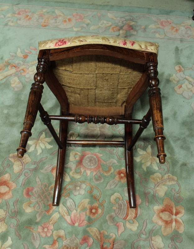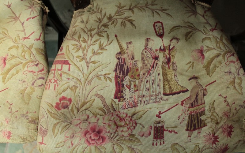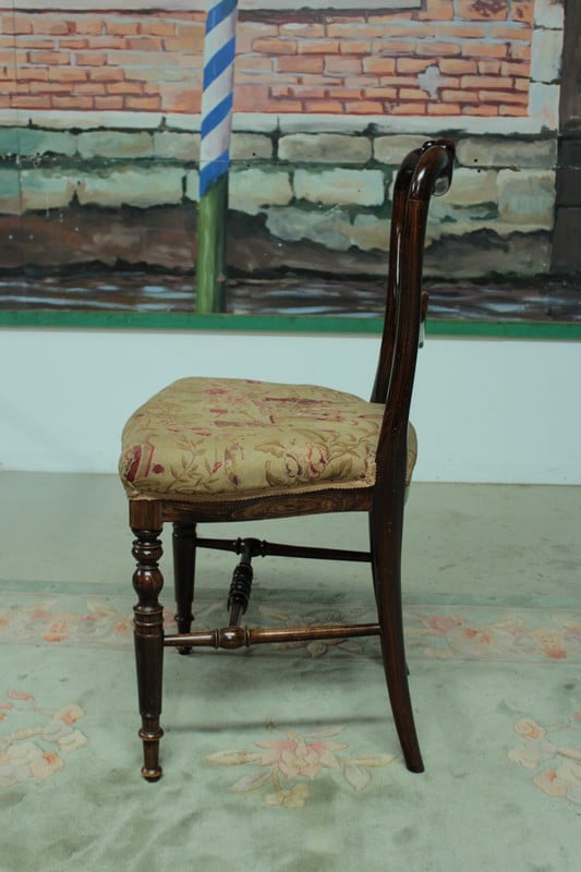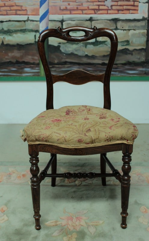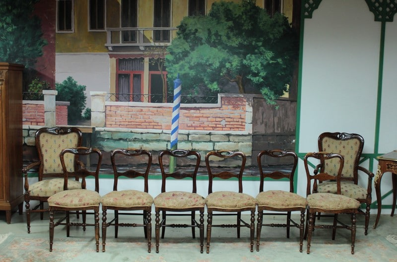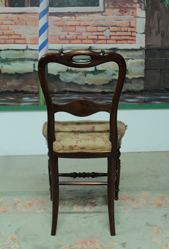 Suite de 6 chaises en hêtre teinté façon palissandre. Le dossier sinueux est ajouré d’une poignée et garni d’une traverse. Les pieds tourné et fuselés sont unis par une traverse également tournée. Garniture de tissu à décor chinois usagée. Époque NAPOLÉON III – seconde moitié du XIXe.