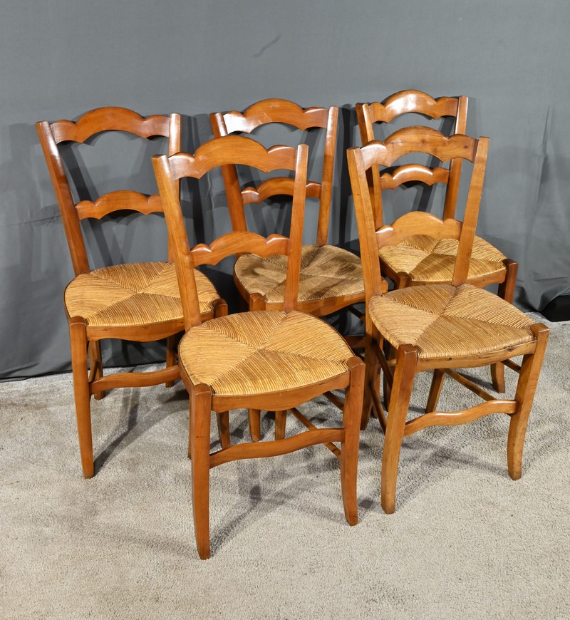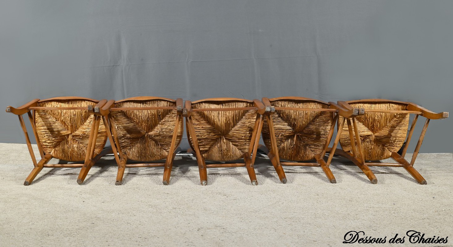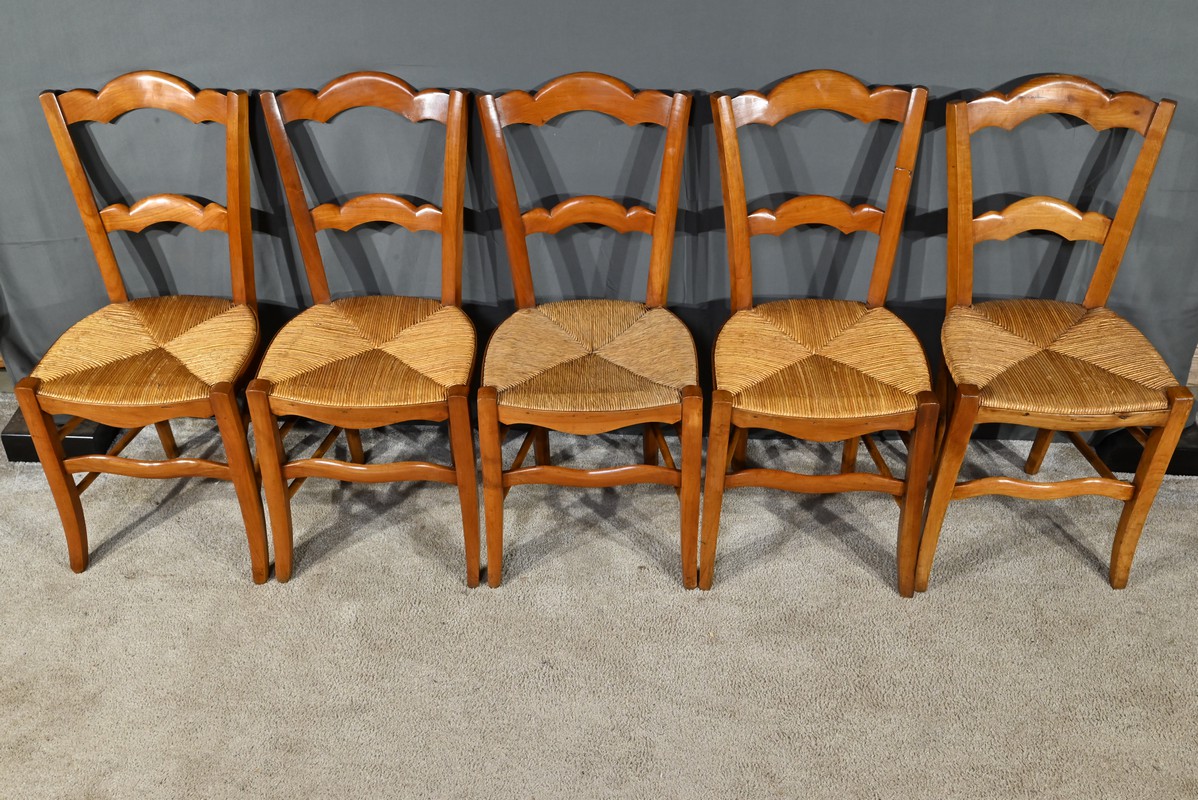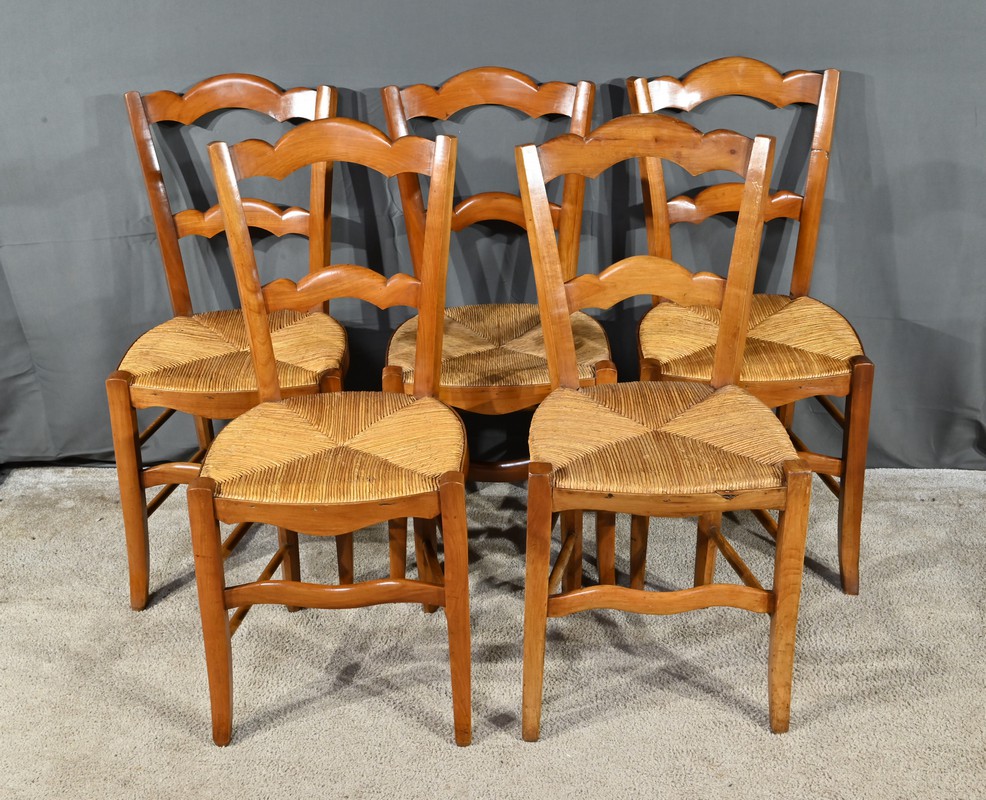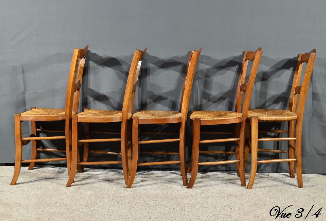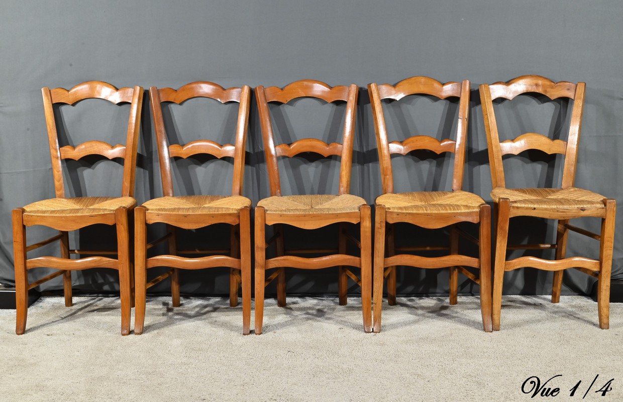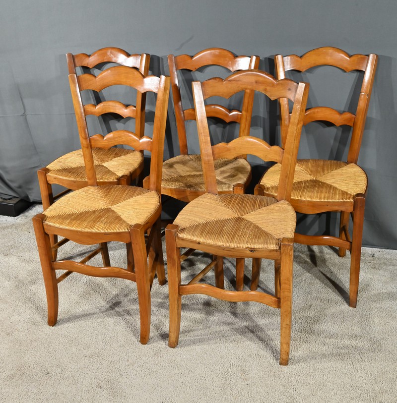 Ces cinq chaises en bois de merisier, apprécié pour sa couleur chaude et son grain fin, présentent un style campagnard avec assises paillées, typiques des meubles fonctionnels et confortables.