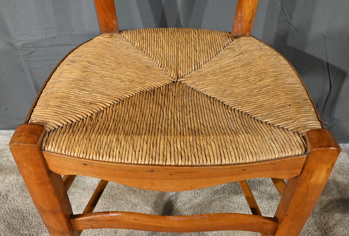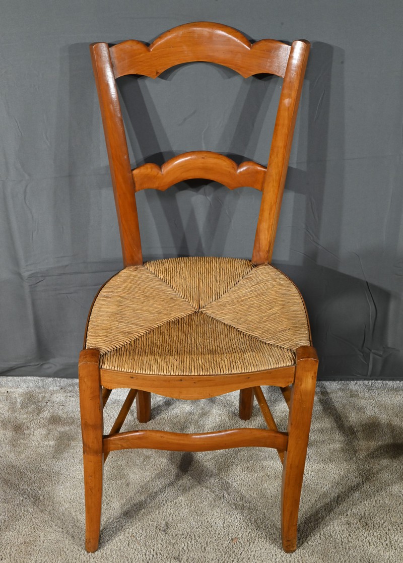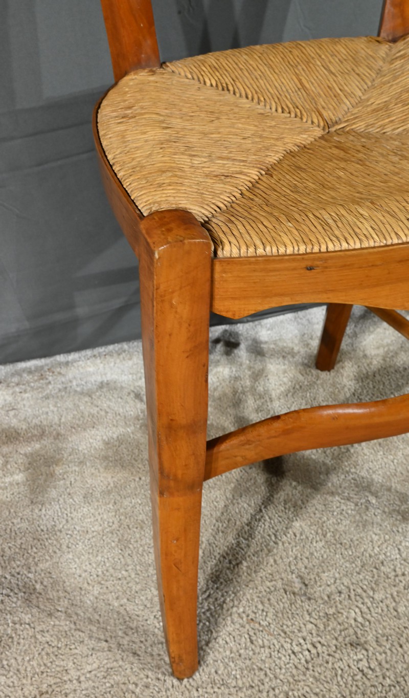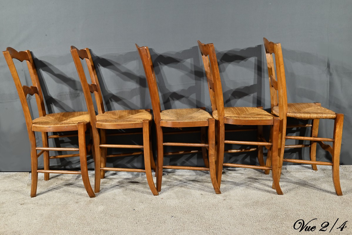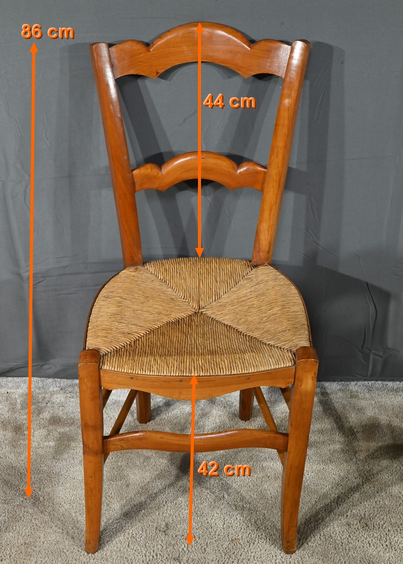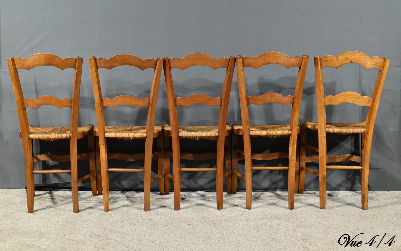 Ces cinq chaises en bois de merisier, apprécié pour sa couleur chaude et son grain fin, présentent un style campagnard avec assises paillées, typiques des meubles fonctionnels et confortables.