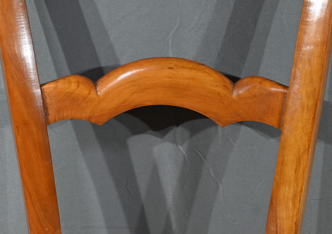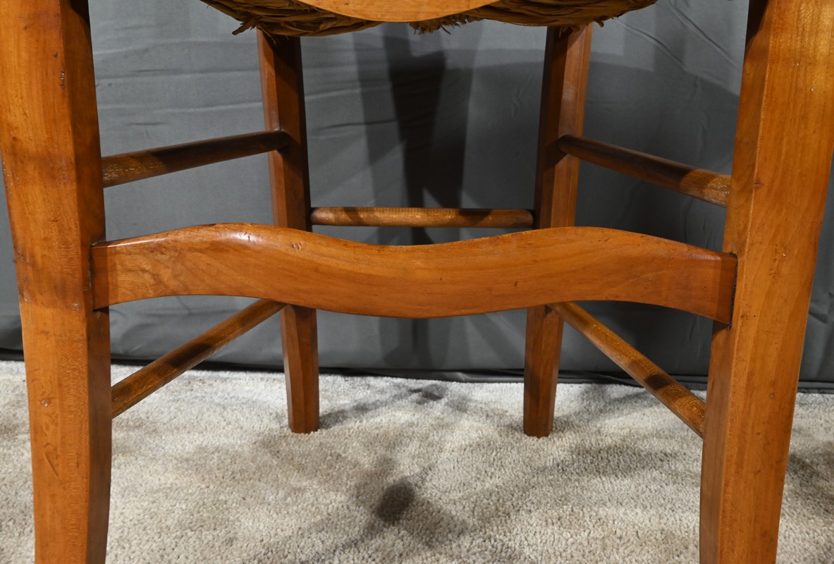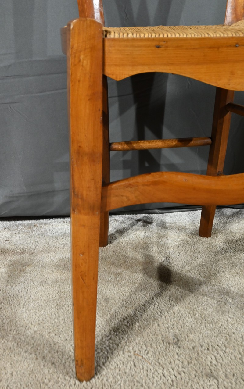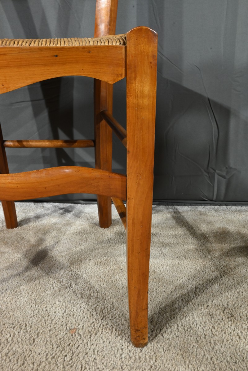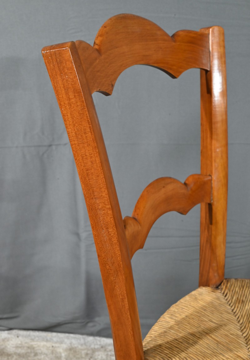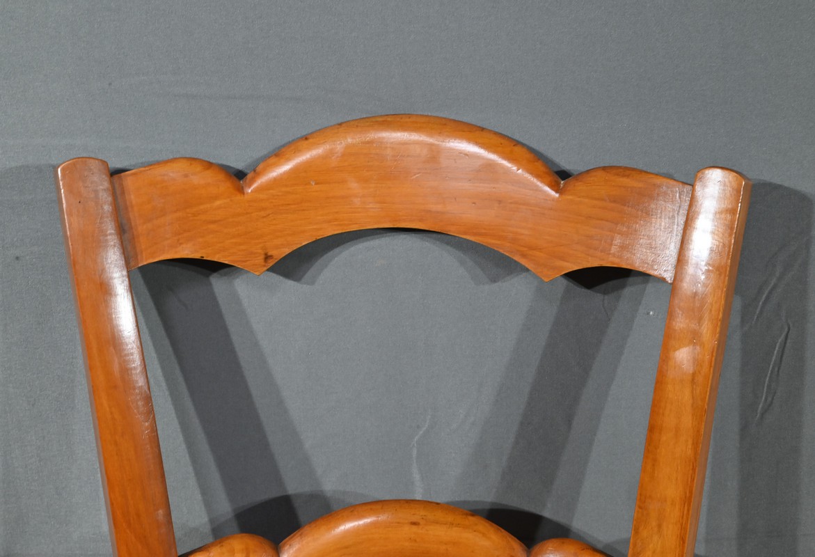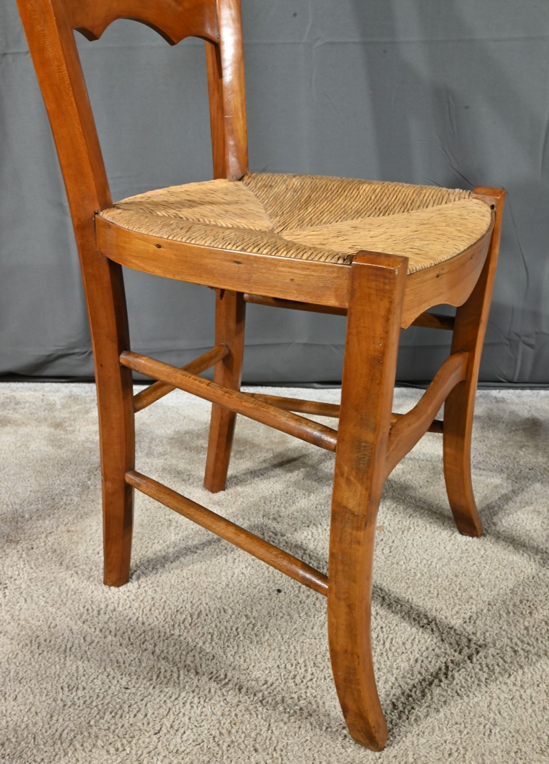Ces cinq chaises en bois de merisier, apprécié pour sa couleur chaude et son grain fin, présentent un style campagnard avec assises paillées, typiques des meubles fonctionnels et confortables.