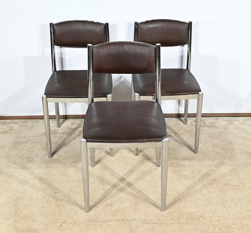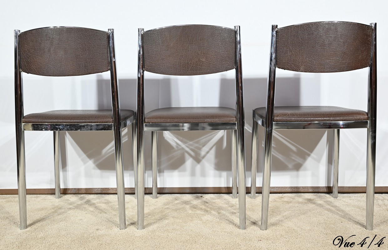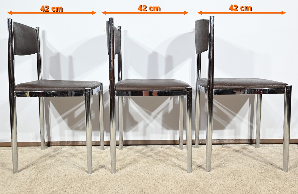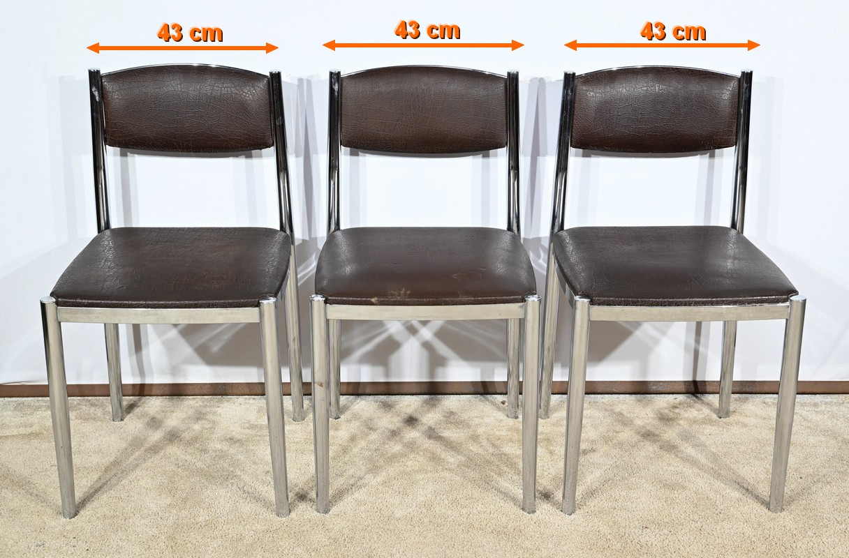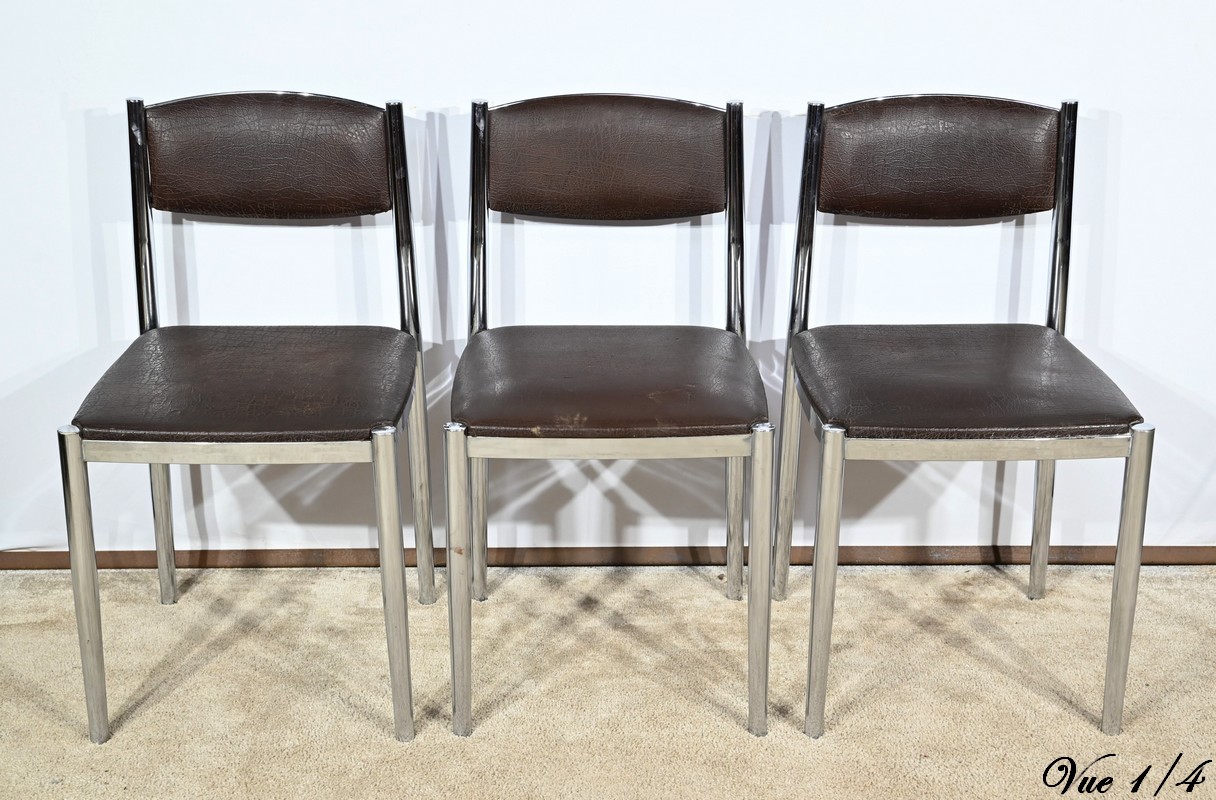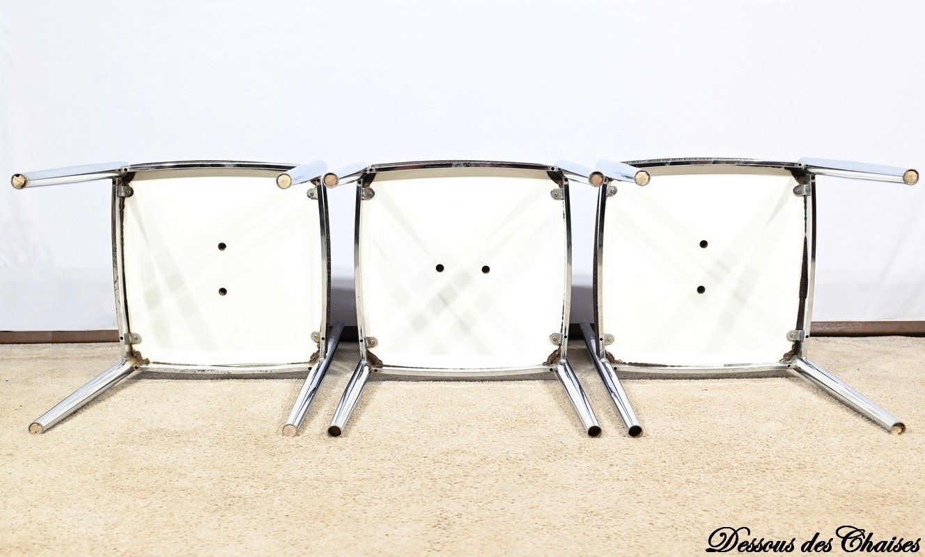 Suite de trois chaises, à ossatures métalliques chromées, reposant chacune sur quatre pieds tubulaires.