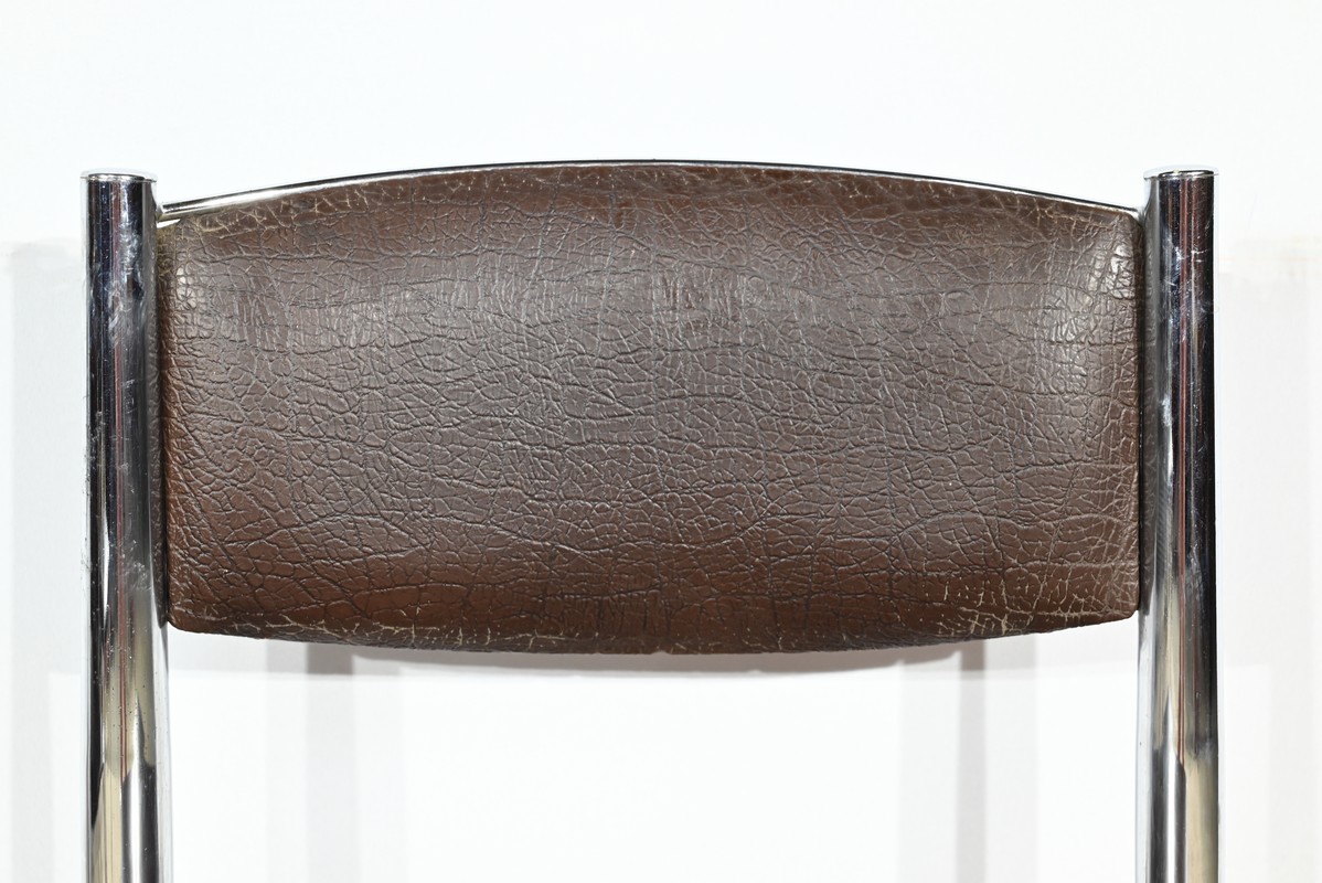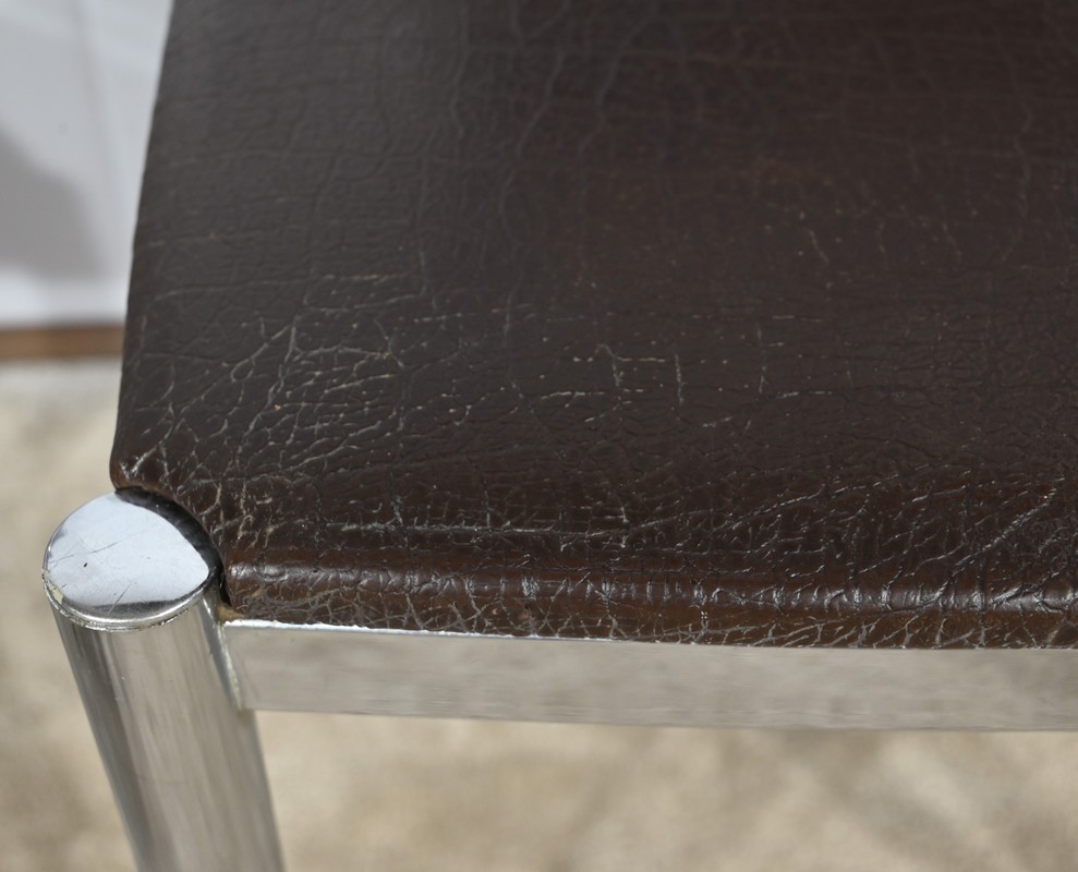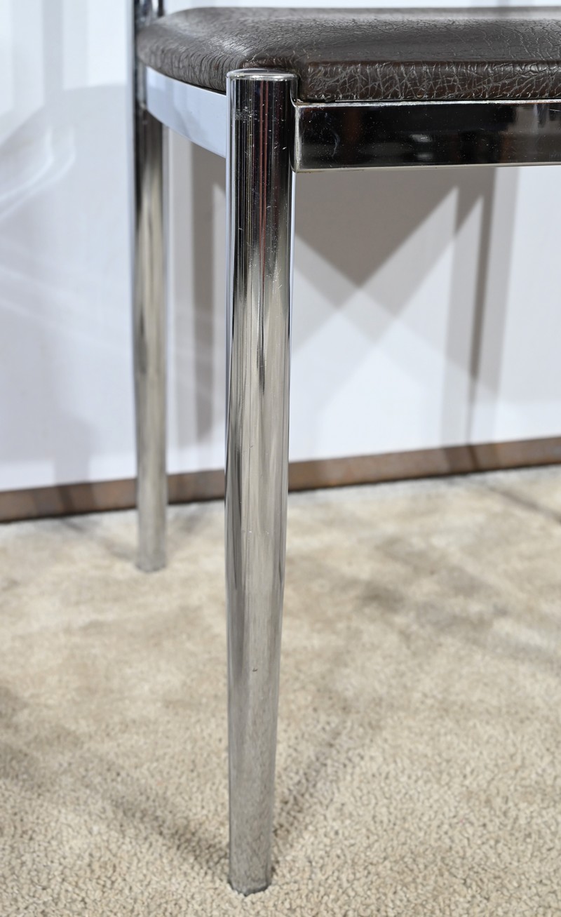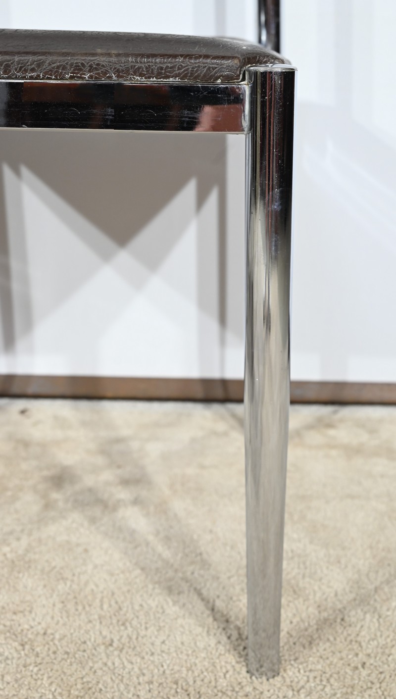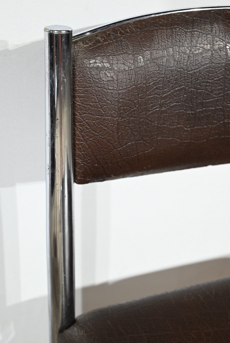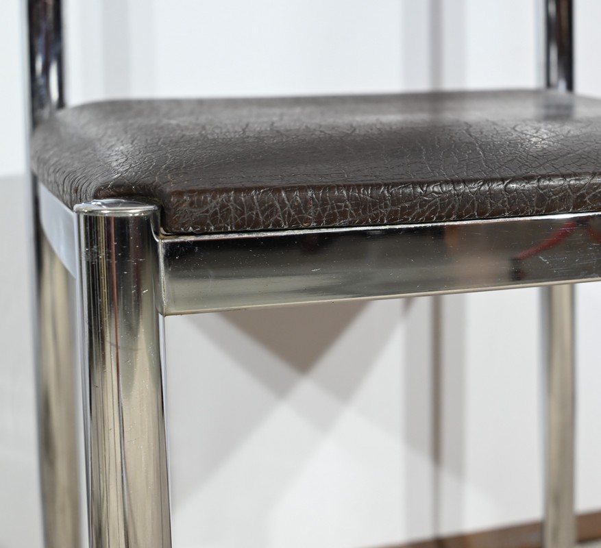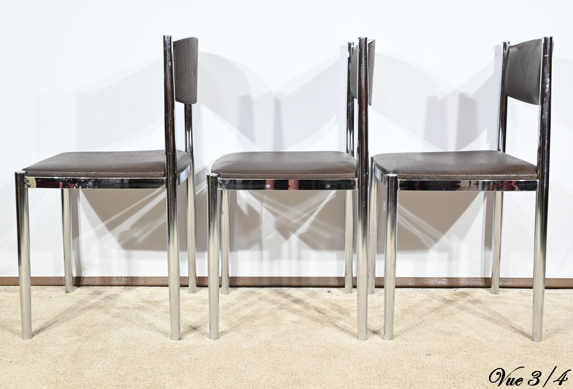 Suite de trois chaises, à ossatures métalliques chromées, reposant chacune sur quatre pieds tubulaires.