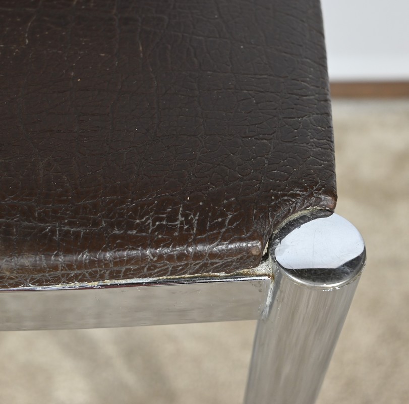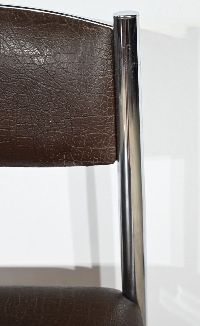 Ces chaises attribuées à la maison Collomb Création sont habillées d’un cuir marron en parfait état.