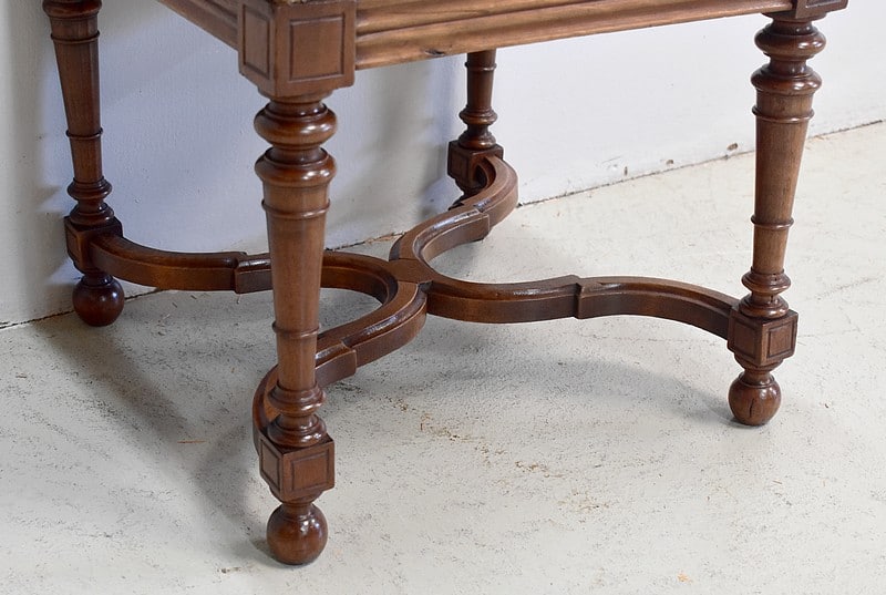 Il repose sur 4 pieds tournés, sculptés et moulurés, reliés d’une entretoise en X moulurée.