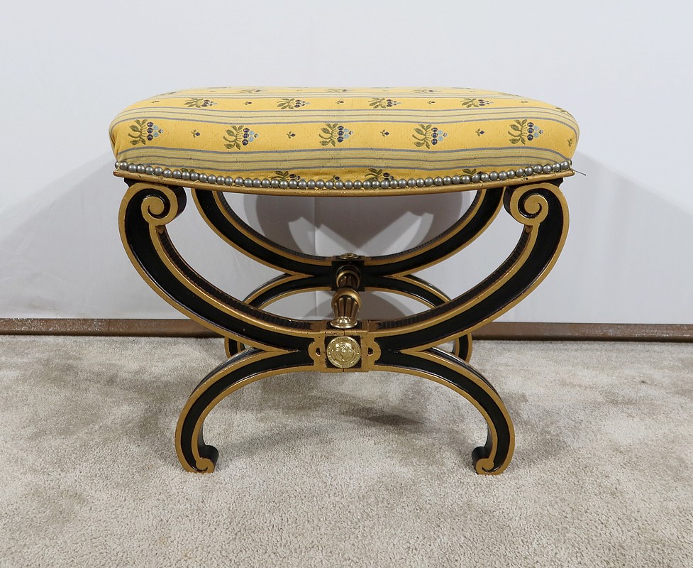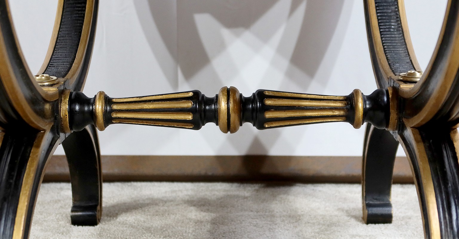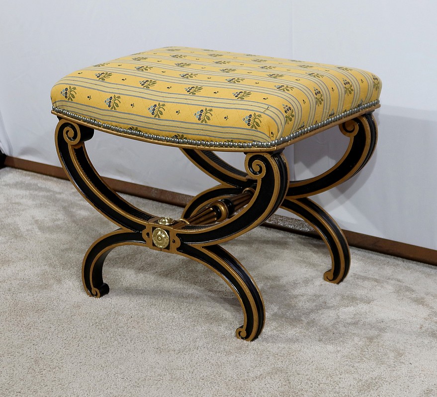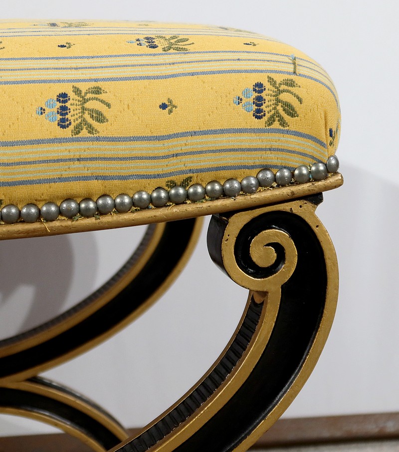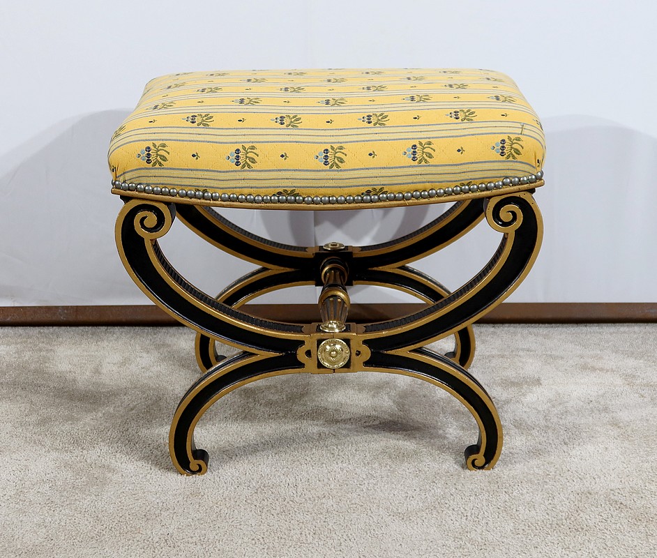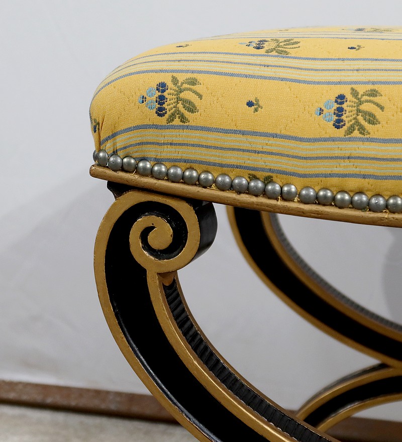 Charmant tabouret curule de style Napoléon III en bois noirci orné de dorure. Celui-ci s’inspire des meubles de l’antiquité romaine. On retrouve le piétement en X à volutes sur chacune des façades. Celles-ci sont agrémentées d’une rosace en bronze au centre et sur le dessus. La structure de ce siège stable est renforcée par une entretoise centrale sculptée de cannelures. L’assise de ce petit mobilier, solidement équerré, est traditionnelle (sangles et crin) et habillée d’un beau tissu jaune aux motifs floraux en excellent état.
