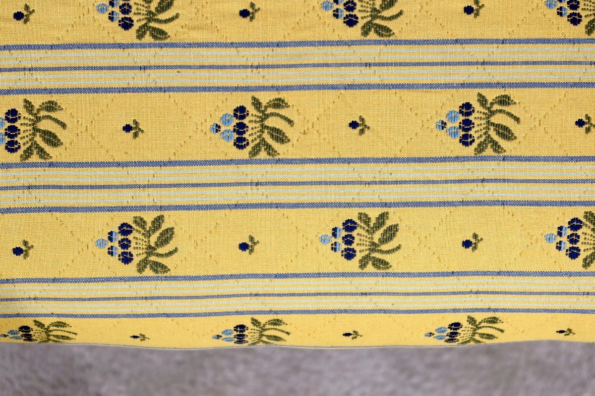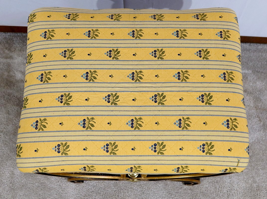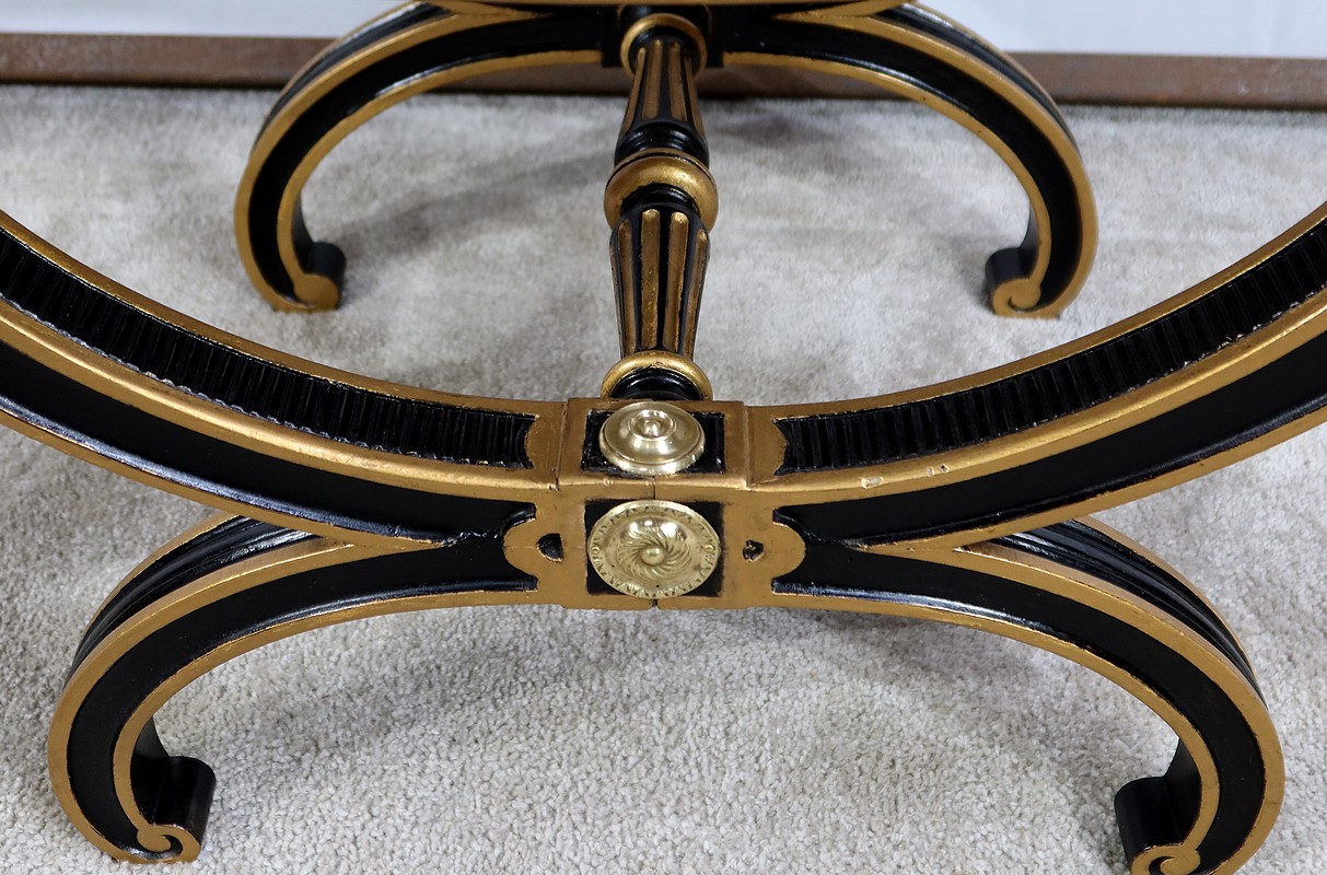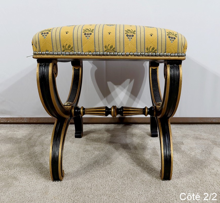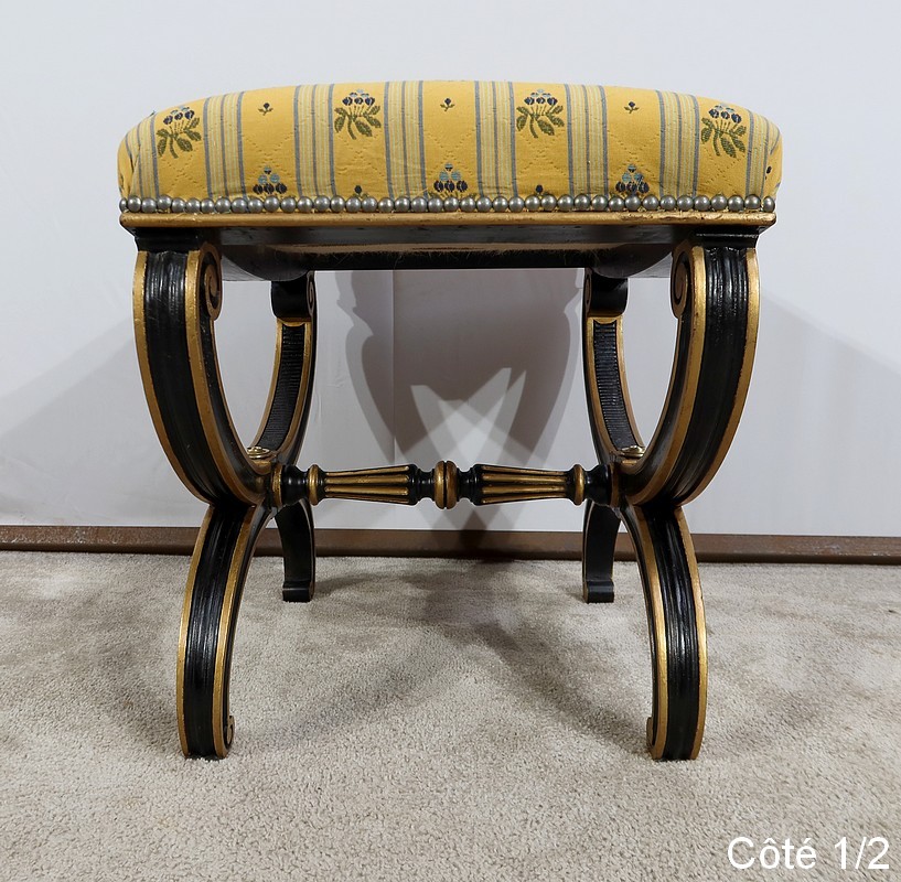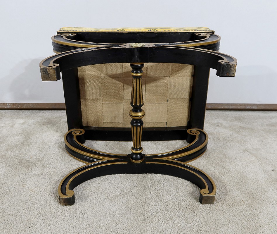 Charmant tabouret curule de style Napoléon III en bois noirci orné de dorure. Celui-ci s’inspire des meubles de l’antiquité romaine. On retrouve le piétement en X à volutes sur chacune des façades. Celles-ci sont agrémentées d’une rosace en bronze au centre et sur le dessus. La structure de ce siège stable est renforcée par une entretoise centrale sculptée de cannelures. L’assise de ce petit mobilier, solidement équerré, est traditionnelle (sangles et crin) et habillée d’un beau tissu jaune aux motifs floraux en excellent état.