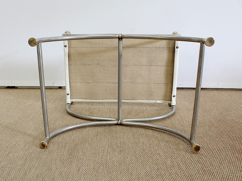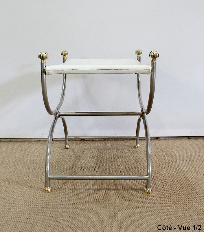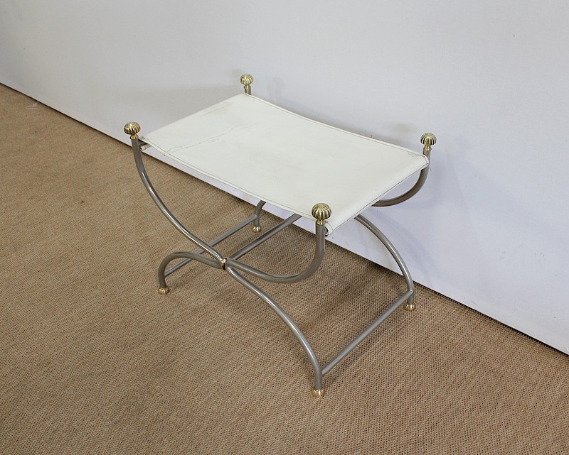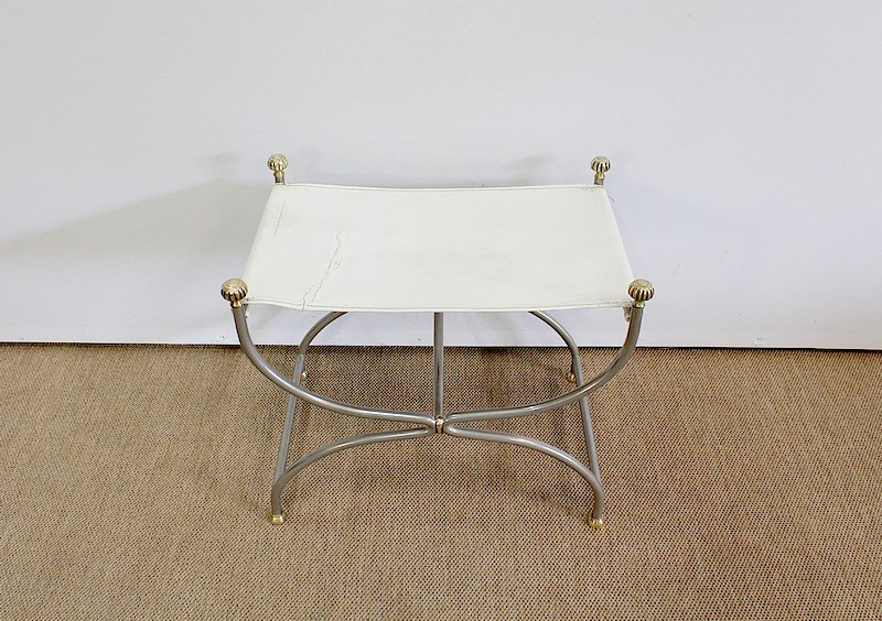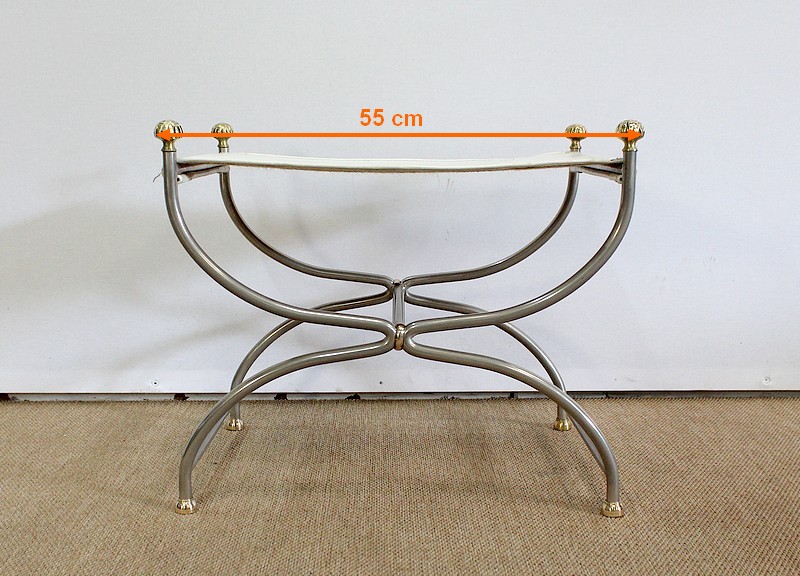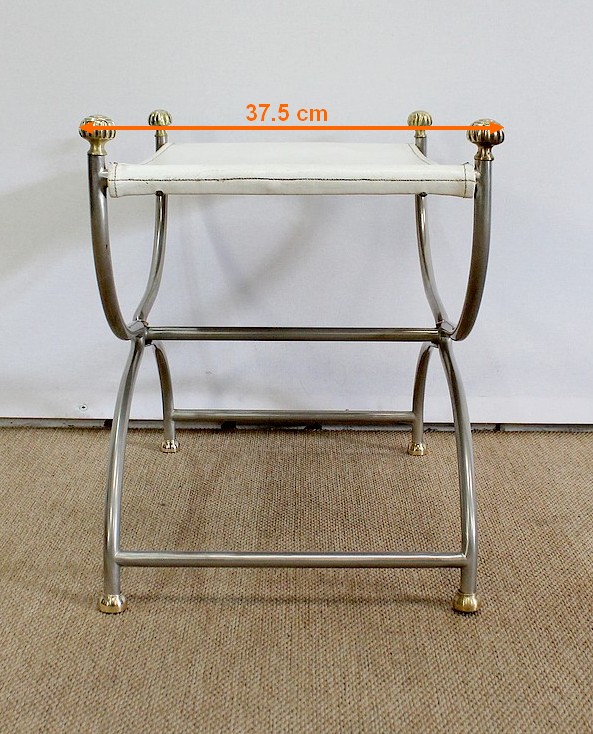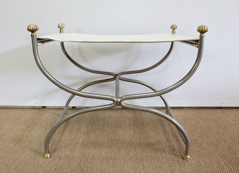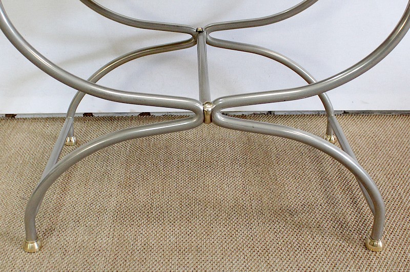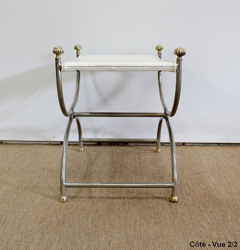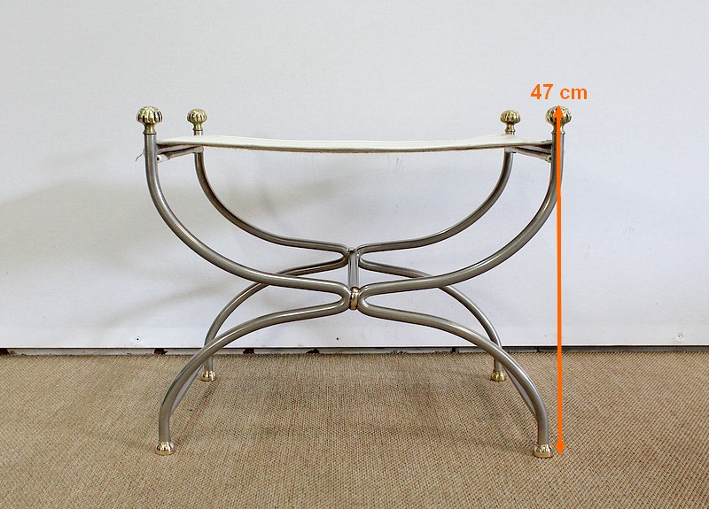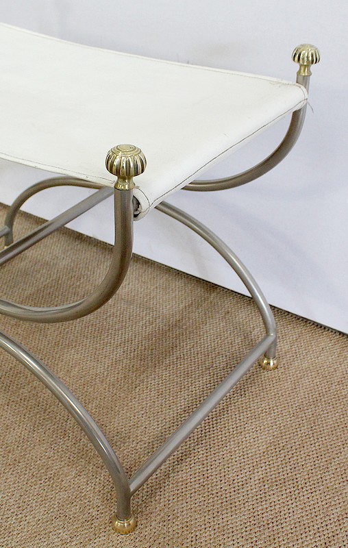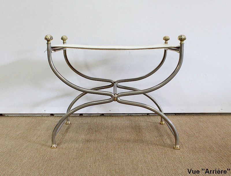 Siège Rectangulaire composé d’un Piétement en Acier poli formant un croisillon en façade, complété par quatre pommeaux et quatre patins en Bronze Doré.