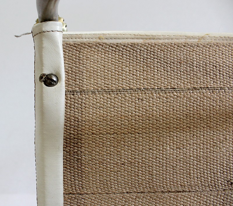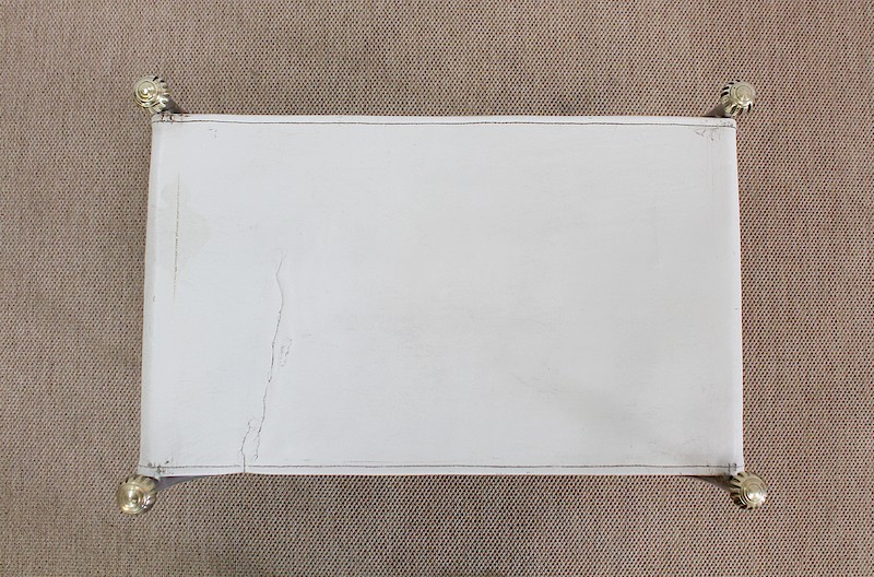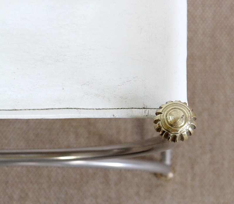 Cette forme de X s’arrête au niveau de l’assise, constituée d’un Cuir Blanc piqué et tendu entre chaque côté de la structure. Ce Cuir d’Origine a été réparé et renforcé par des sangles de tapissier dans notre atelier de restauration.