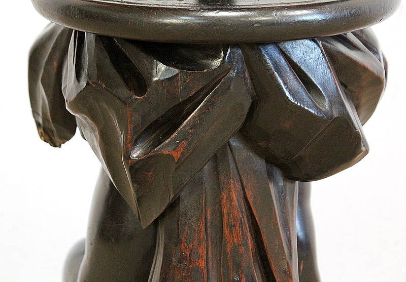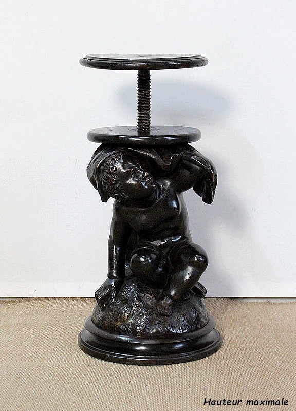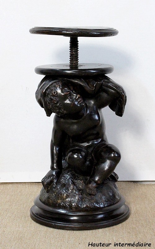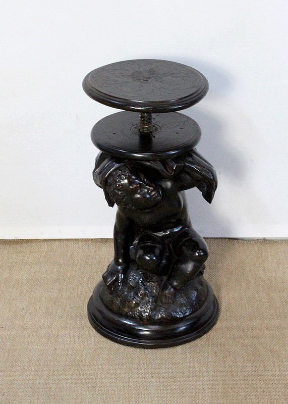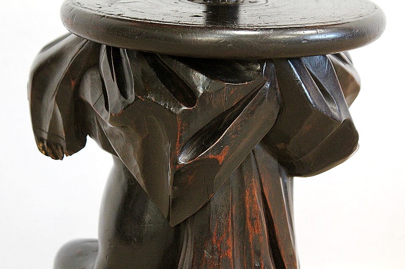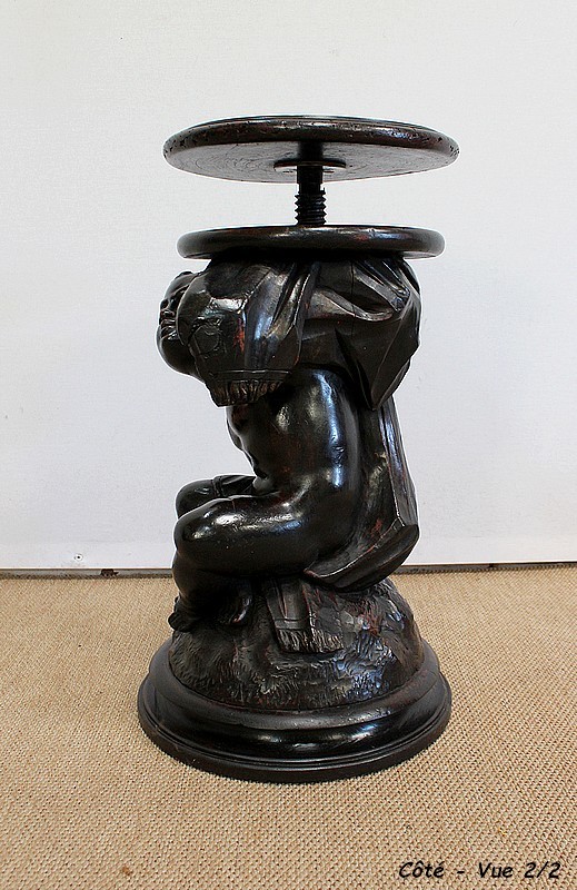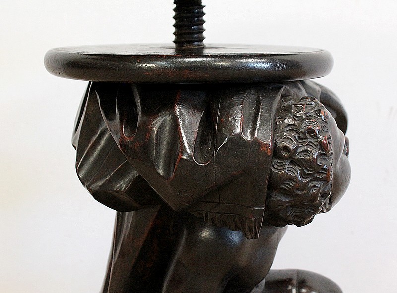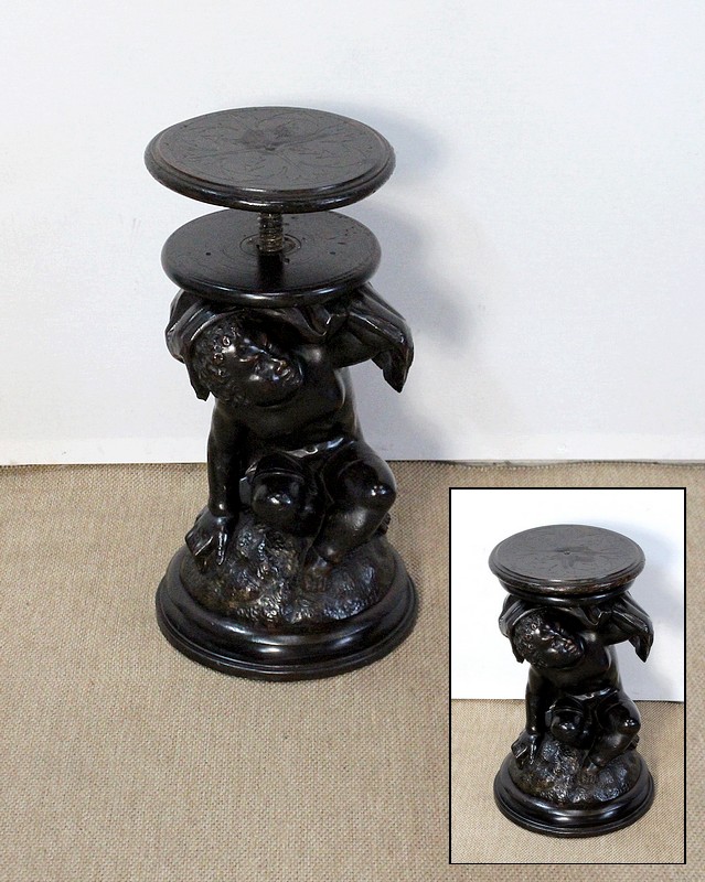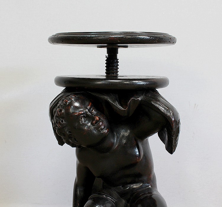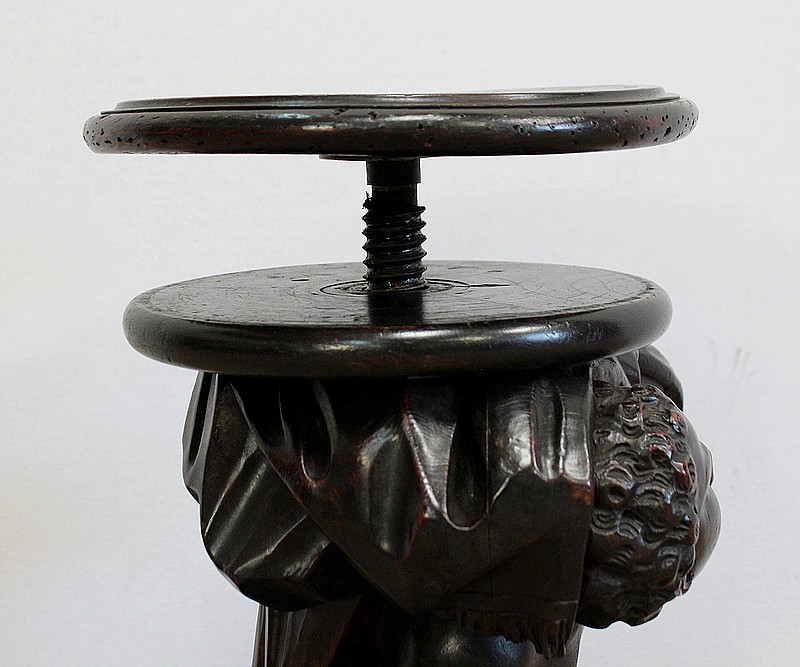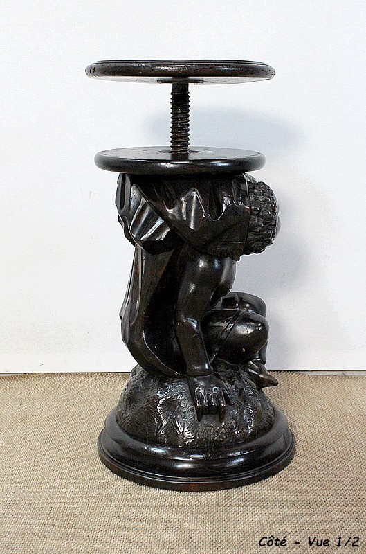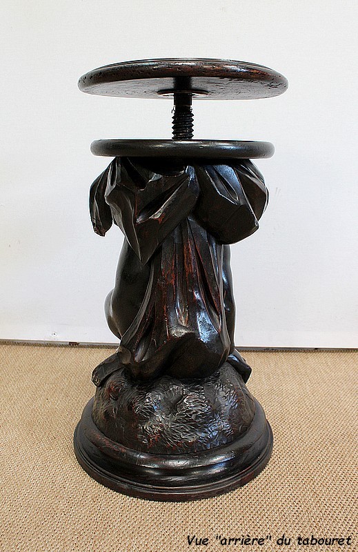 Un jeune servant, assis en tailleur, constitue le corps de ce tabouret, dans lequel s’insère une tige à filetage, pour régler la hauteur d’assise. Sa main droite, posée sur la base, le maintien et l’équilibre. Le garçon couvert d’une cape à franges sur sa tête et son dos, soutient sur son épaule gauche le dessus du siège.