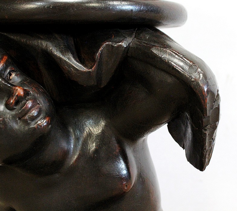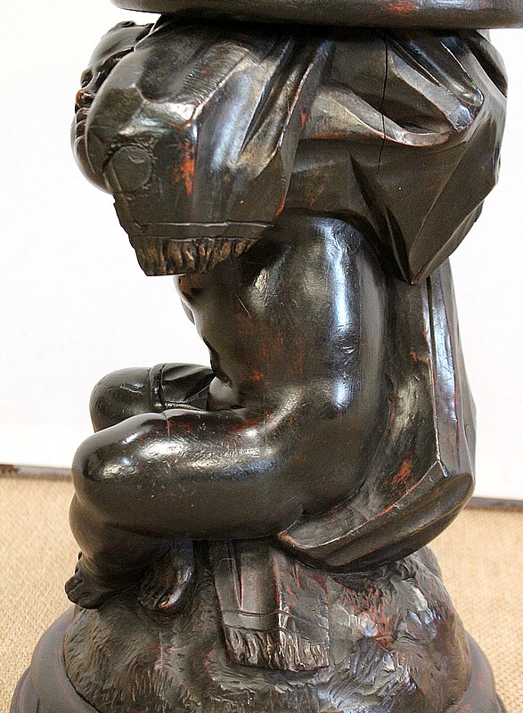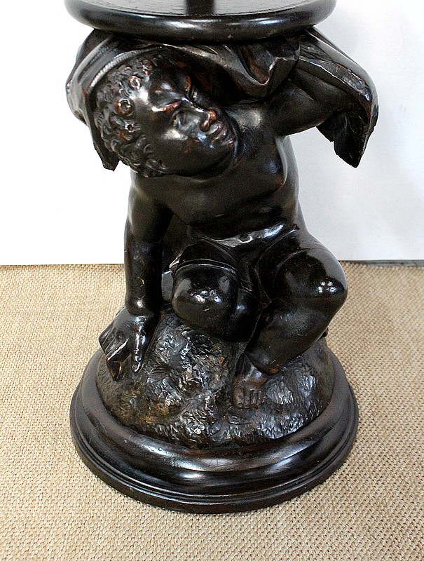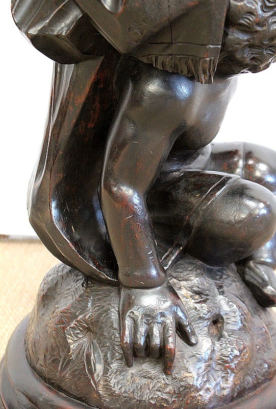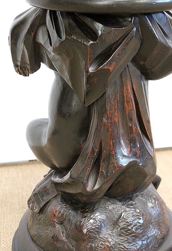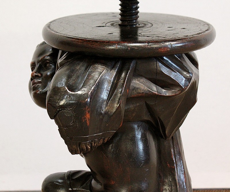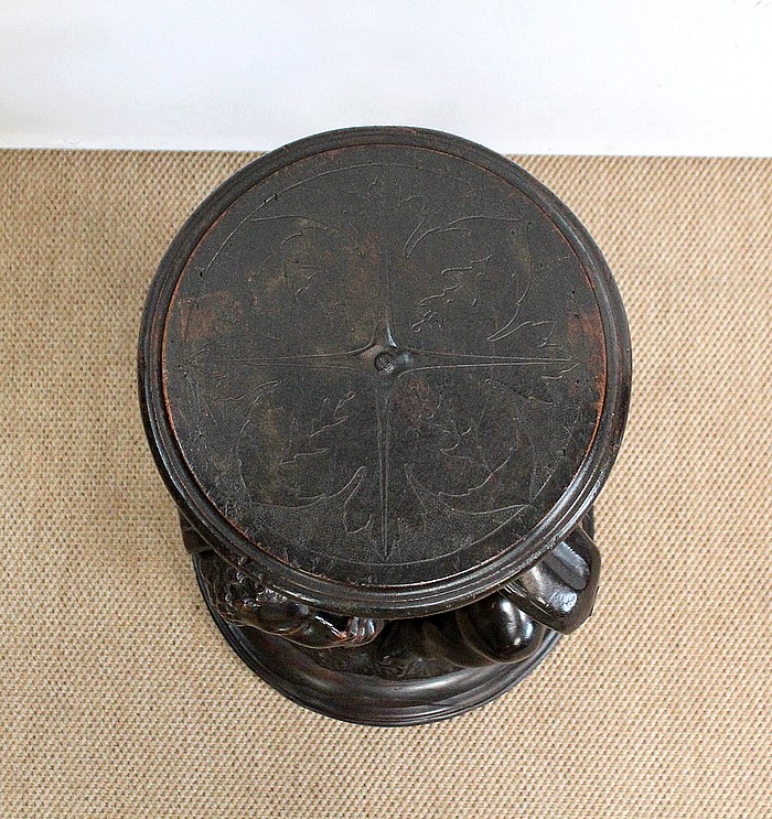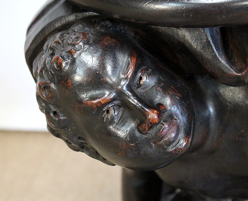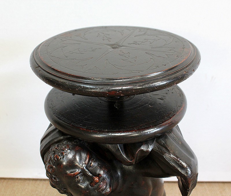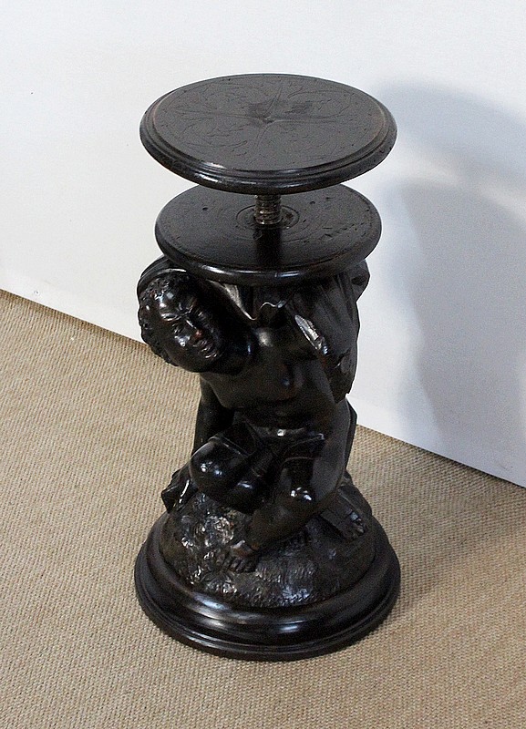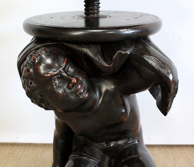 Un jeune servant, assis en tailleur, constitue le corps de ce tabouret, dans lequel s’insère une tige à filetage, pour régler la hauteur d’assise. Sa main droite, posée sur la base, le maintien et l’équilibre. Le garçon couvert d’une cape à franges sur sa tête et son dos, soutient sur son épaule gauche le dessus du siège.