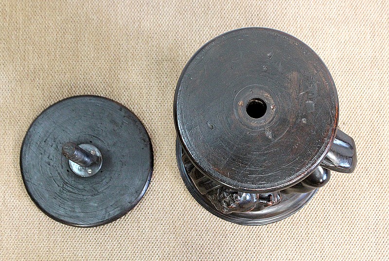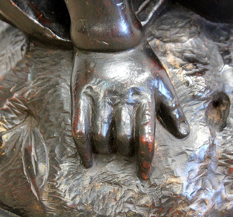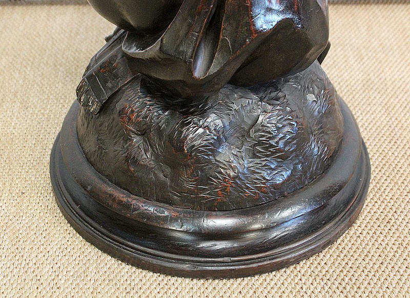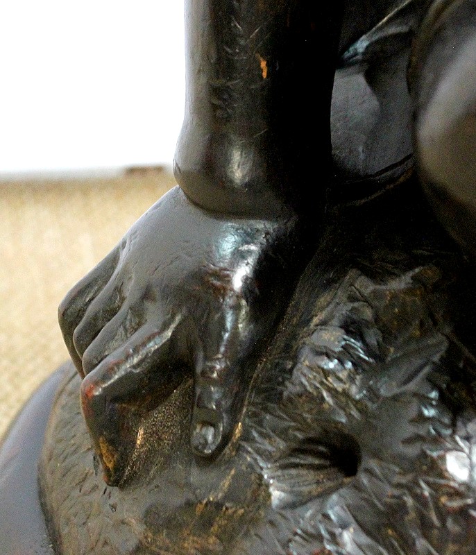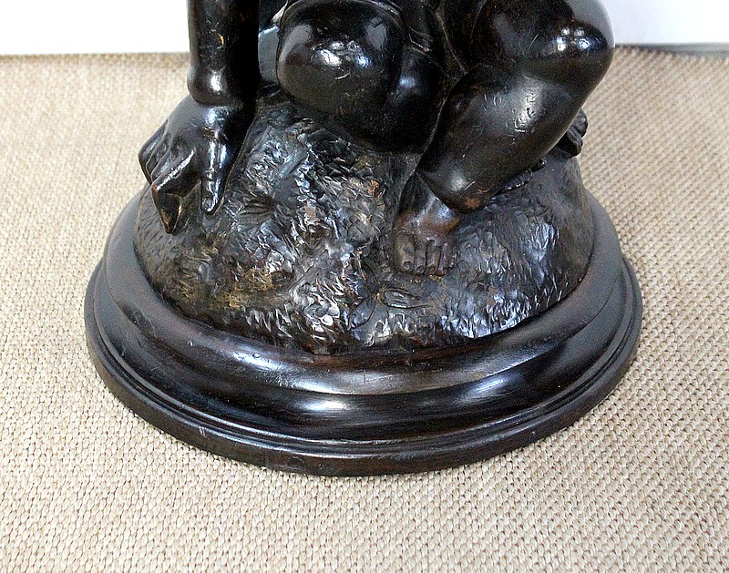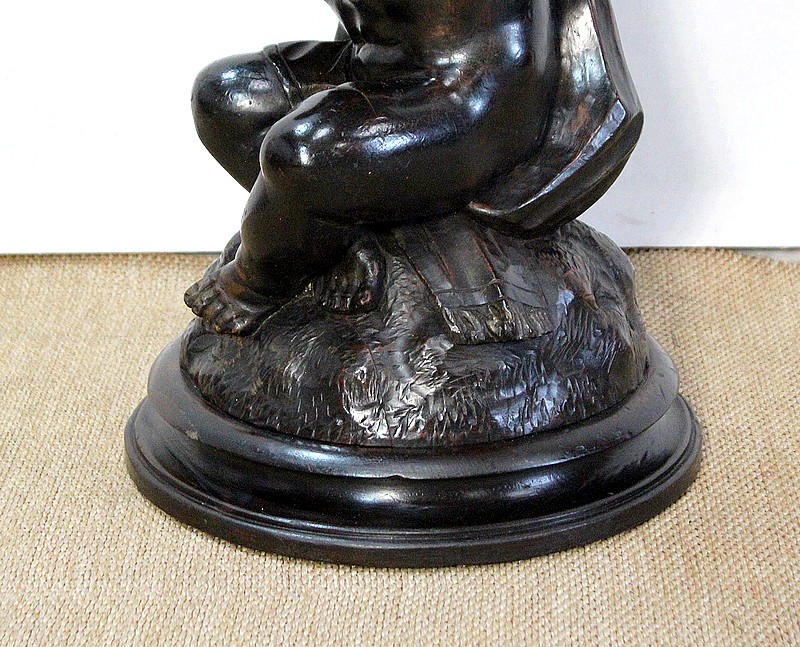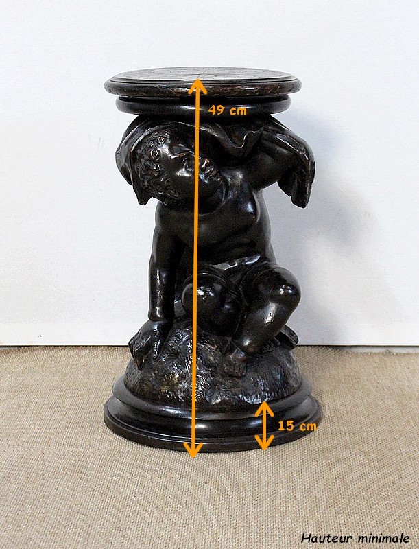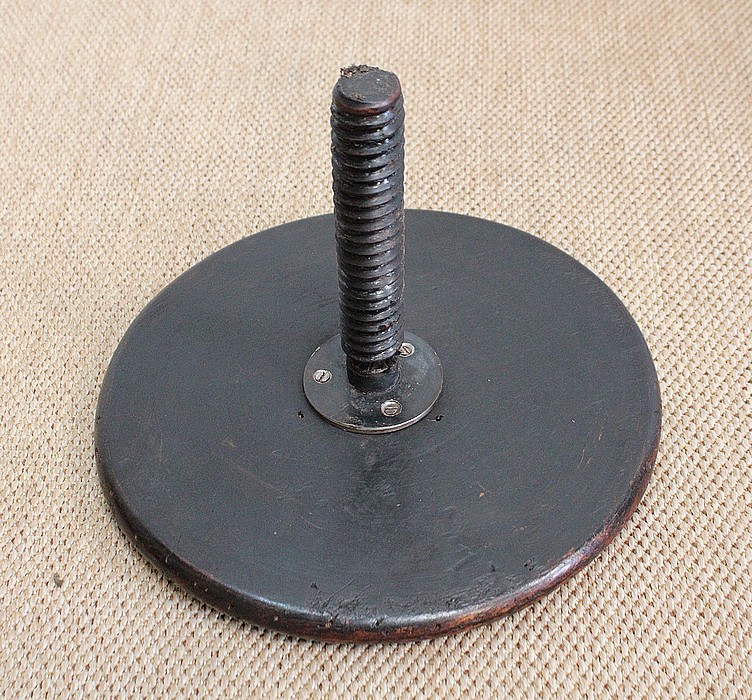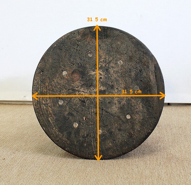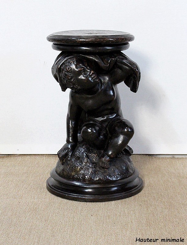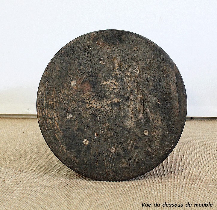 Un jeune servant, assis en tailleur, constitue le corps de ce tabouret, dans lequel s’insère une tige à filetage, pour régler la hauteur d’assise. Sa main droite, posée sur la base, le maintien et l’équilibre. Le garçon couvert d’une cape à franges sur sa tête et son dos, soutient sur son épaule gauche le dessus du siège.