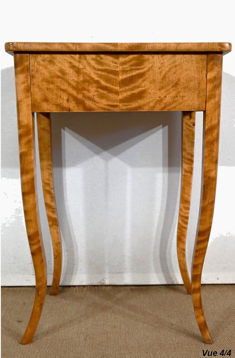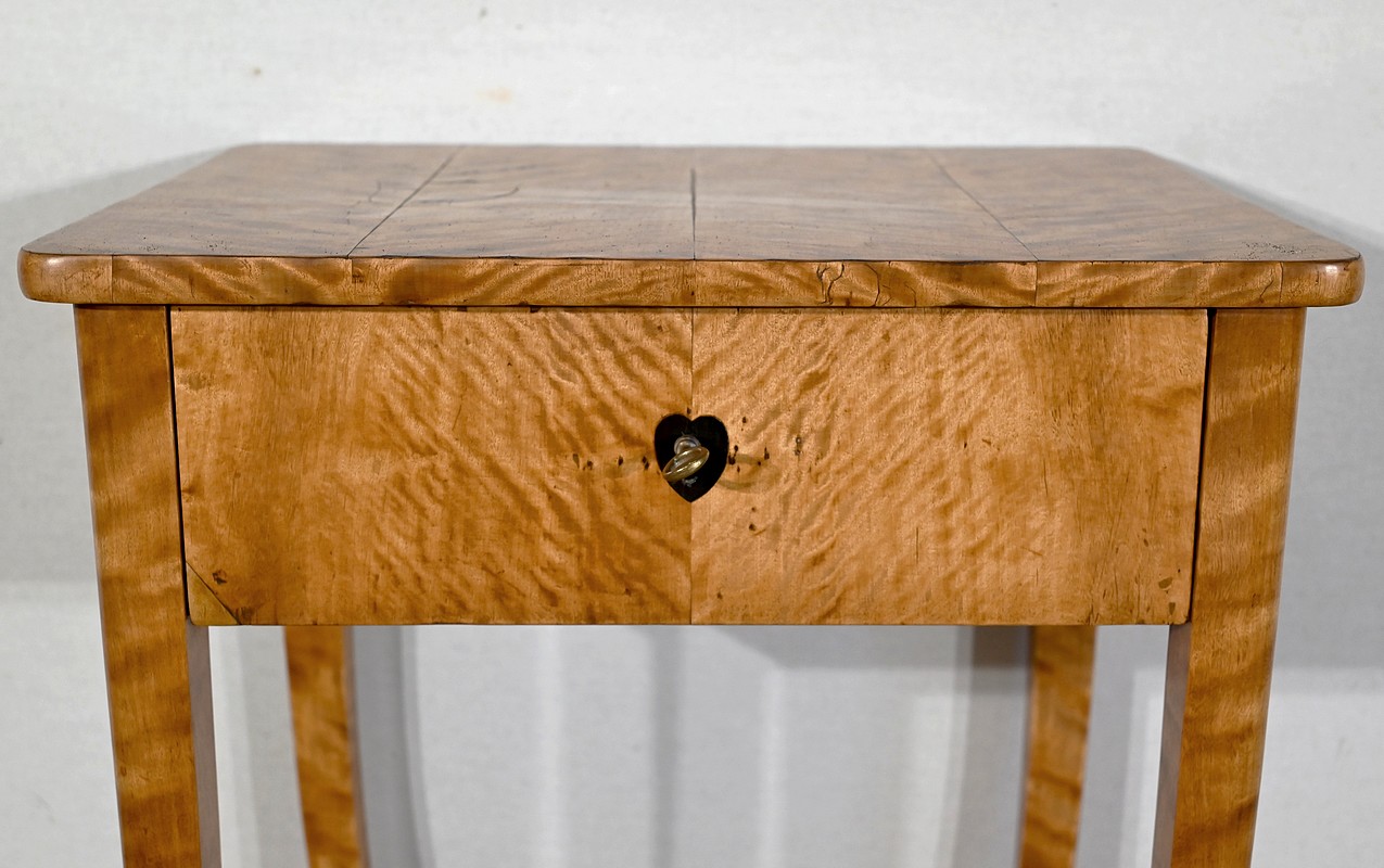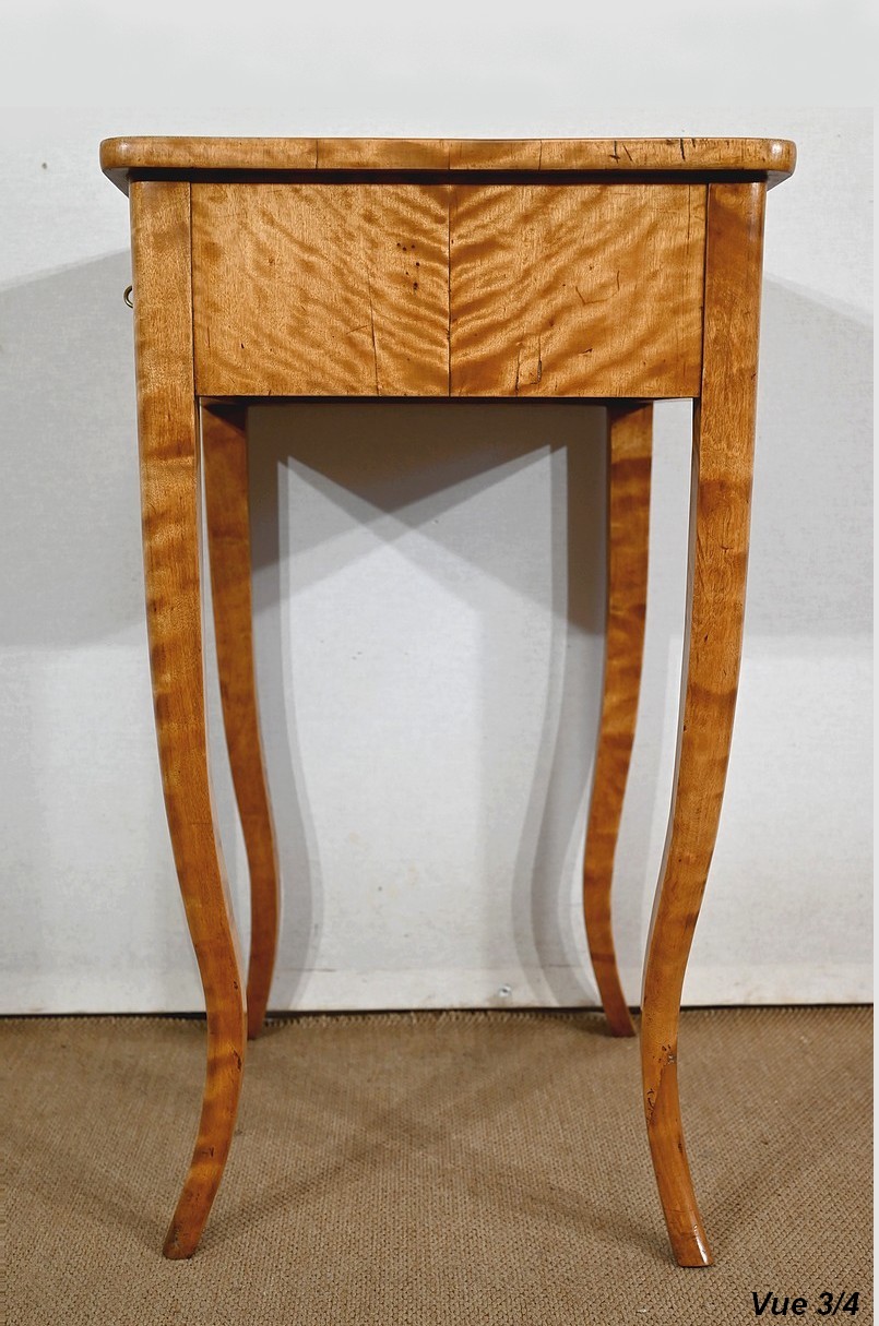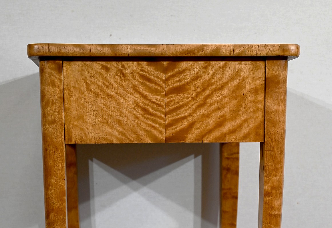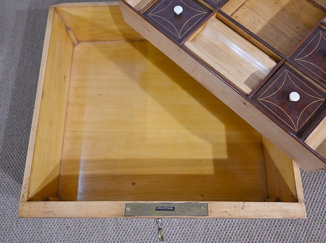 Travailleuse en placage de bois clair de Ceylan dont le plateau est composé de quatre frises symétriques.