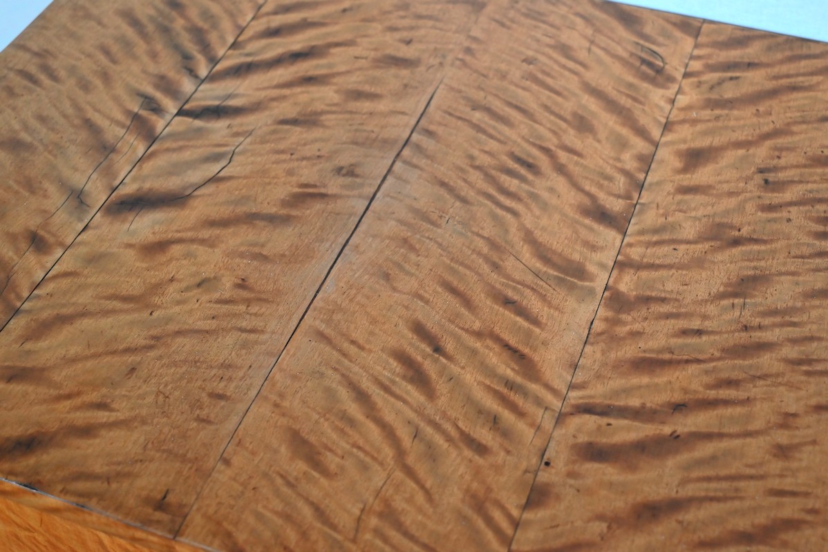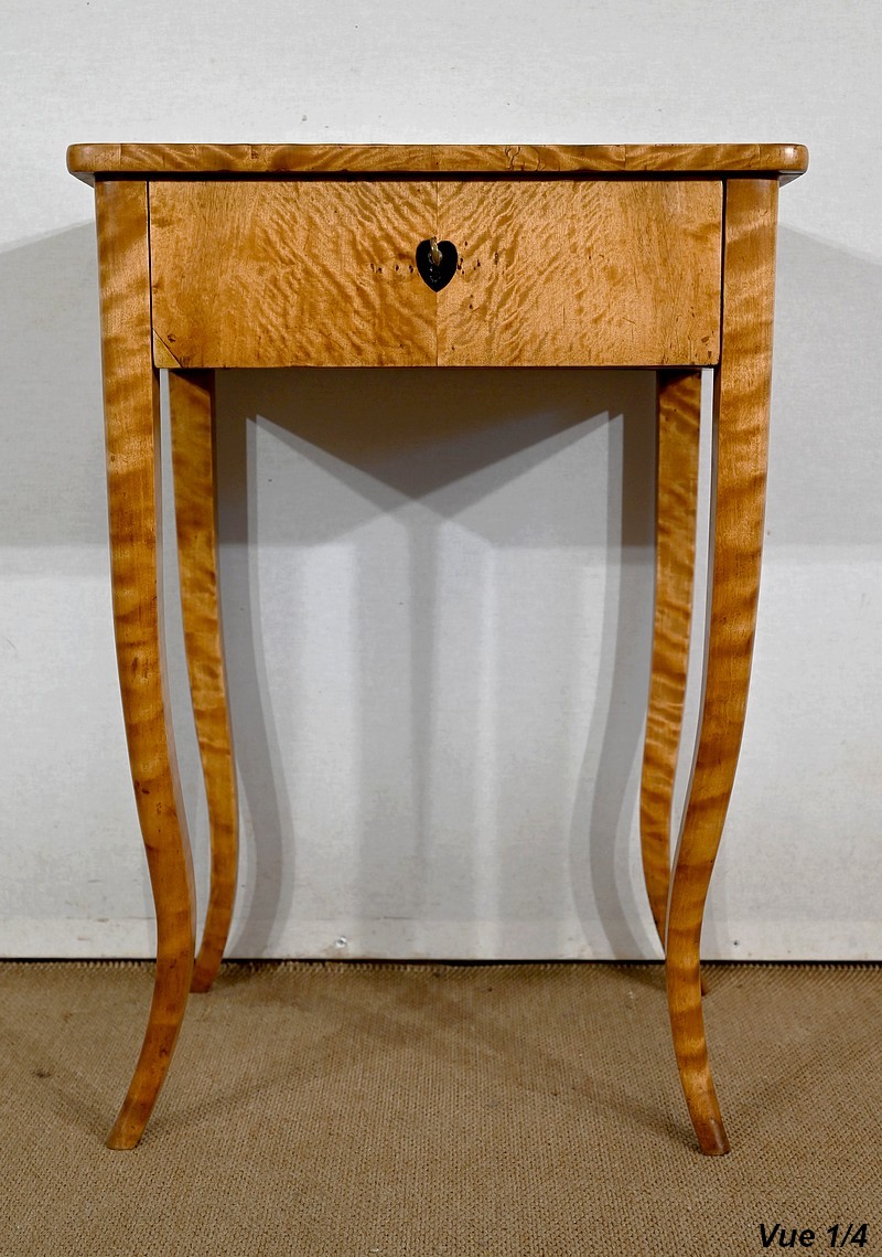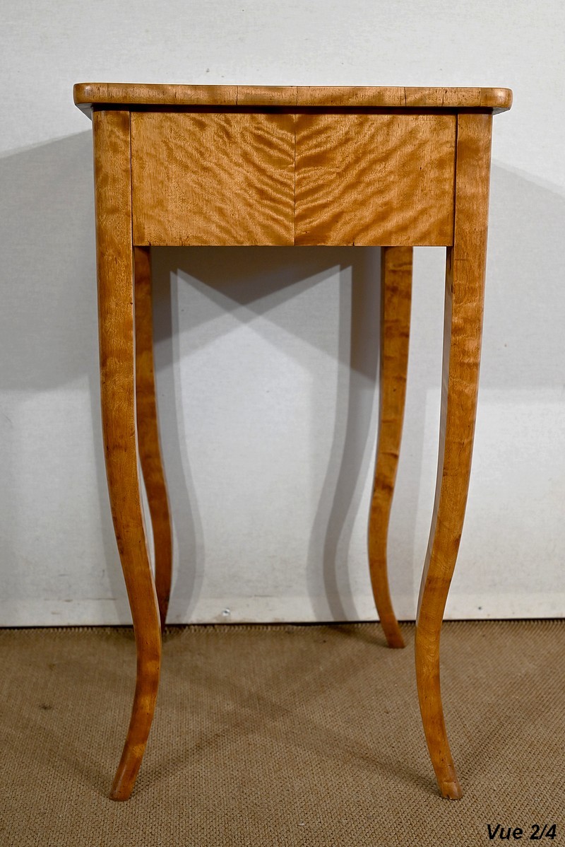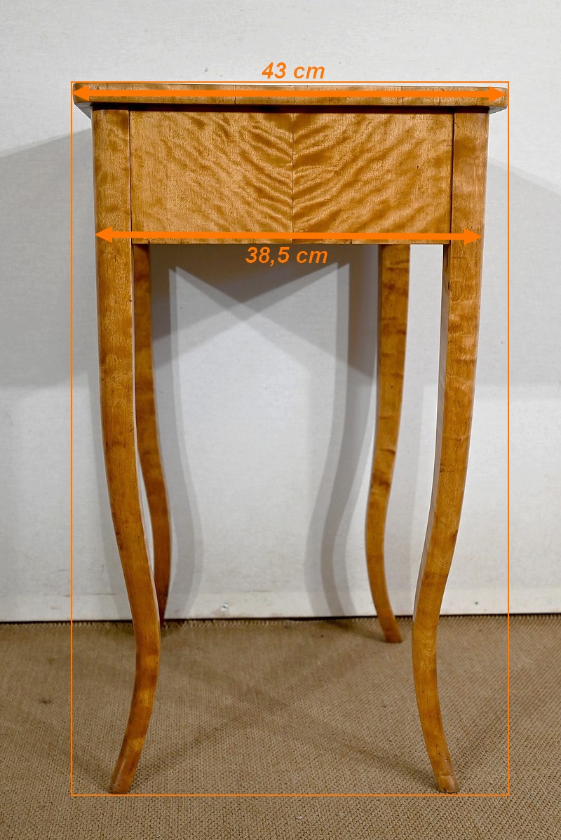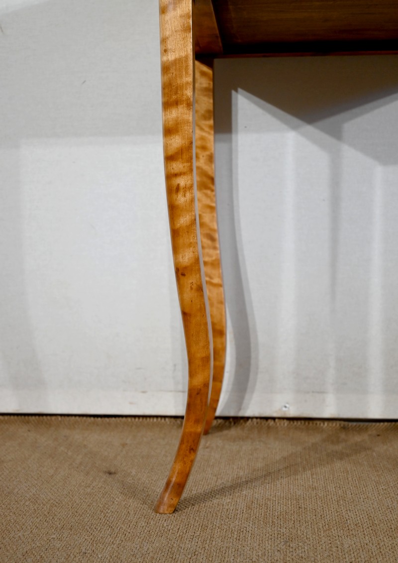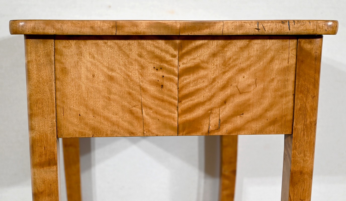 Travailleuse en placage de bois clair de Ceylan dont le plateau est composé de quatre frises symétriques.