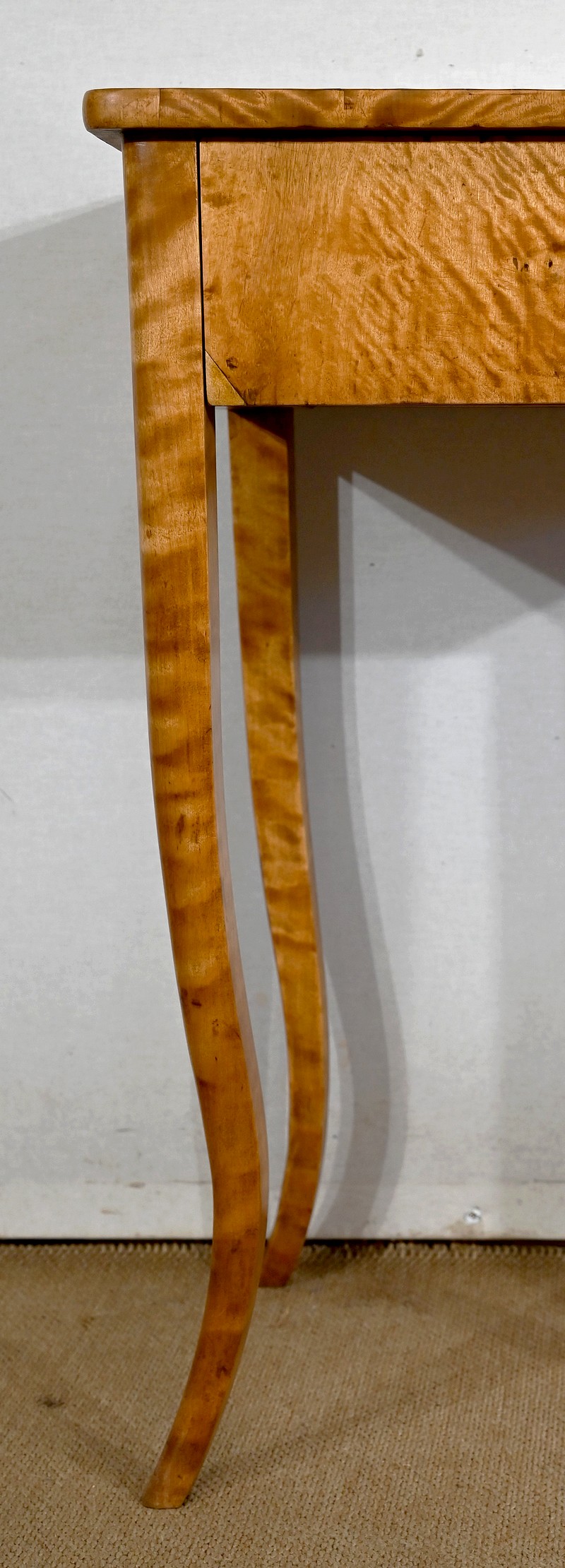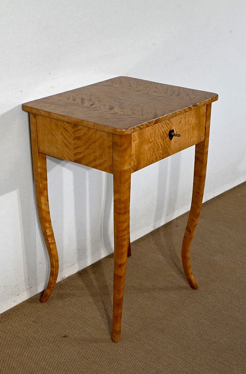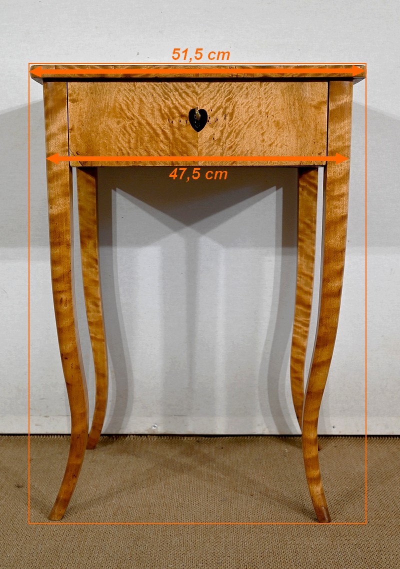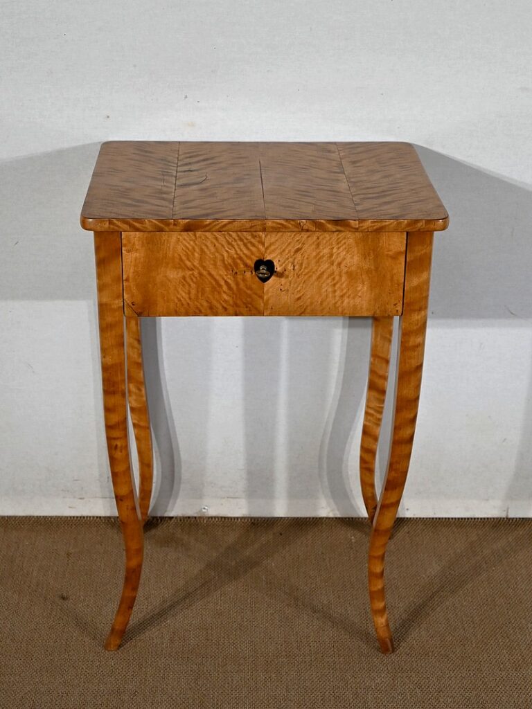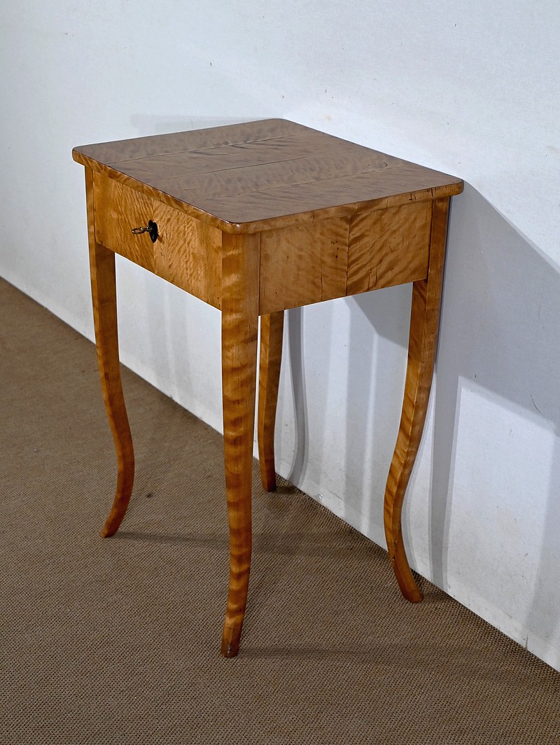 Travailleuse en placage de bois clair de Ceylan dont le plateau est composé de quatre frises symétriques.