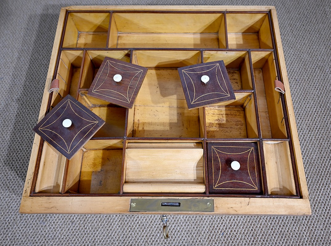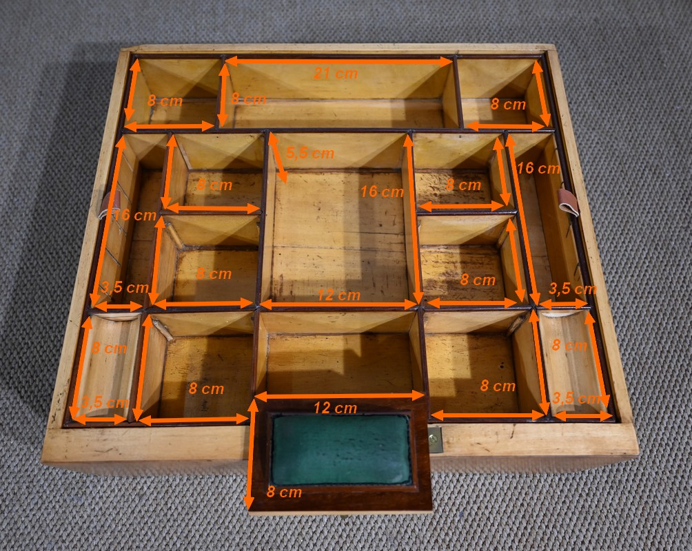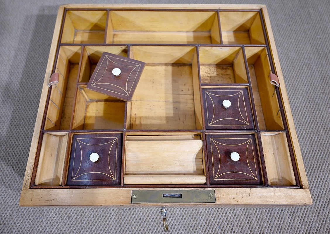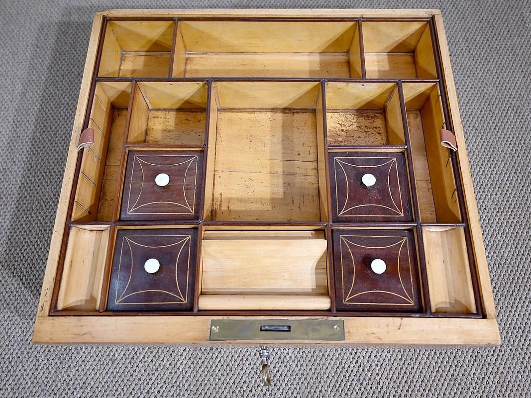 L’intérieur, en citronnier, offre quinze compartiments, dont quatre sont fermés par des couvercles en acajou, avec incrustations de citronnier et boutons en os. Le logement frontal se bascule, révélant un coussin à aiguilles.