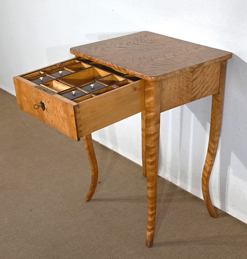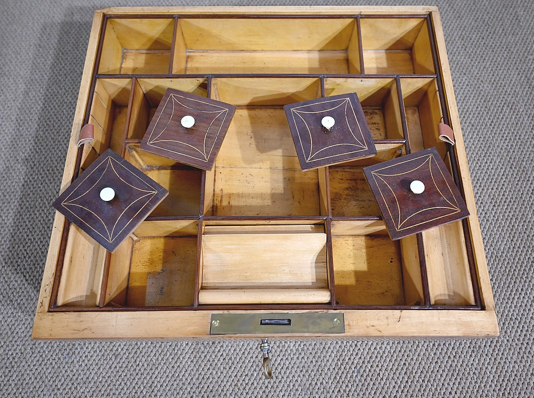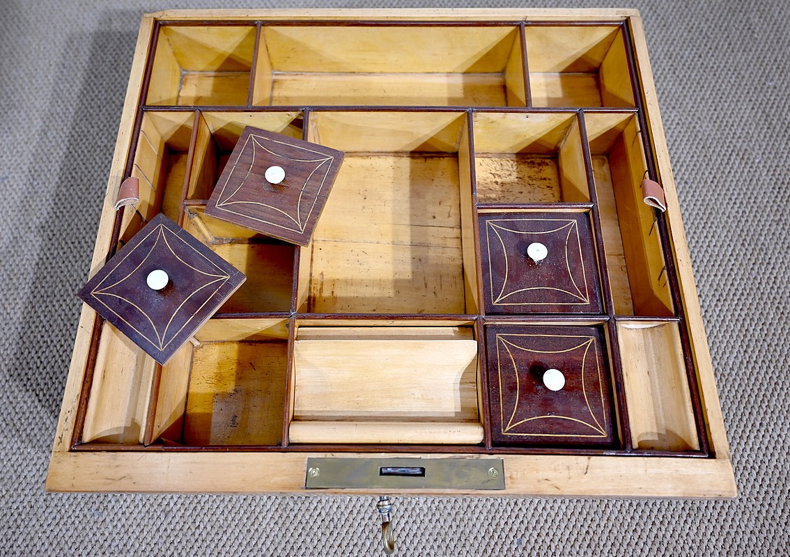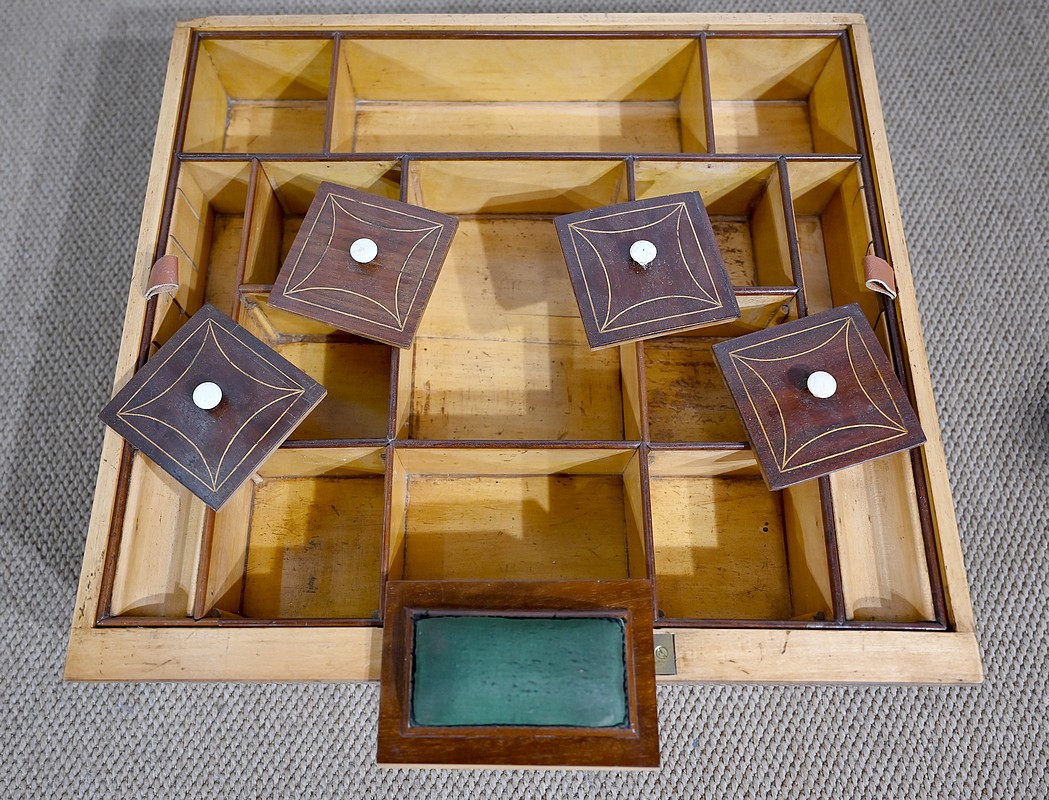 L’intérieur, en citronnier, offre quinze compartiments, dont quatre sont fermés par des couvercles en acajou, avec incrustations de citronnier et boutons en os. Le logement frontal se bascule, révélant un coussin à aiguilles.