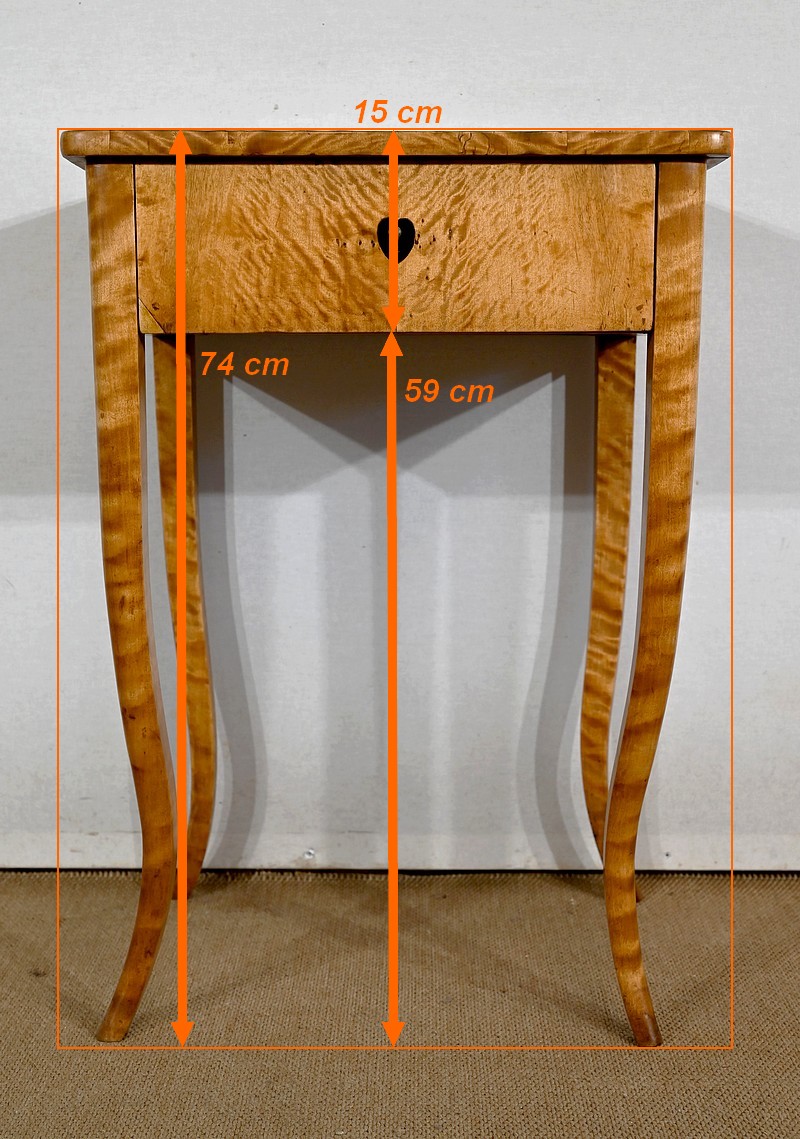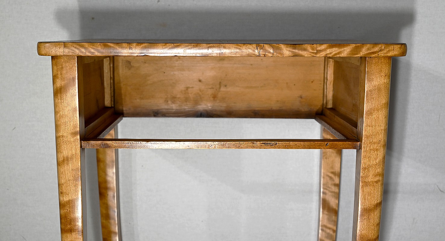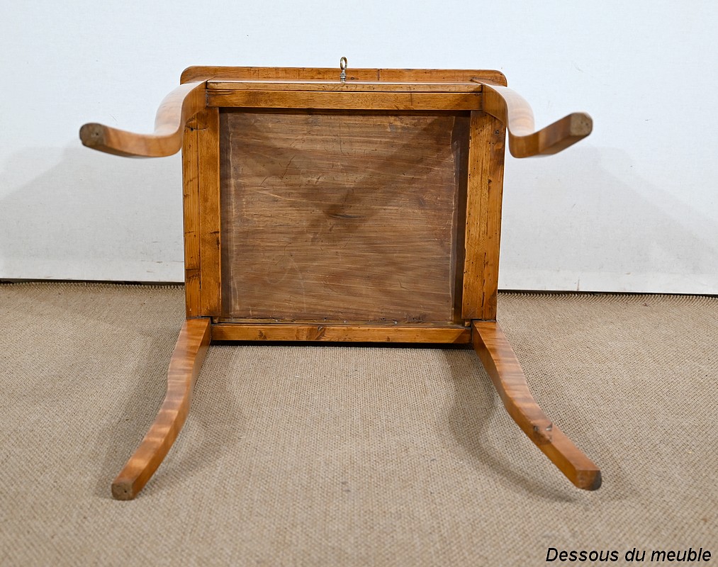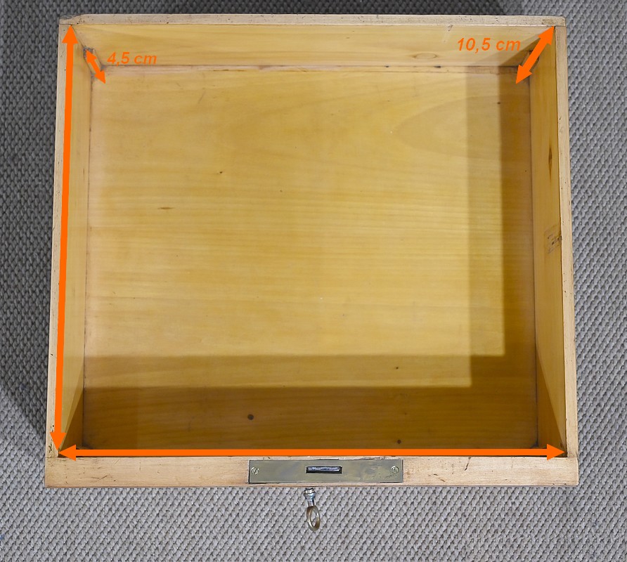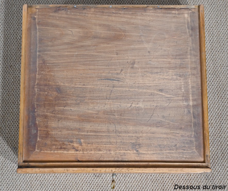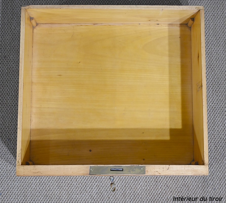 On retrouve en façade un tiroir en placage vertical, équipé d’une serrure d’origine avec sa clé et entrée en palissandre incrustée.